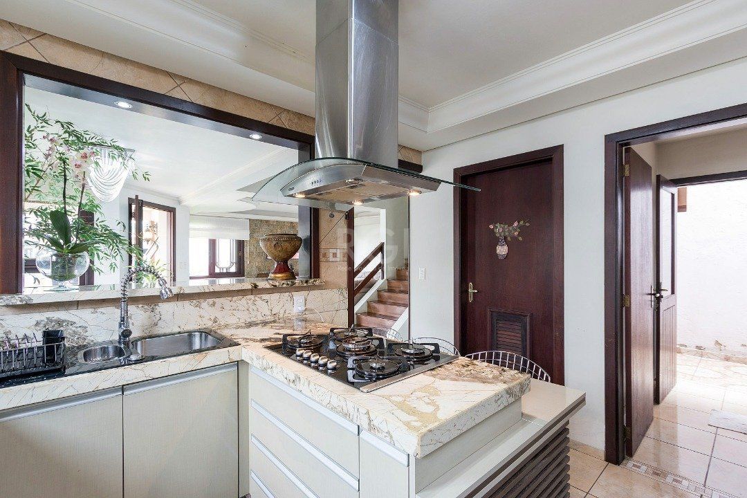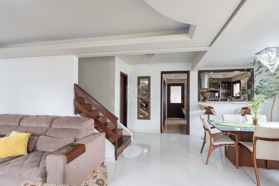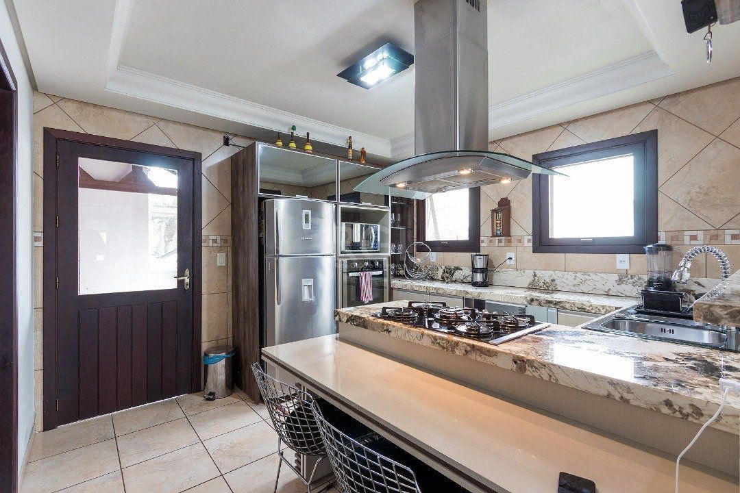 Living amplo em dois ambientes com uma parede de destaque com lareira, lavabo, cozinha com ilha, despensa, área de serviço, pátio com churrasqueira coberta.