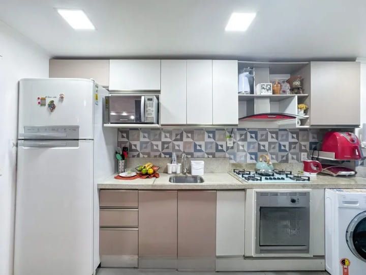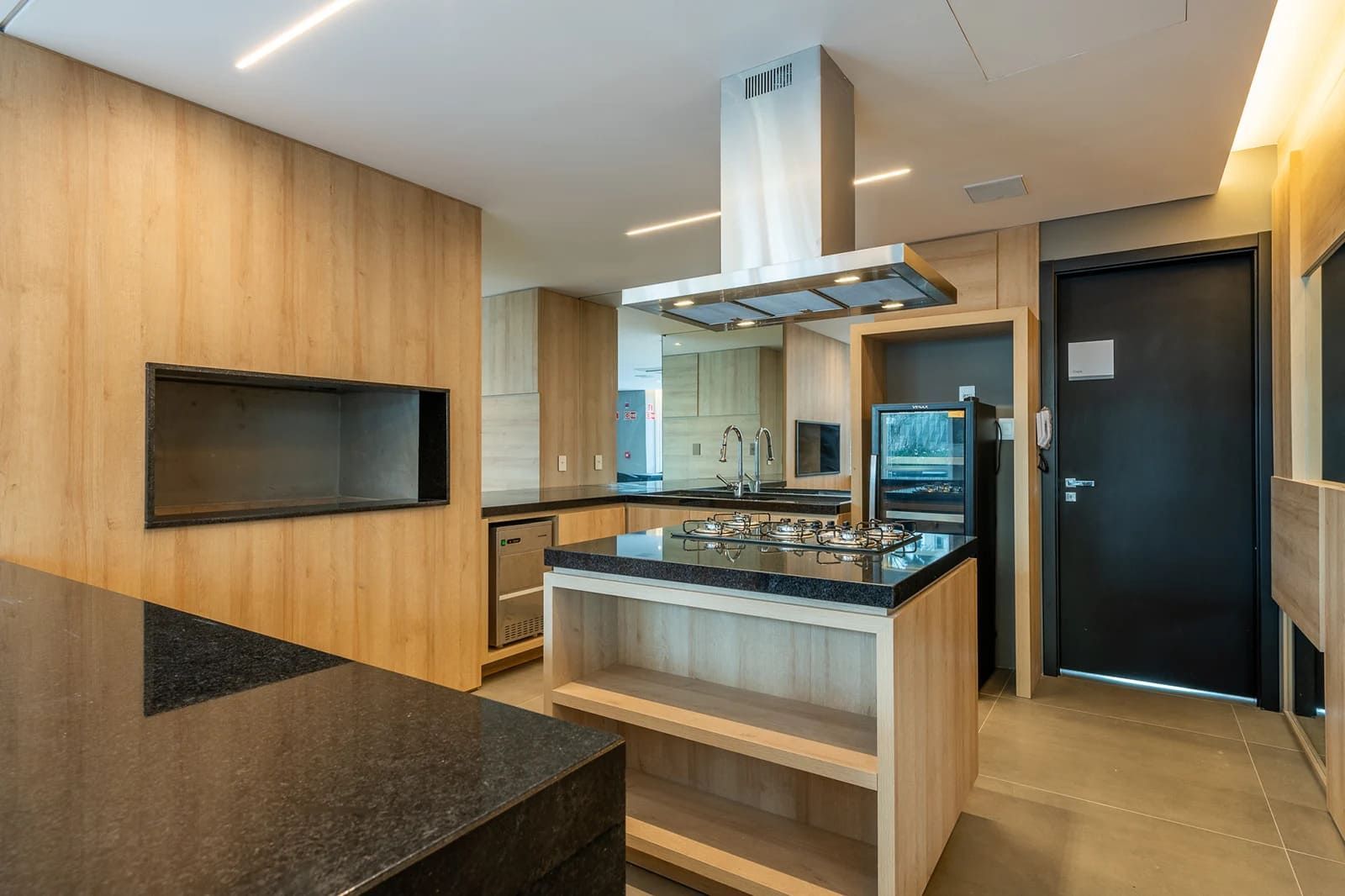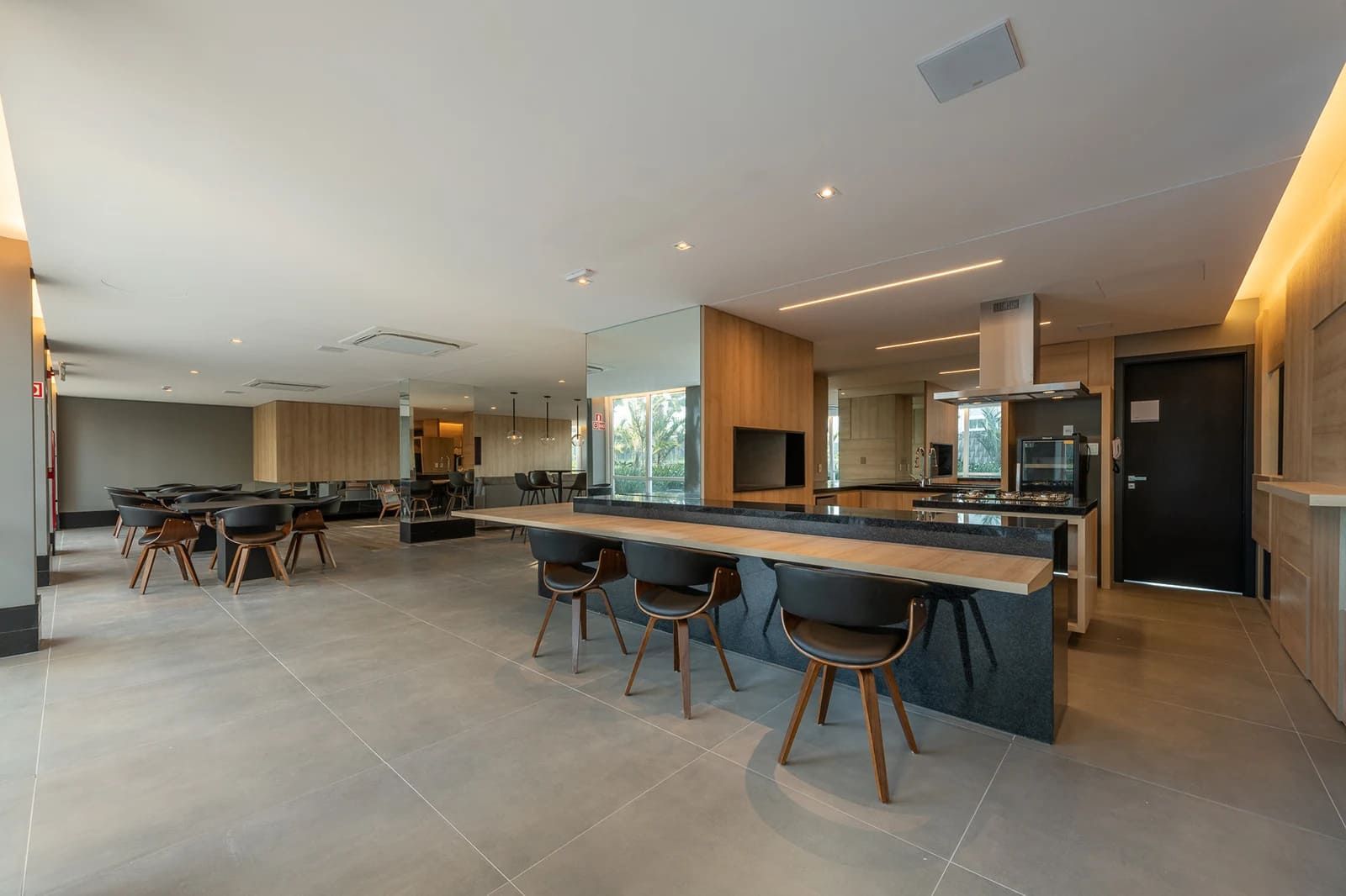 Apartamento 03 dormitórios, transformado em 02, fácil reversão, (uma suíte); piso laminado, cozinha americana equipada com forno, fogão cooktop e depurador; sala com 02 ambientes estar e jantar; banheiros com armários e box de vidro; ar condicionado SPLIT. 02 Vagas de garagem. Infraestrutura completa.