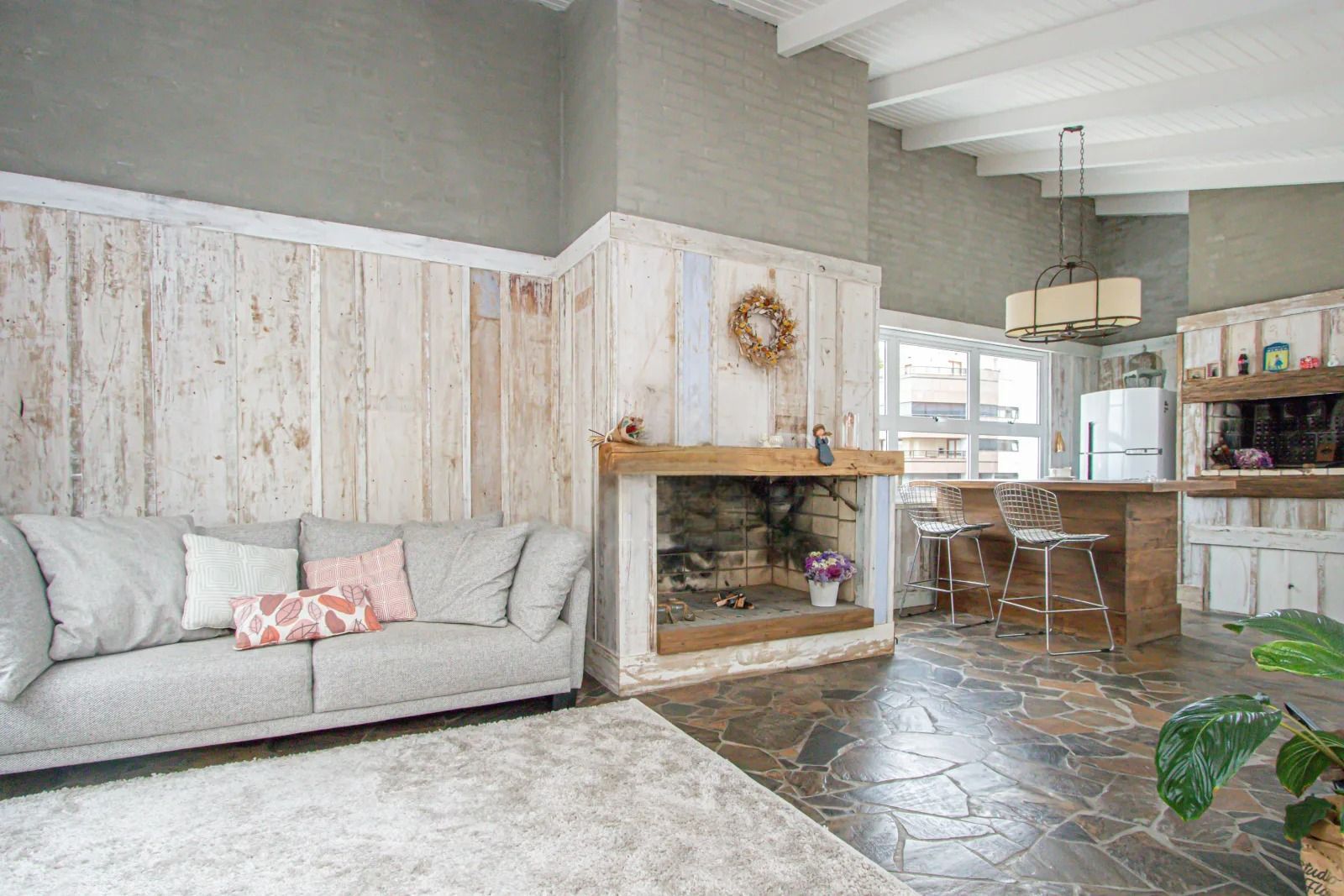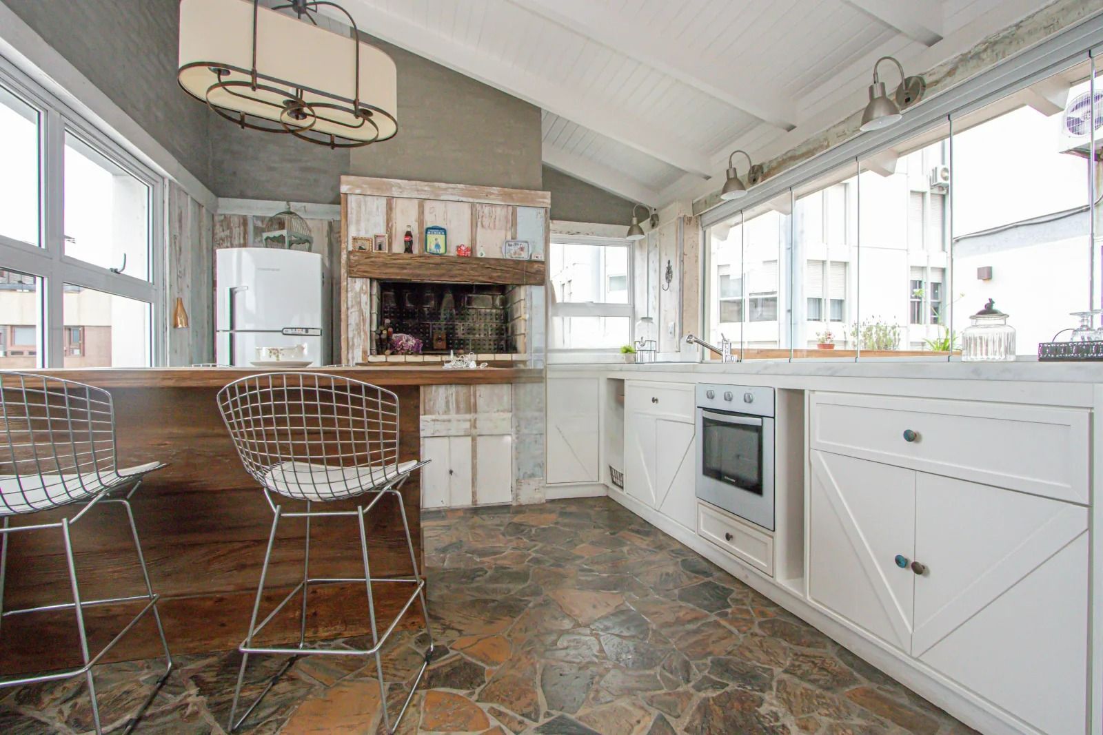 No terraço há dois ambientes, um externo e outro fechado com lareira e linda área Gourmet.