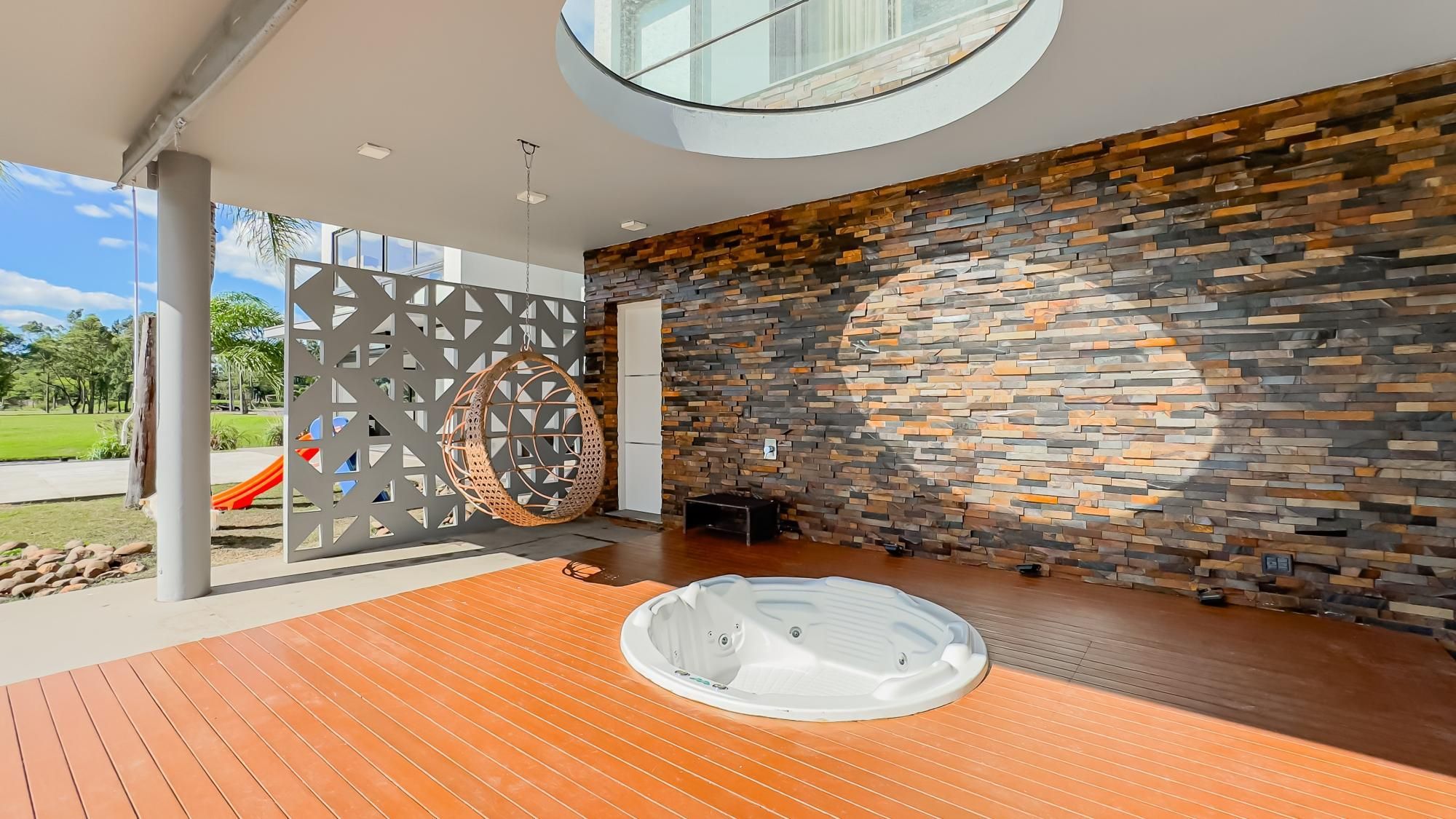 Em um terreno de 1.279,00m² circundado por um lago, a Casa do Lago foi projetada buscando antes de tudo integrar-se a esta linda paisagem. A casa é formada por um volume principal de dois pavimentos robusto, em alvenaria branca, pedra ferrugem e esquadrias pretas. Deste volume principal saem com leveza as lajes em balanço do pátio frontal e do pátio dos fundos. Estas lajes em balanço, apoiadas em pilares recuados de seção circular, são uma referência à arquitetura moderna brasileira. Reforçando este conceito está o cobogó, formando privacidade, efeito de luz e sombra e movimento nas fachadas laterais.Neste mesmo eixo dos cobogós a casa abriga garagem e bicicletário na parte voltada à frente, e na parte voltada ao pátio do fundo um espaço com hidromassagem, onde o desenho circular da banheira é repetido na iluminação zenital da laje de cobertura. Enquanto isso, o uso da pedra ferrugem como um dos elementos marcantes no volume principal da casa busca a rusticidade e aconchego que os moradores desejavam. Na área externa, a casa recebe um jardim que articula os diferentes usos e acessos da casa. O deck em madeira se transforma em trapiche e cria uma conexão direta da casa com o lago.