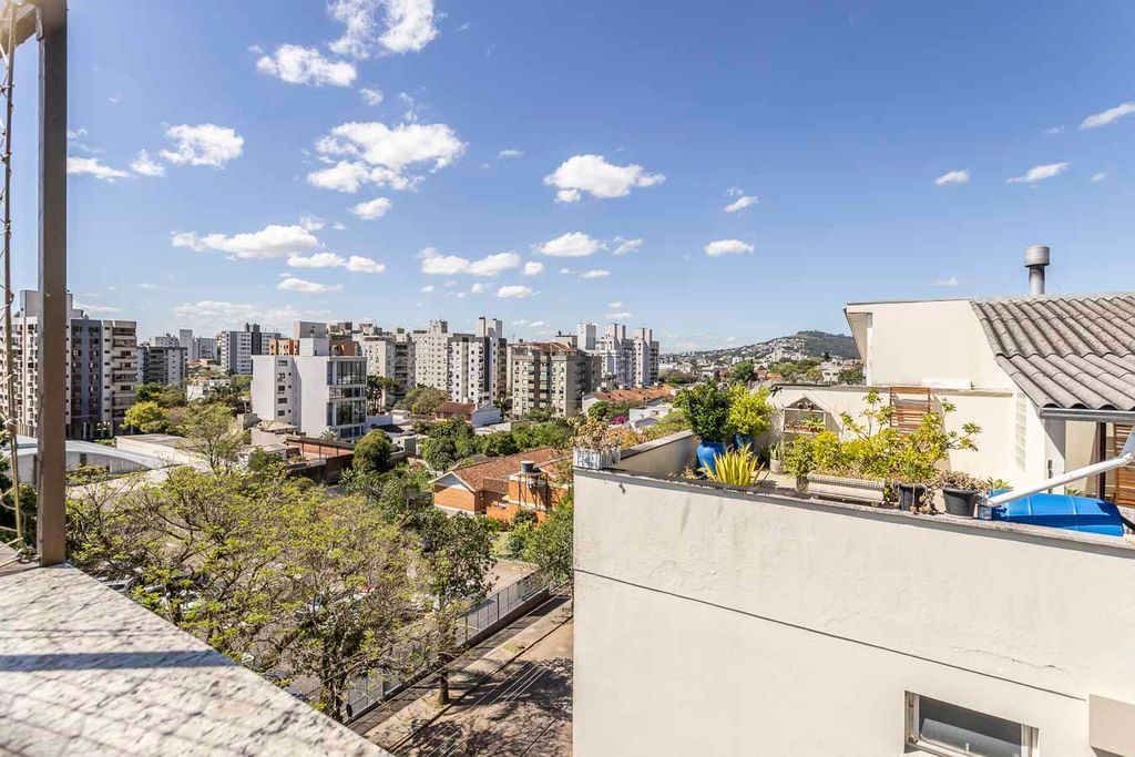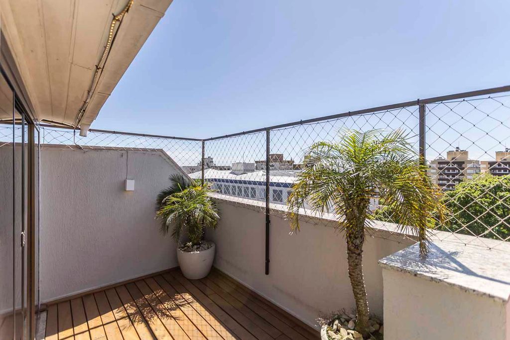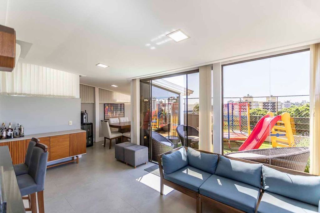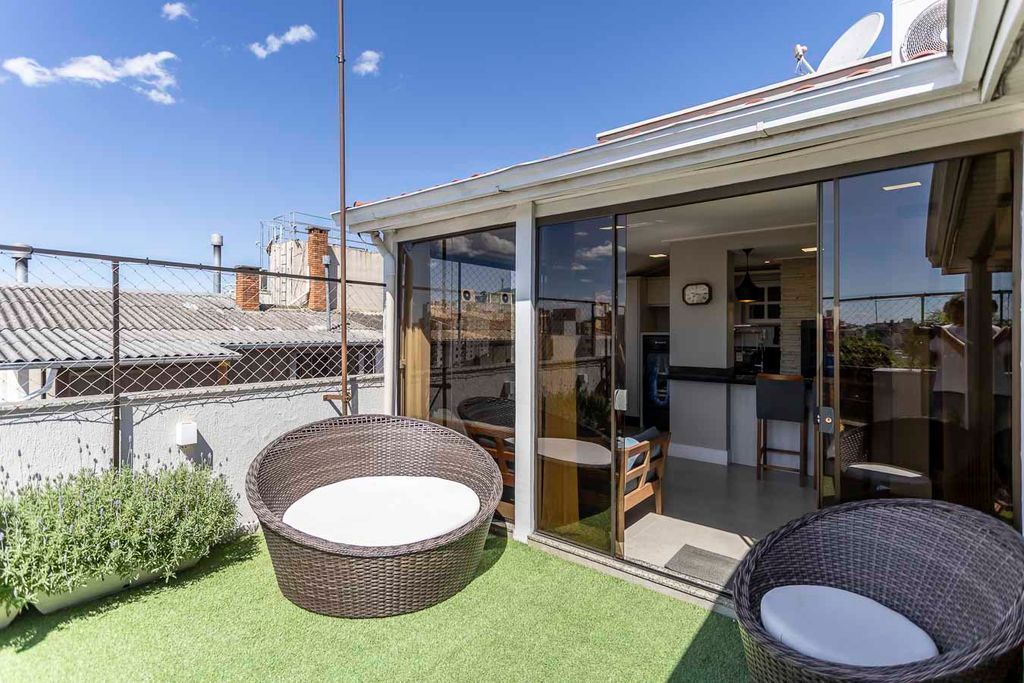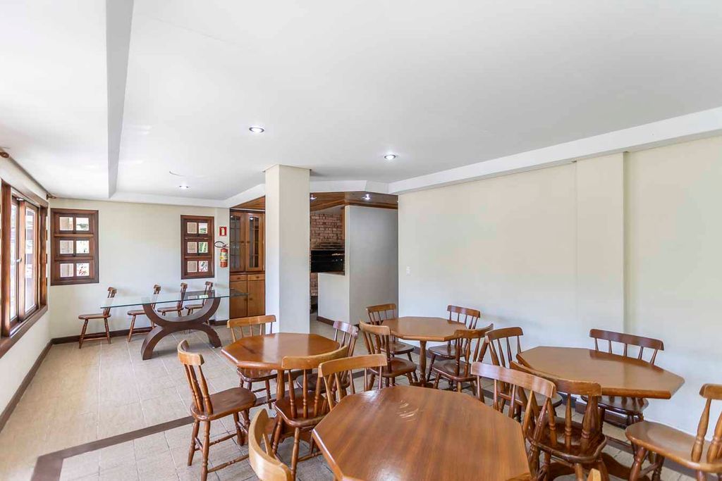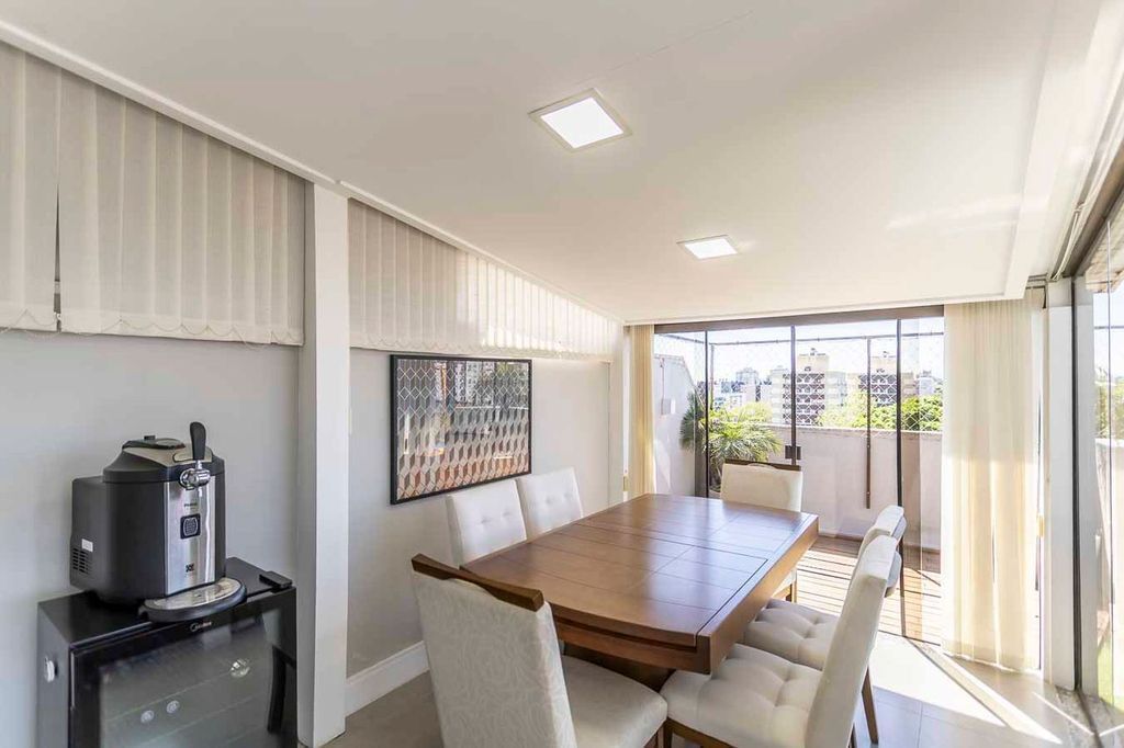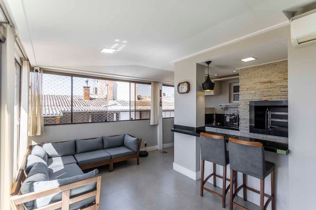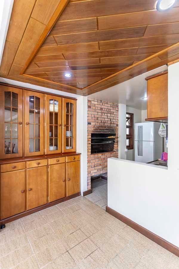 Possui no pavimento inferior amplo living 02 ambientes, lavabo, 03 dormitórios transformados em 02 com possibilidade de reversão, sendo 01 suíte com sacada e closet, cozinha mobiliada e área de serviço. No segundo pavimento conta com estar íntimo com lareira, gabinete ou mais 01 dormitório, banheiro social, espaço gourmet com churrasqueira, terraço com vista panorâmica e ótima posição solar.