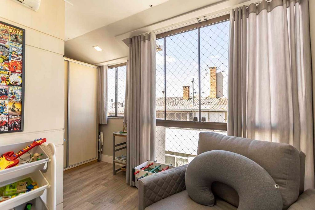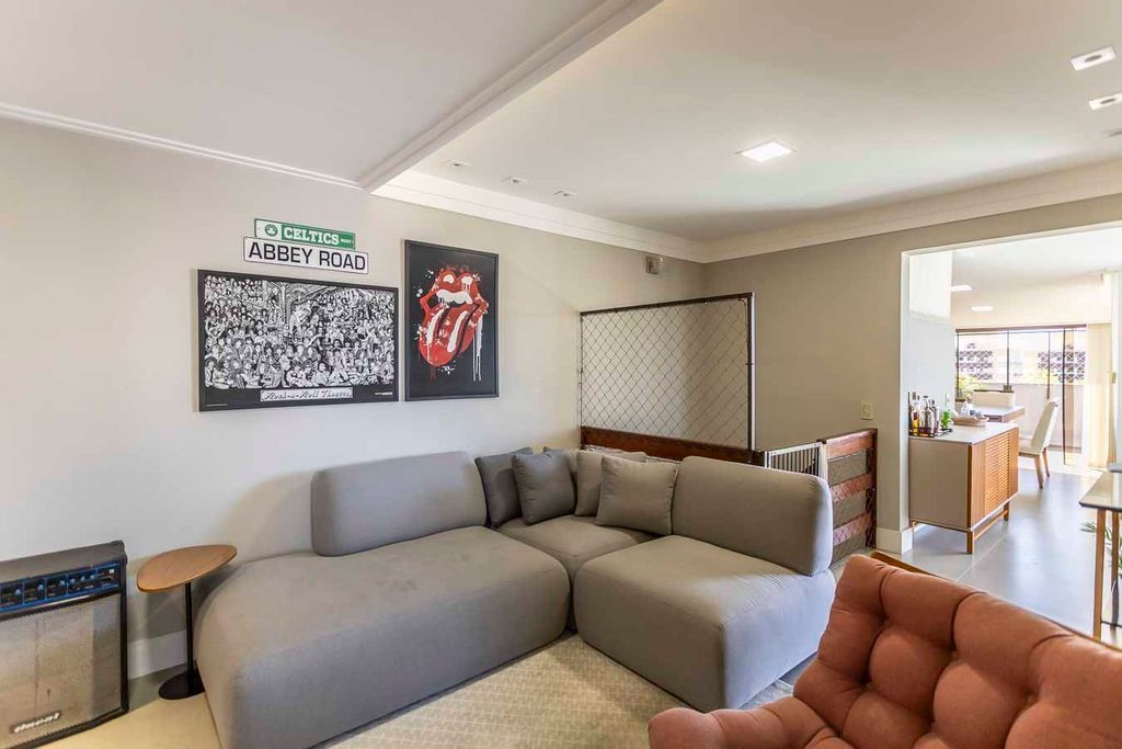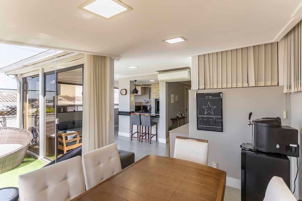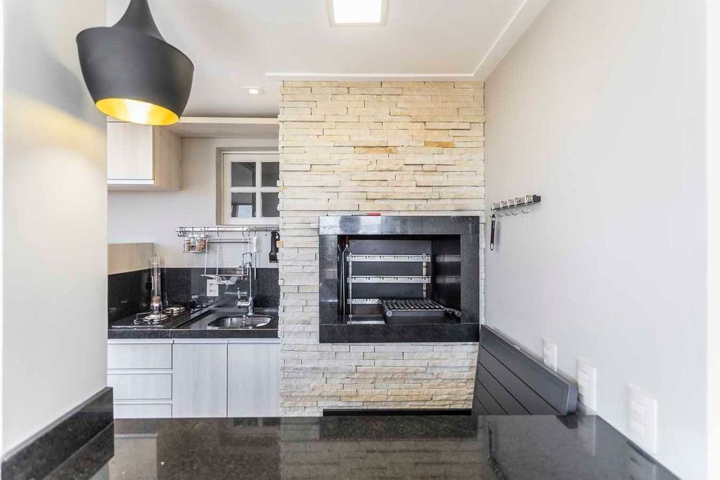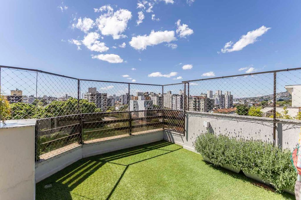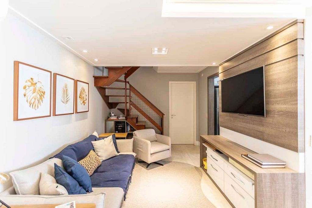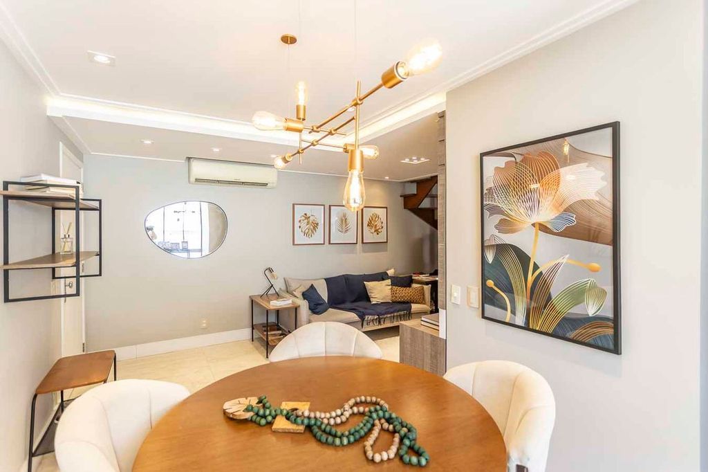 Possui no pavimento inferior amplo living 02 ambientes, lavabo, 03 dormitórios transformados em 02 com possibilidade de reversão, sendo 01 suíte com sacada e closet, cozinha mobiliada e área de serviço. No segundo pavimento conta com estar íntimo com lareira, gabinete ou mais 01 dormitório, banheiro social, espaço gourmet com churrasqueira, terraço com vista panorâmica e ótima posição solar.