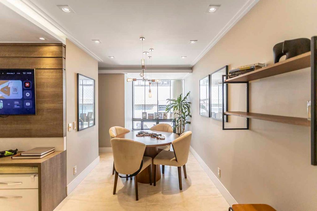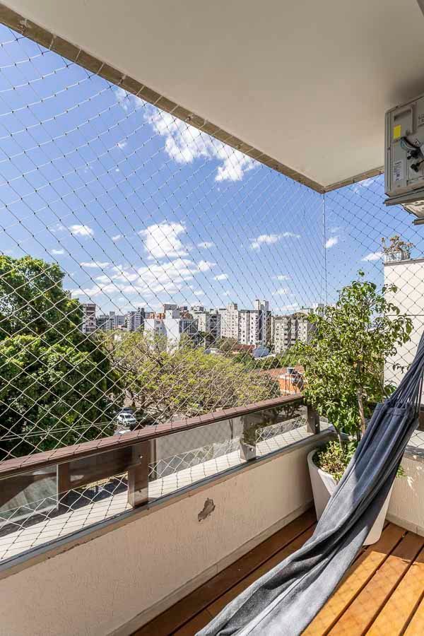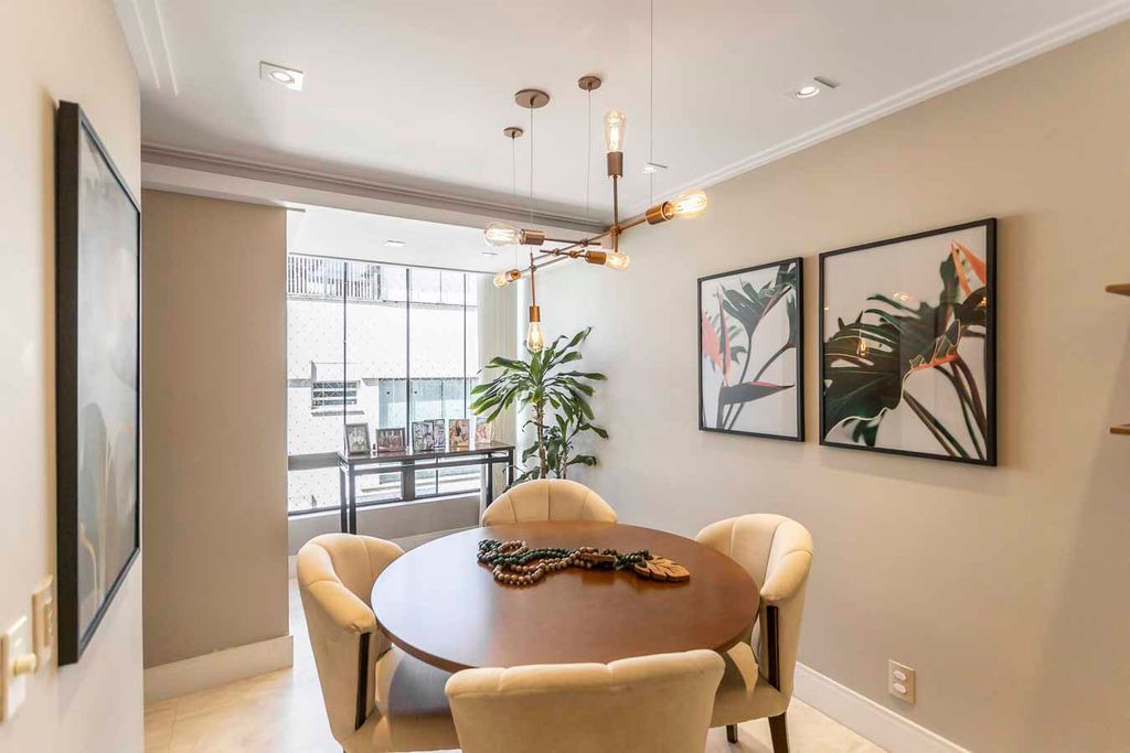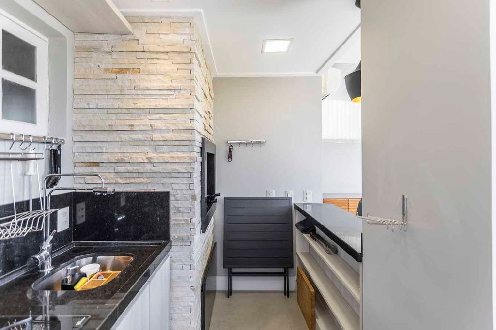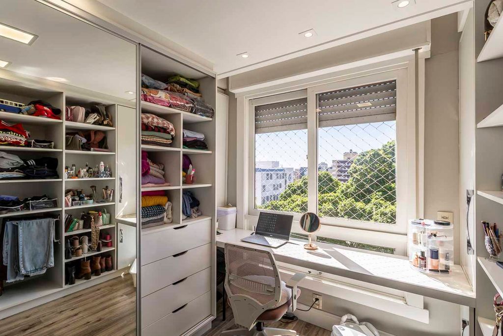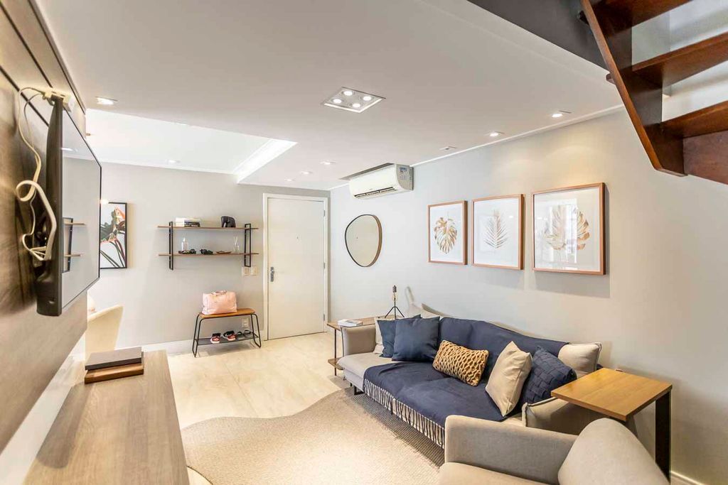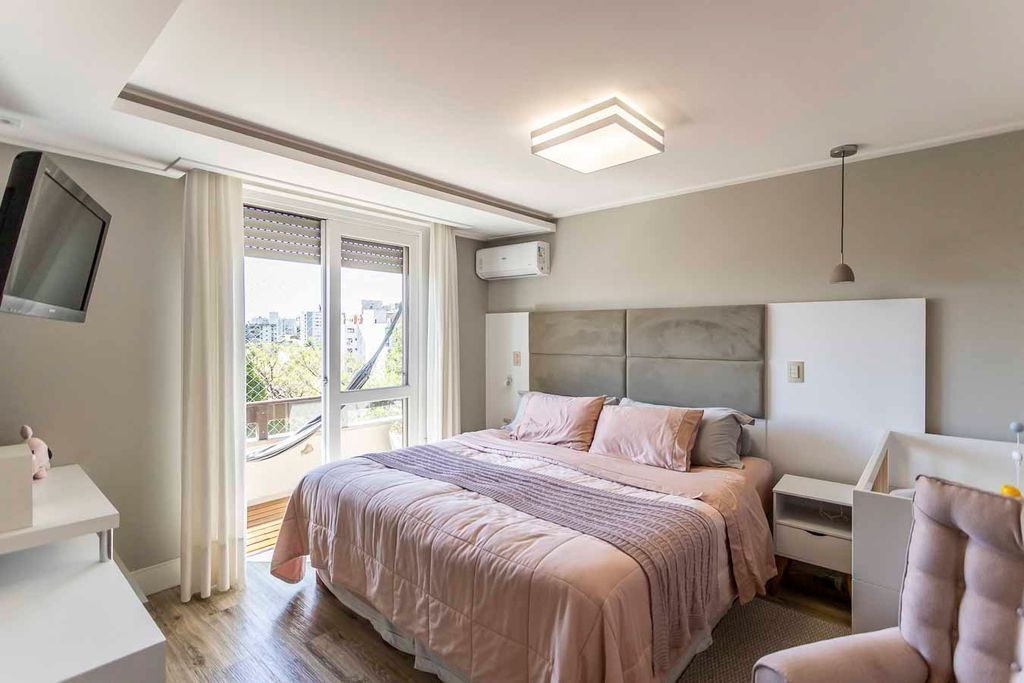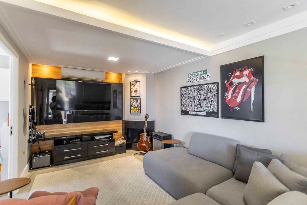 Possui no pavimento inferior amplo living 02 ambientes, lavabo, 03 dormitórios transformados em 02 com possibilidade de reversão, sendo 01 suíte com sacada e closet, cozinha mobiliada e área de serviço. No segundo pavimento conta com estar íntimo com lareira, gabinete ou mais 01 dormitório, banheiro social, espaço gourmet com churrasqueira, terraço com vista panorâmica e ótima posição solar.