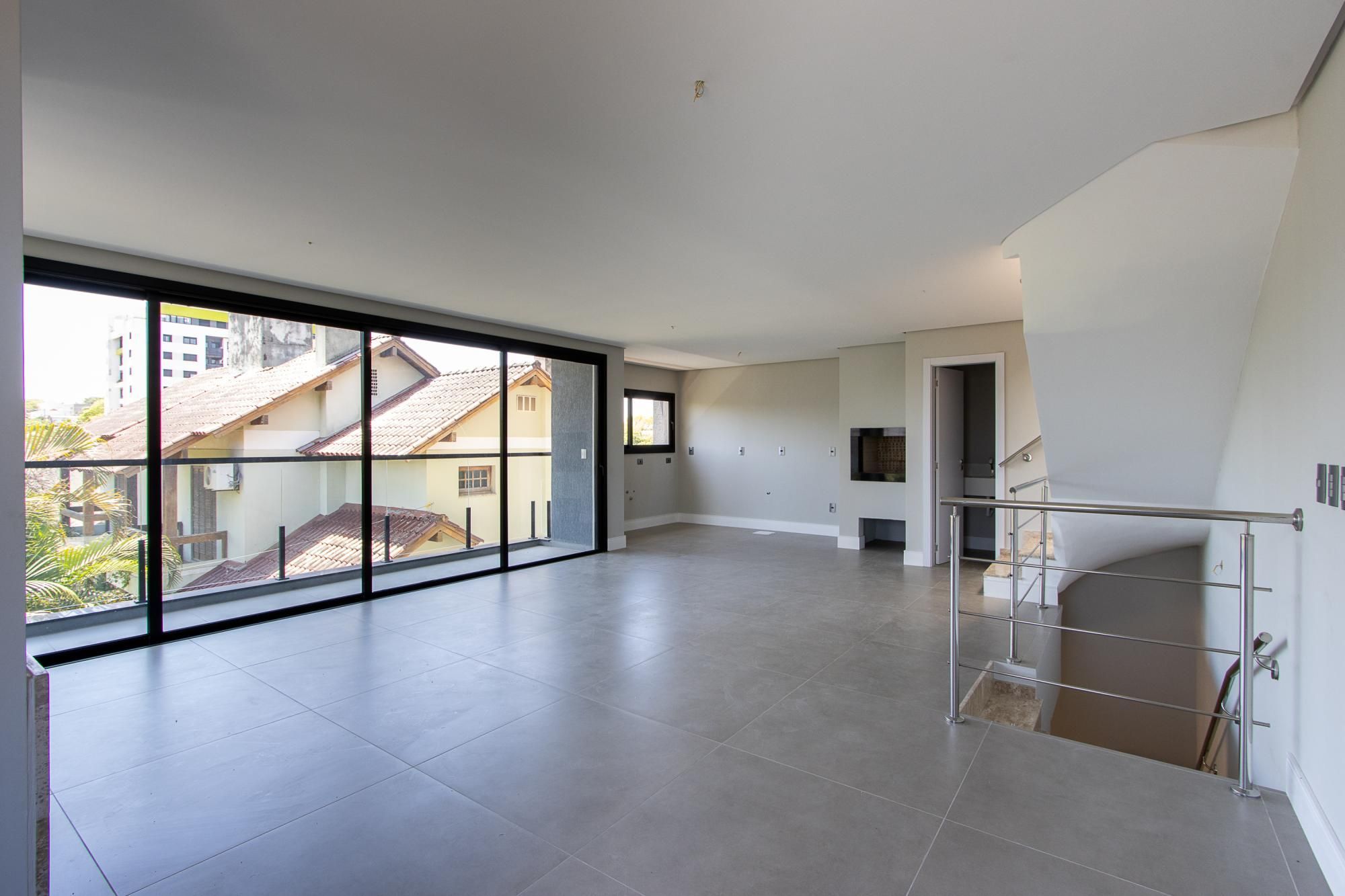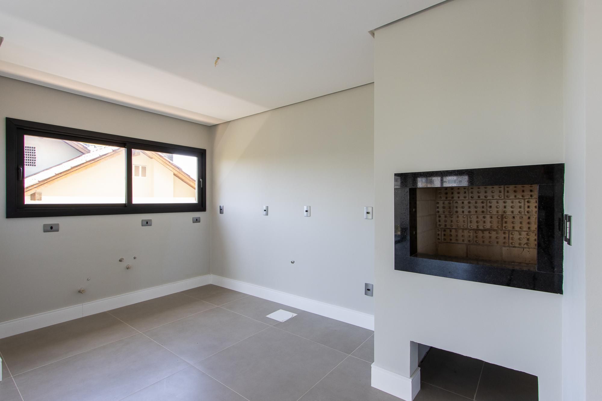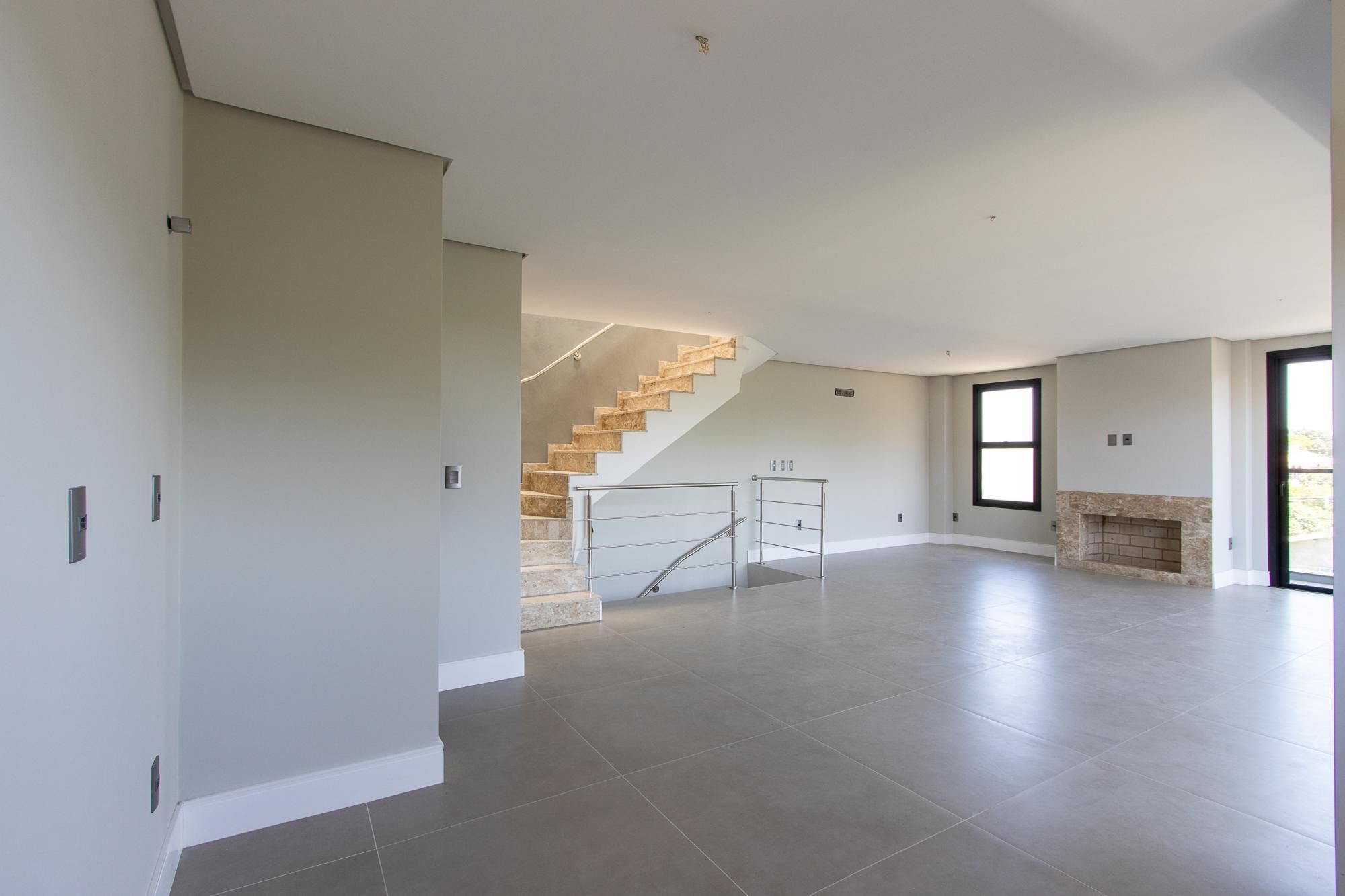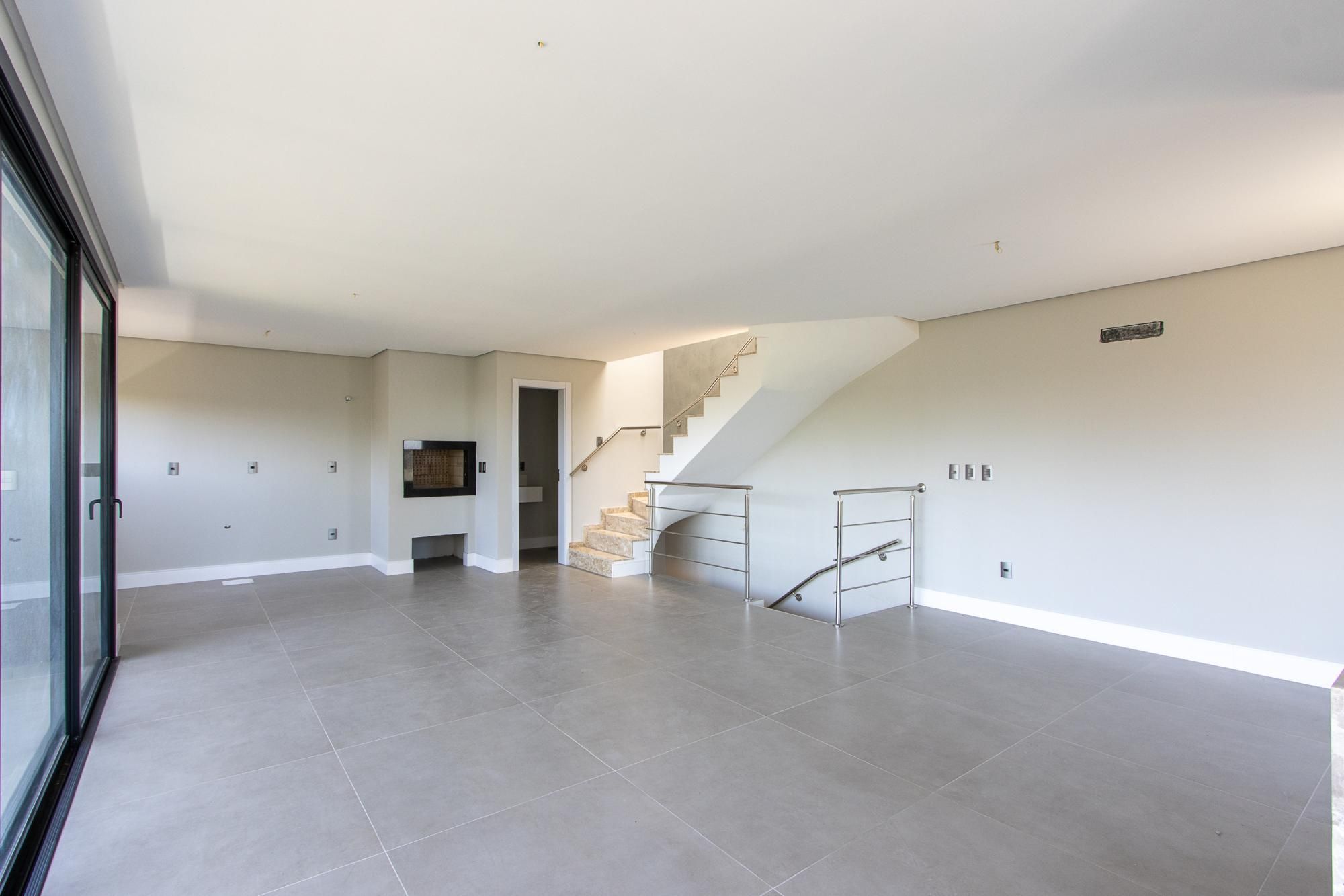 No 1° andar: Conceito aberto. Área de estar e jantar integradas com piso porcelanato 90x90, escada e lareira revestidas em granito, churrasqueira, sacada com guarda corpo em vidro, lavabo.