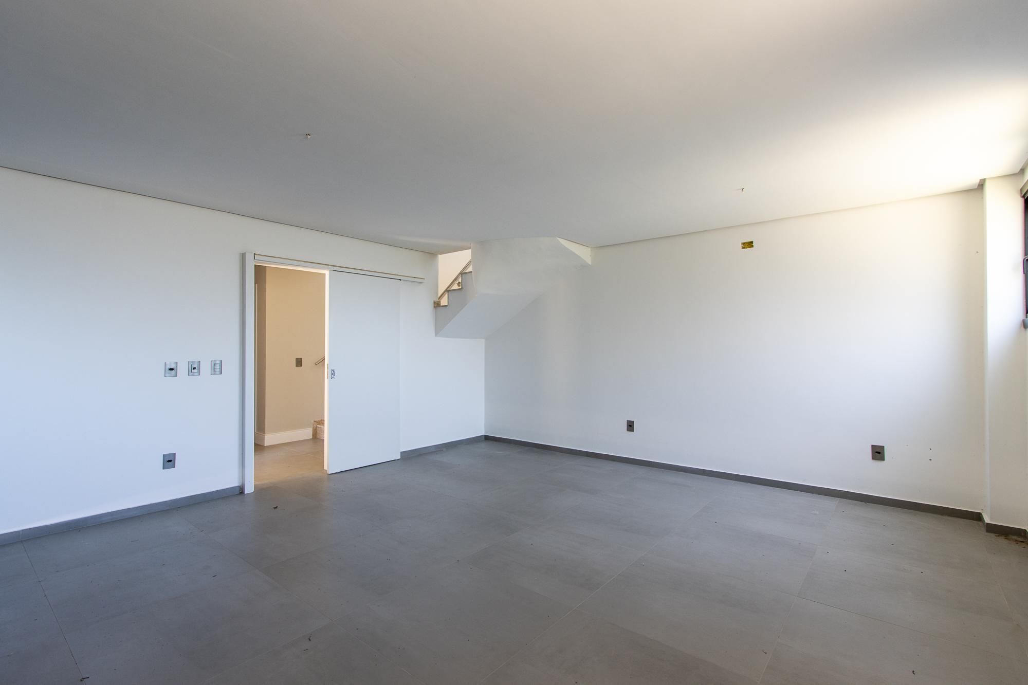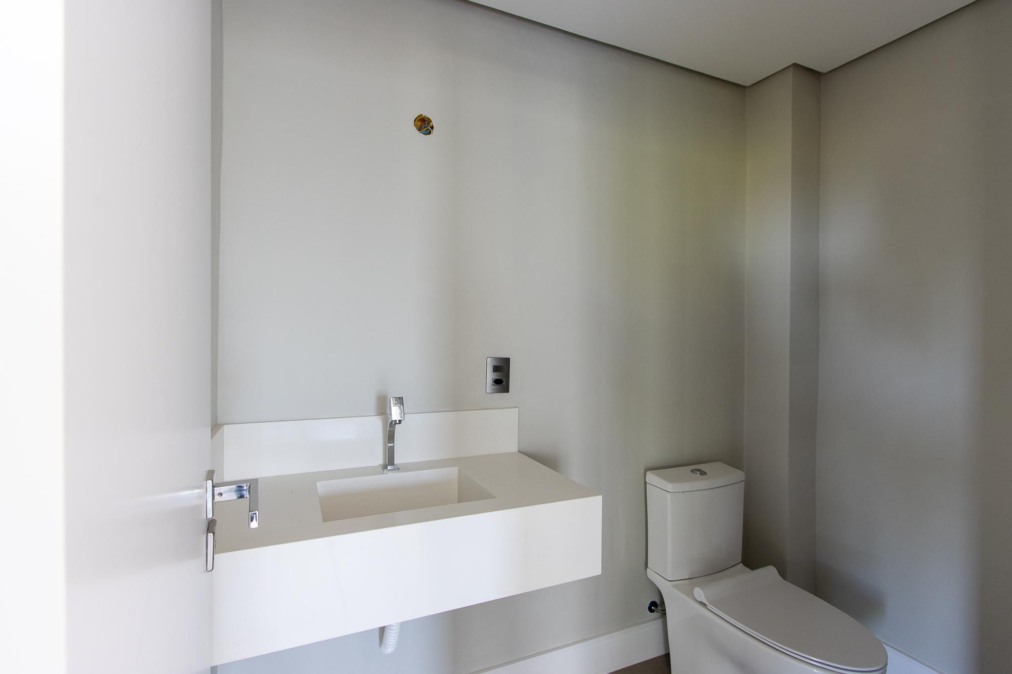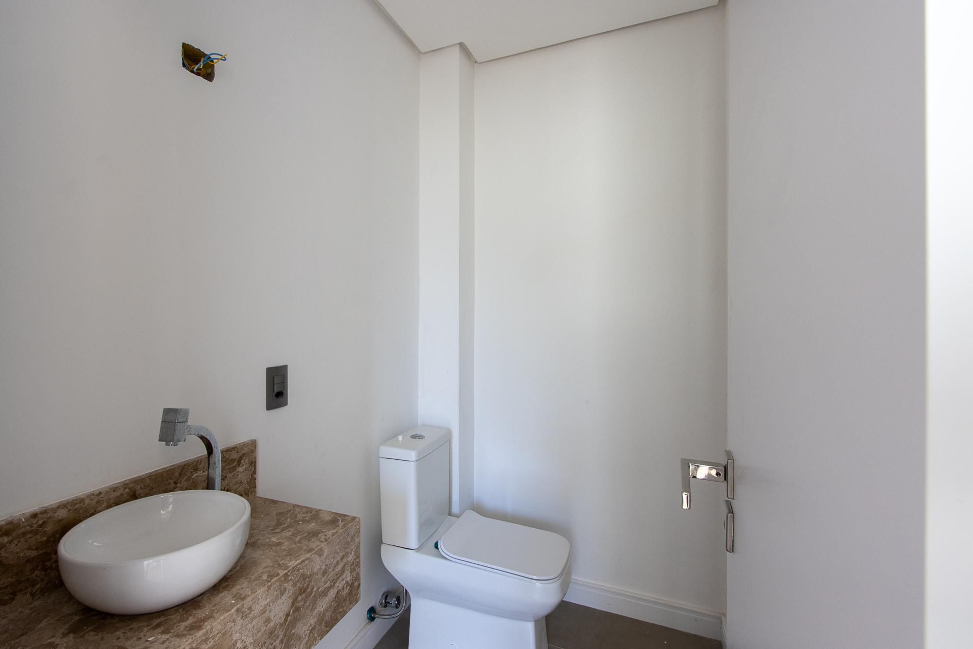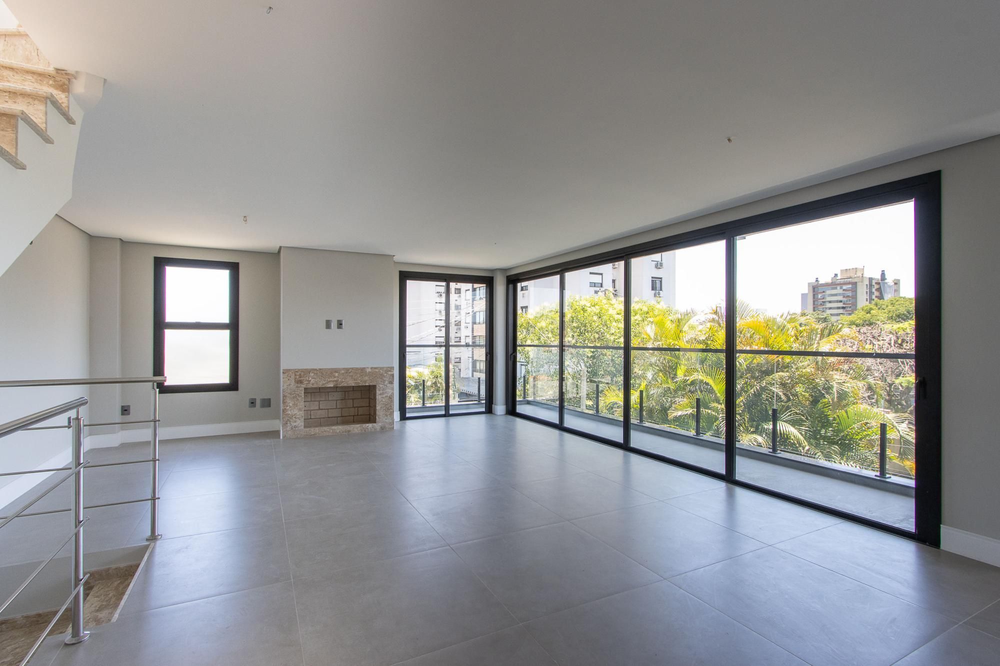 No 1° andar: Conceito aberto. Área de estar e jantar integradas com piso porcelanato 90x90, escada e lareira revestidas em granito, churrasqueira, sacada com guarda corpo em vidro, lavabo.