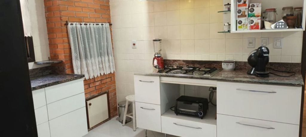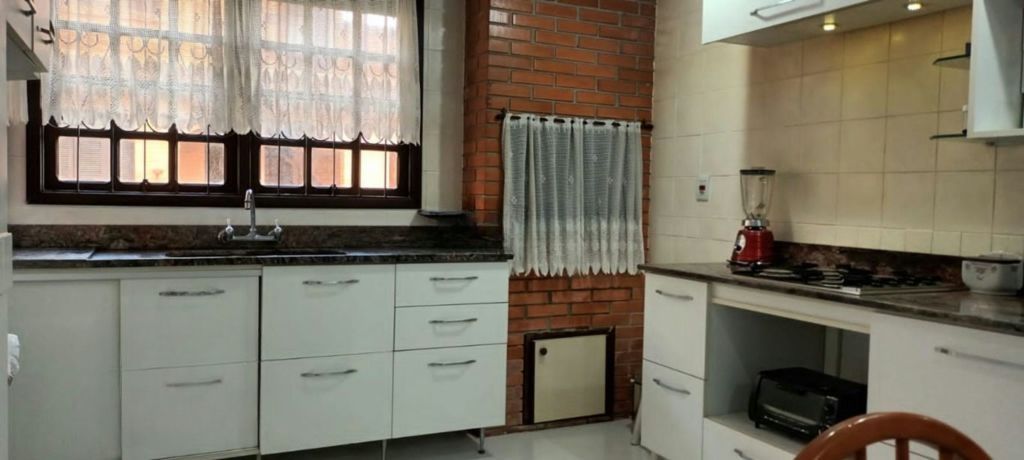 A cozinha é ampla, ventilada e iluminada, com móveis planejados fixos, churrasqueira integrada e espaço para fogão a lenha.
