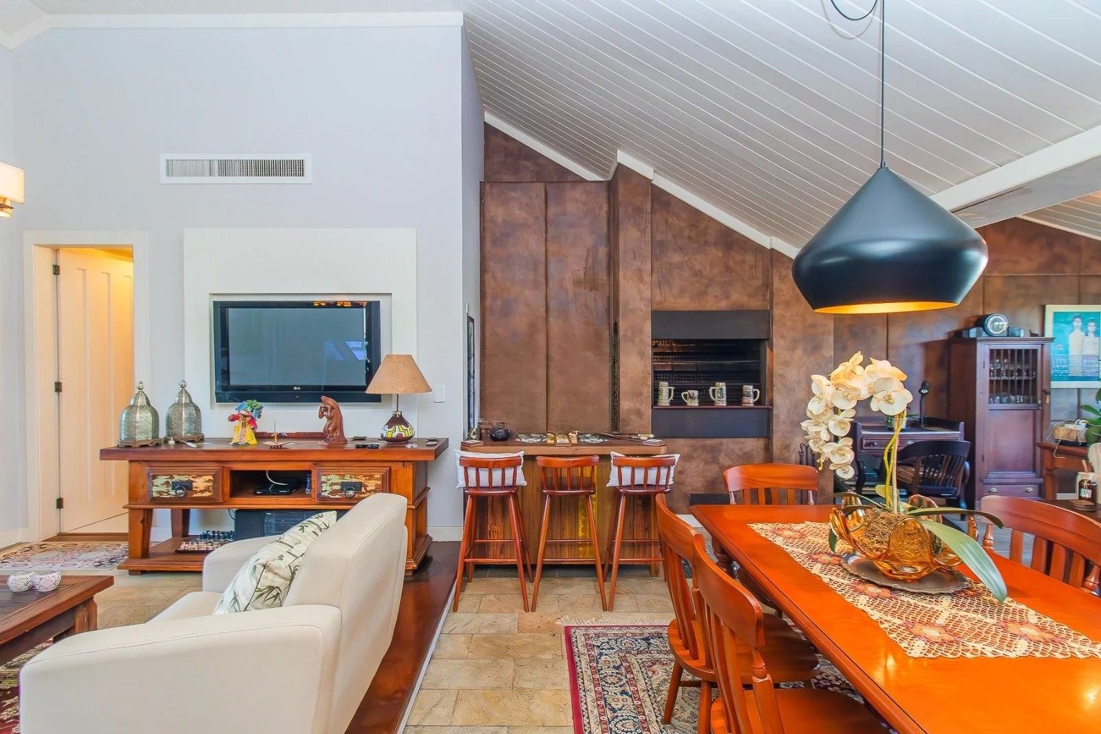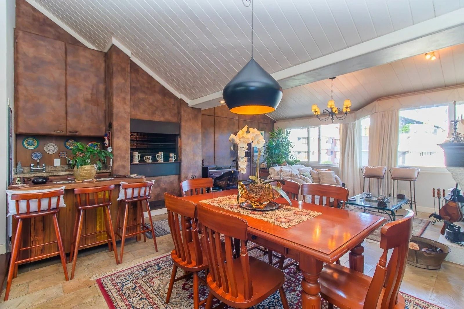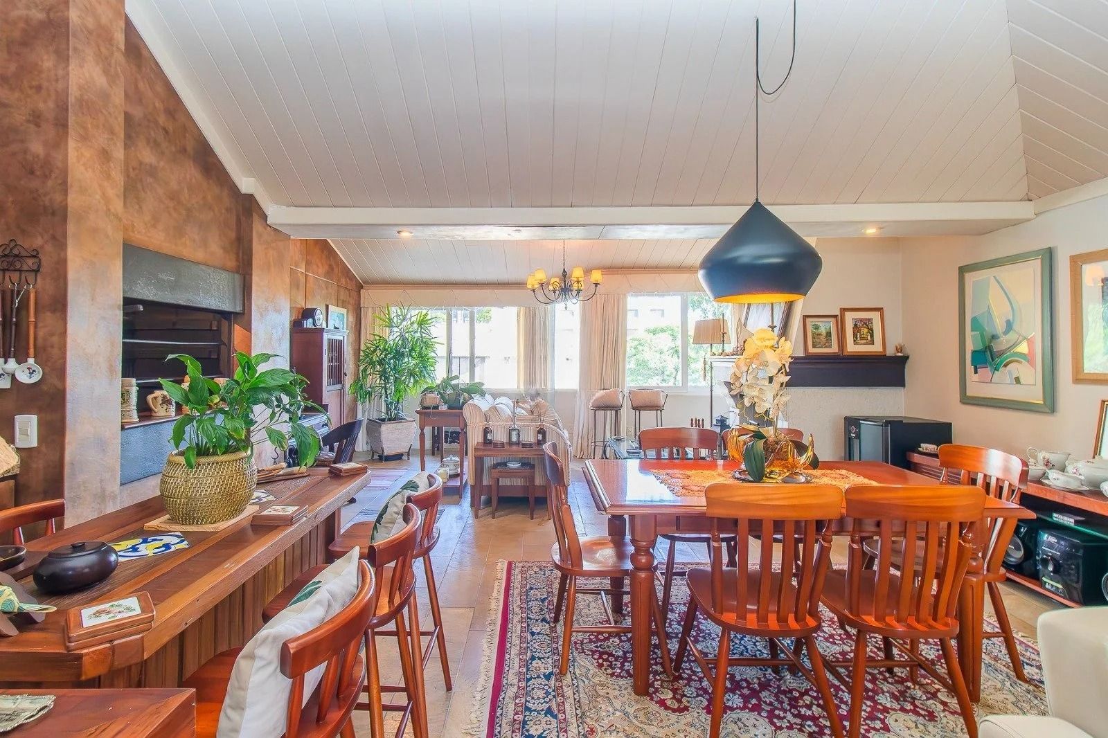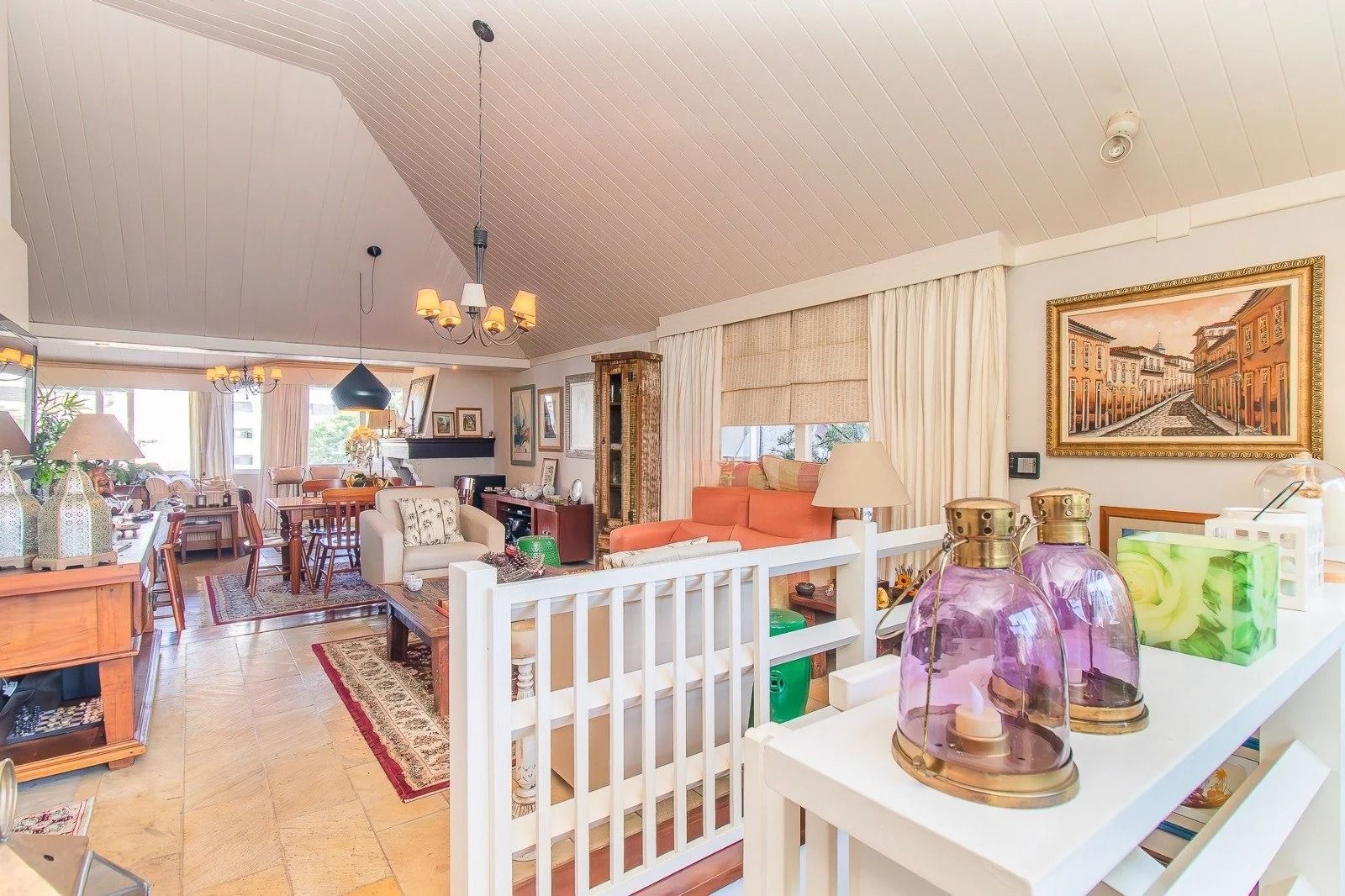 No andar inferior: 4 dormitórios, sendo 1 suíte master com closet. Banheiro social, sala de estar e jantar integradas, com janelas amplas que garantem excelente iluminação natural e ventilação cruzada. Cozinha funcional, com área de serviço separada e banheiro adicional. Adega para armazenar seus vinhos com elegância. 3 vagas de garagem cobertas, oferecendo praticidade e segurança.