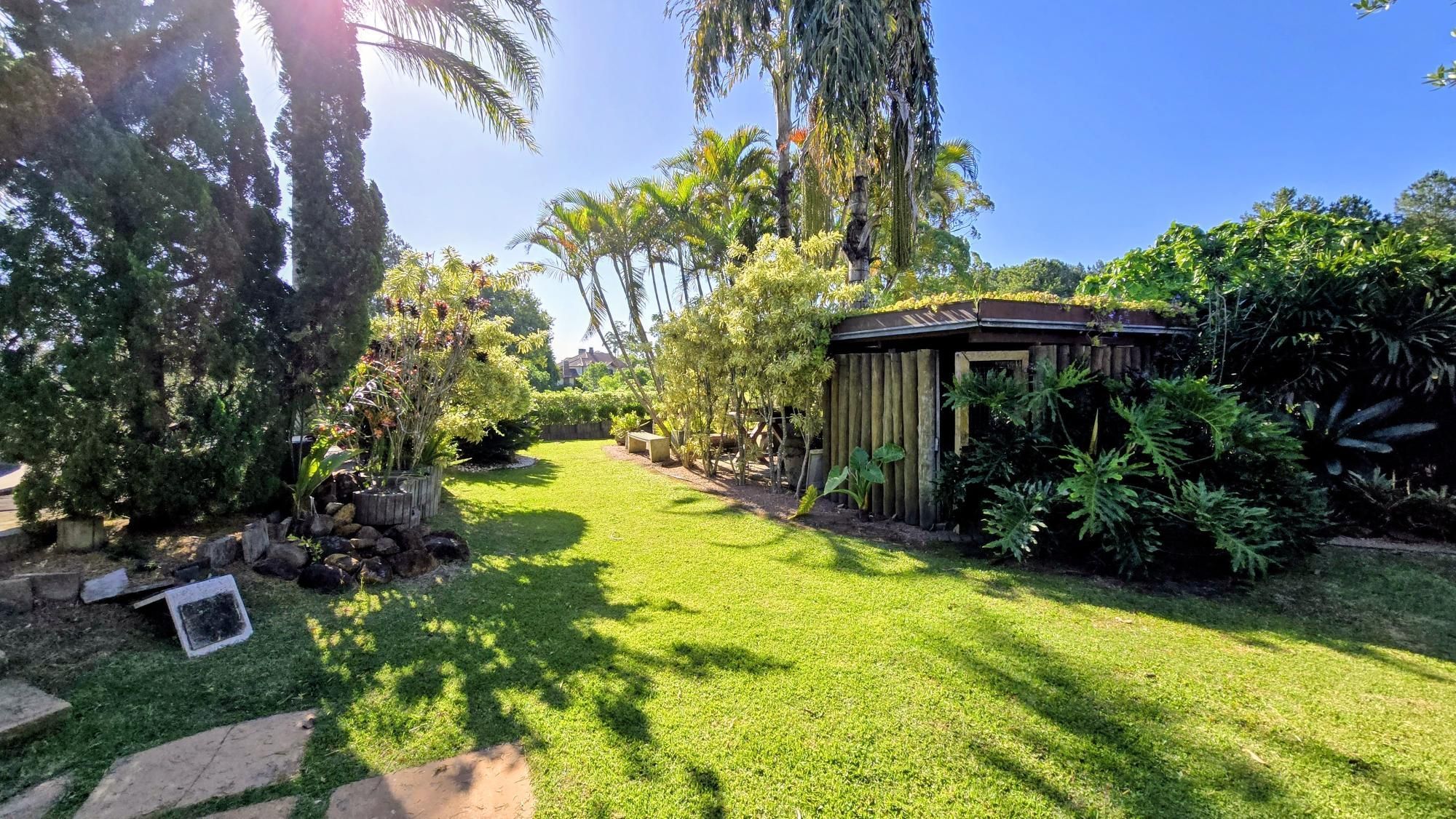 Um espaço gourmet com churrasqueira junto ao jardim com piscina, gramado e lindo paisagismo.