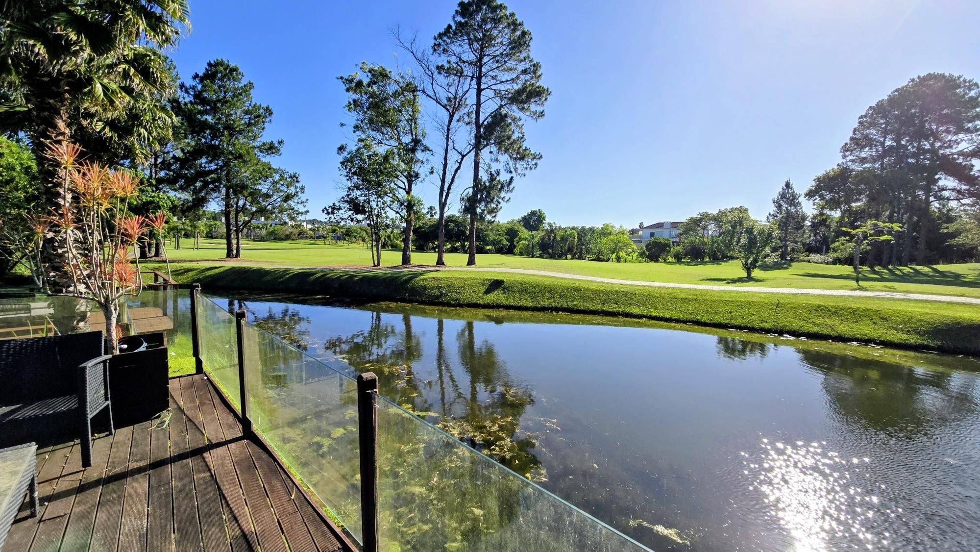 O deck se debruça sobre o lago, com uma vista incrível até o campo de golfe na outra margem.