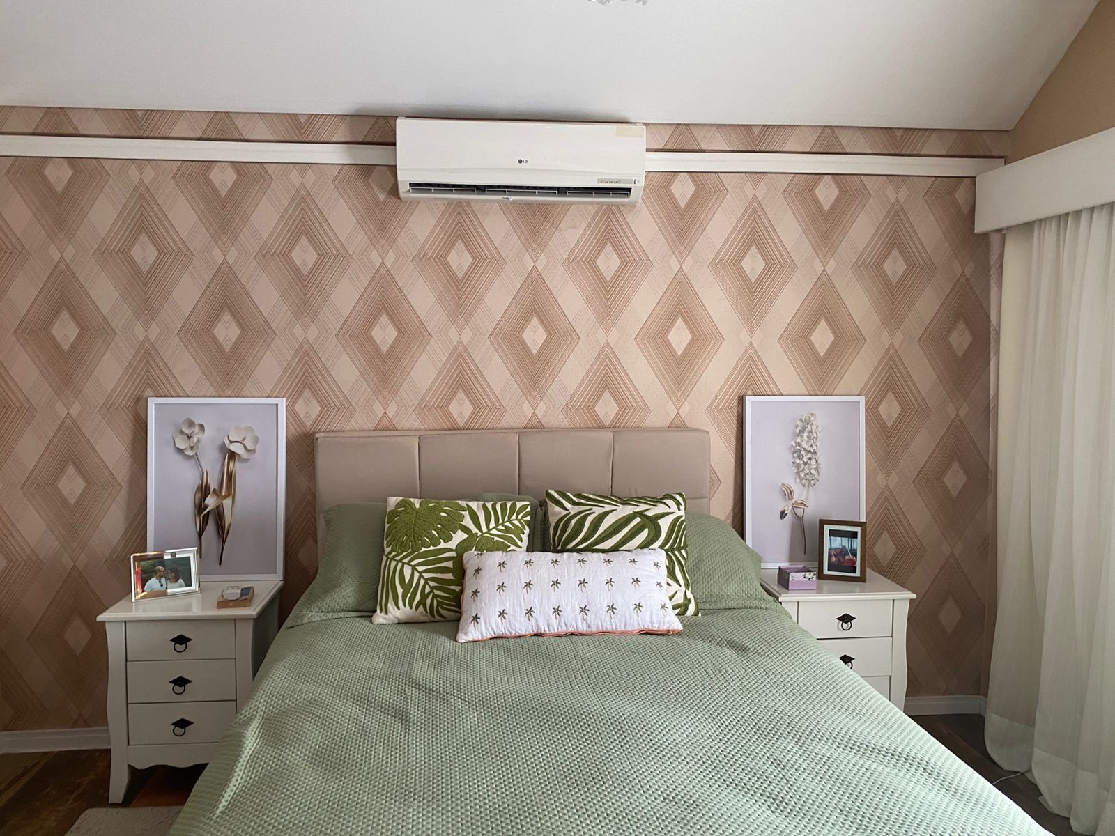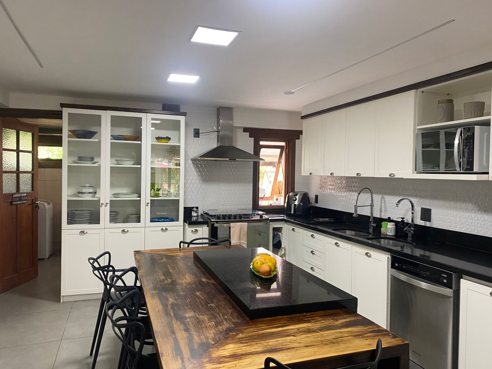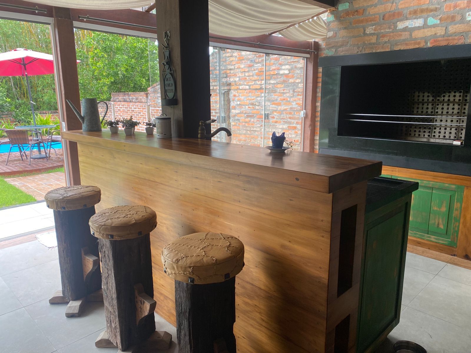 A casa possui living com lareira, lavabo, gabinete e 4 suítes