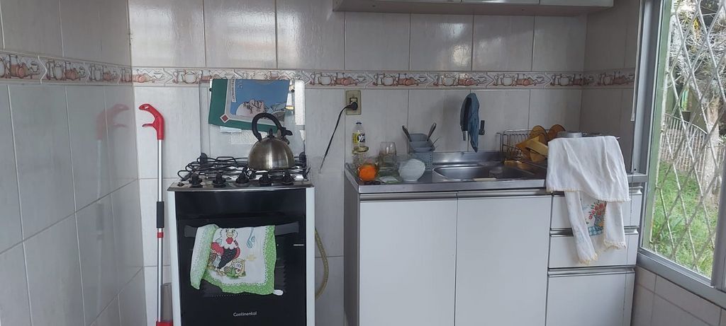 Cozinha ampla, iluminada e ventilada, em piso cerâmico, com janelas grandes.