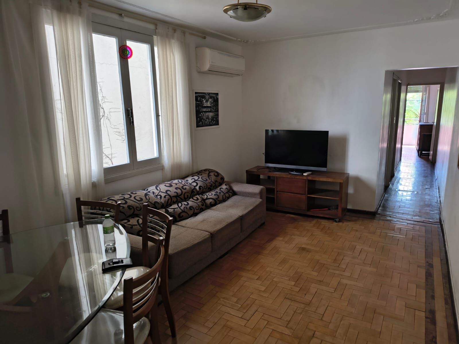 Excelente apto. no Bairro Farroupilha, frente ao Brique da Redenção, de 105,64 m2 de área útil, com 02 dormitorios mobiliados com armarios em ambos, cozinha fechada totalmente mobiliada, área de serviço separada, dependenca de empregada, amplo living com sacada para frente da Redenção, split, luminarias, banheiro social mobiliado, piso todo em parquet. Baixo condominio.
