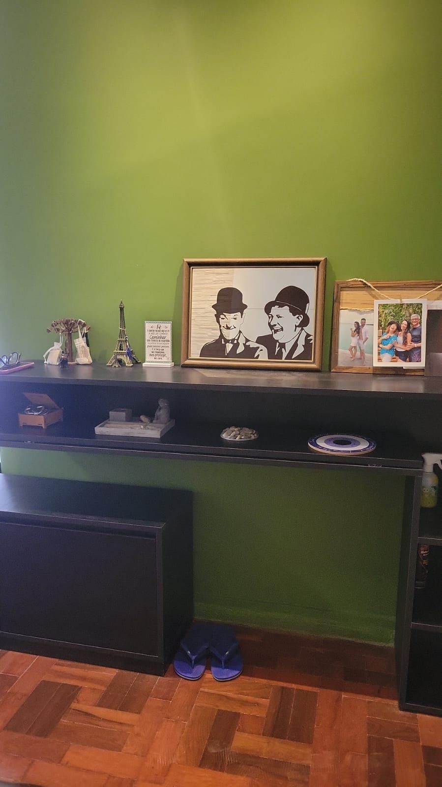 da sala com painel, móveis do closet com cabideiro, prateleiras e