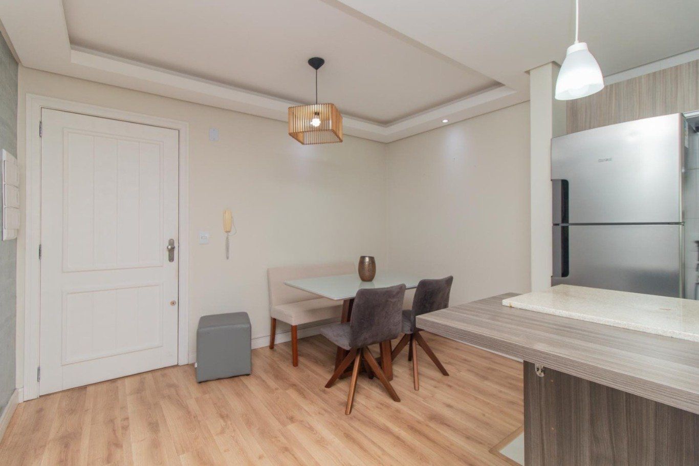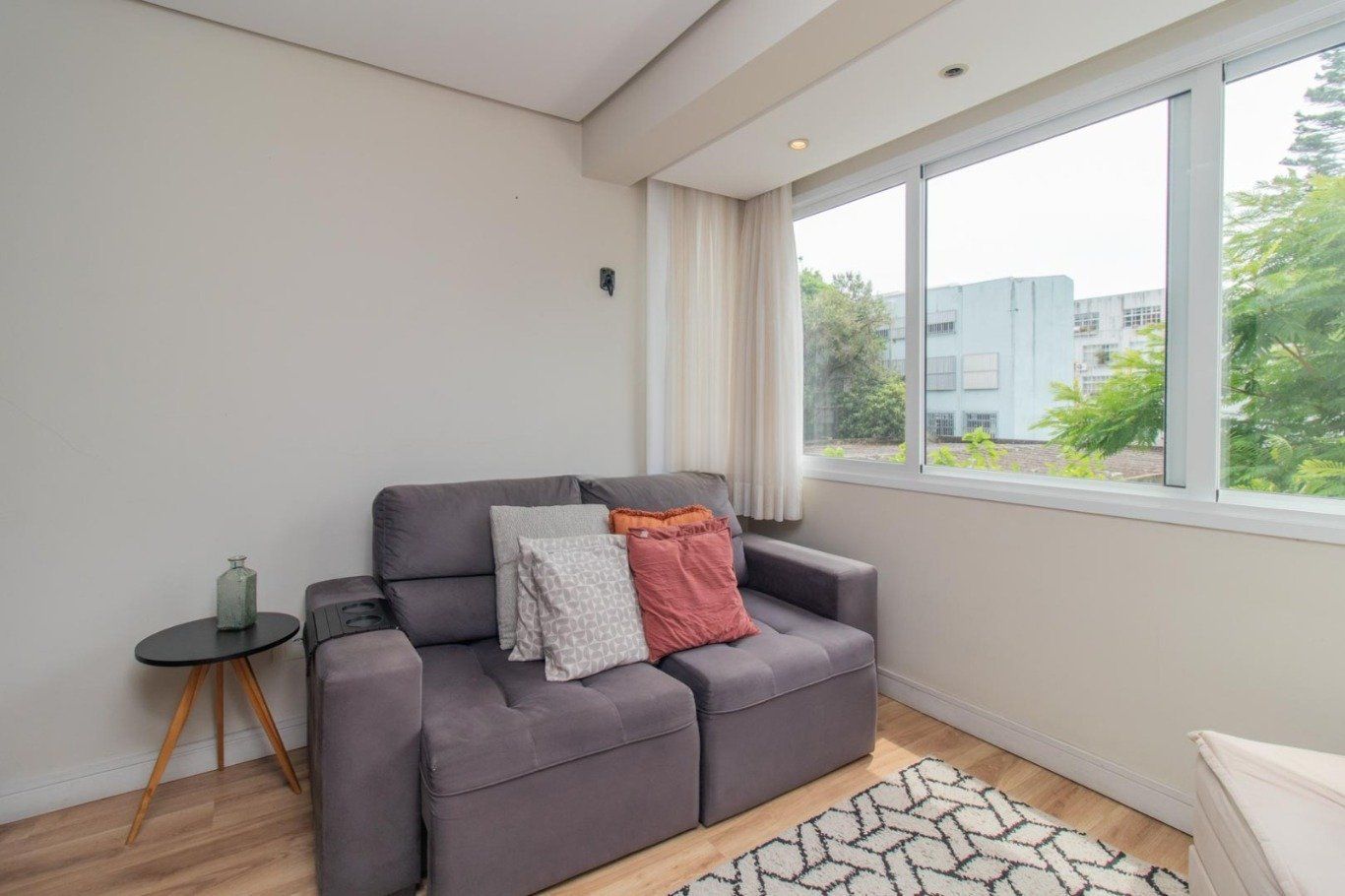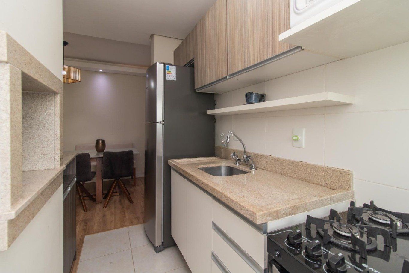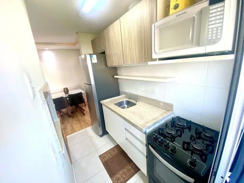 São 44 metros privativos. Sala compacta com vista livre, 1 amplo dormitório, 1 banheiro com ventilação natural, cozinha planejada com churrasqueira e área de serviço separada.