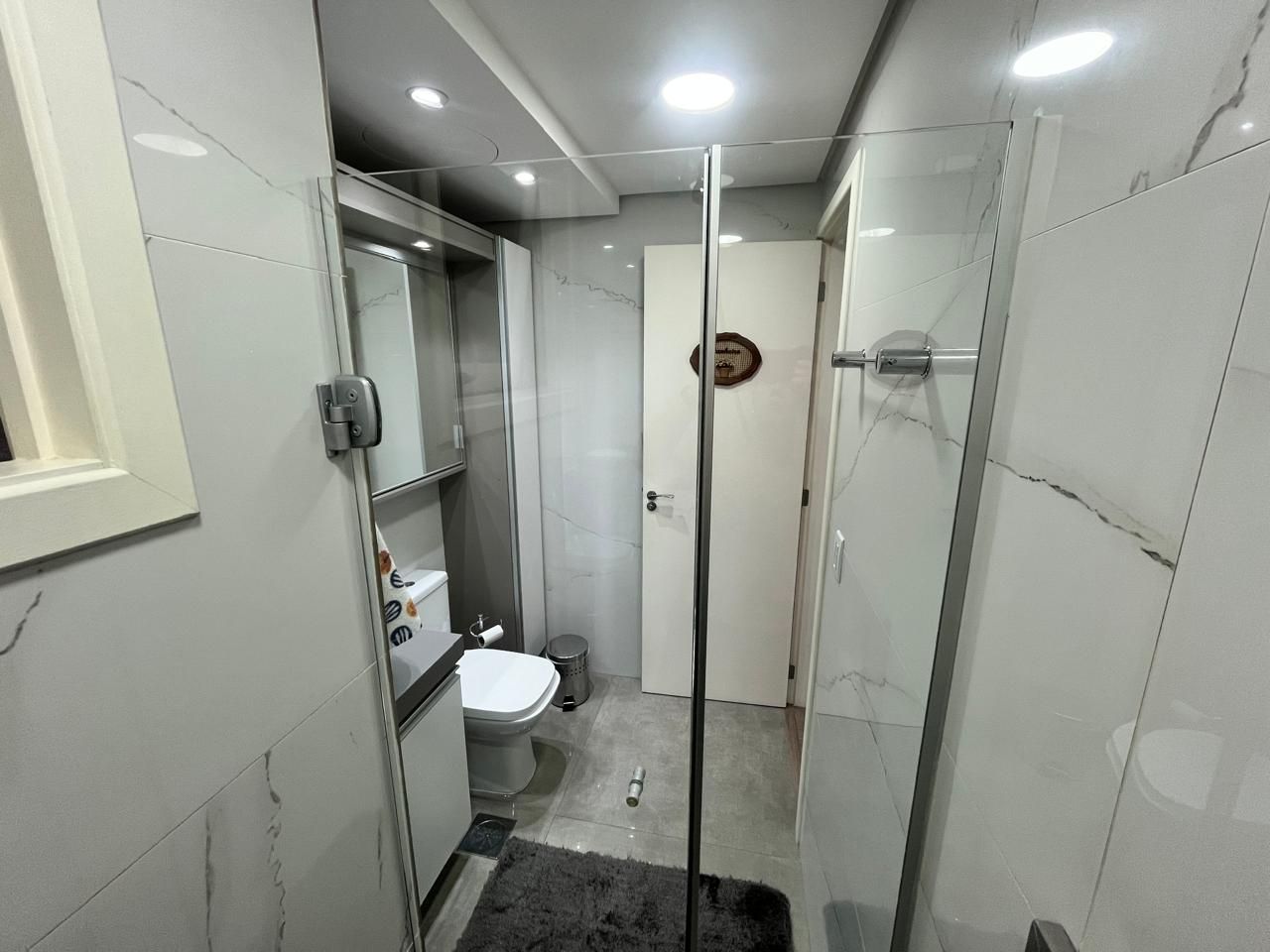 O imóvel conta com um belíssimo banheiro social e um banheiro auxiliar, ambos executados com materiais de alto padrão. A cozinha, área de serviço e banheiros dispõem de móveis planejados sob medida, garantindo funcionalidade e sofisticação no dia a dia. A fechadura digital oferece praticidade e segurança no acesso.