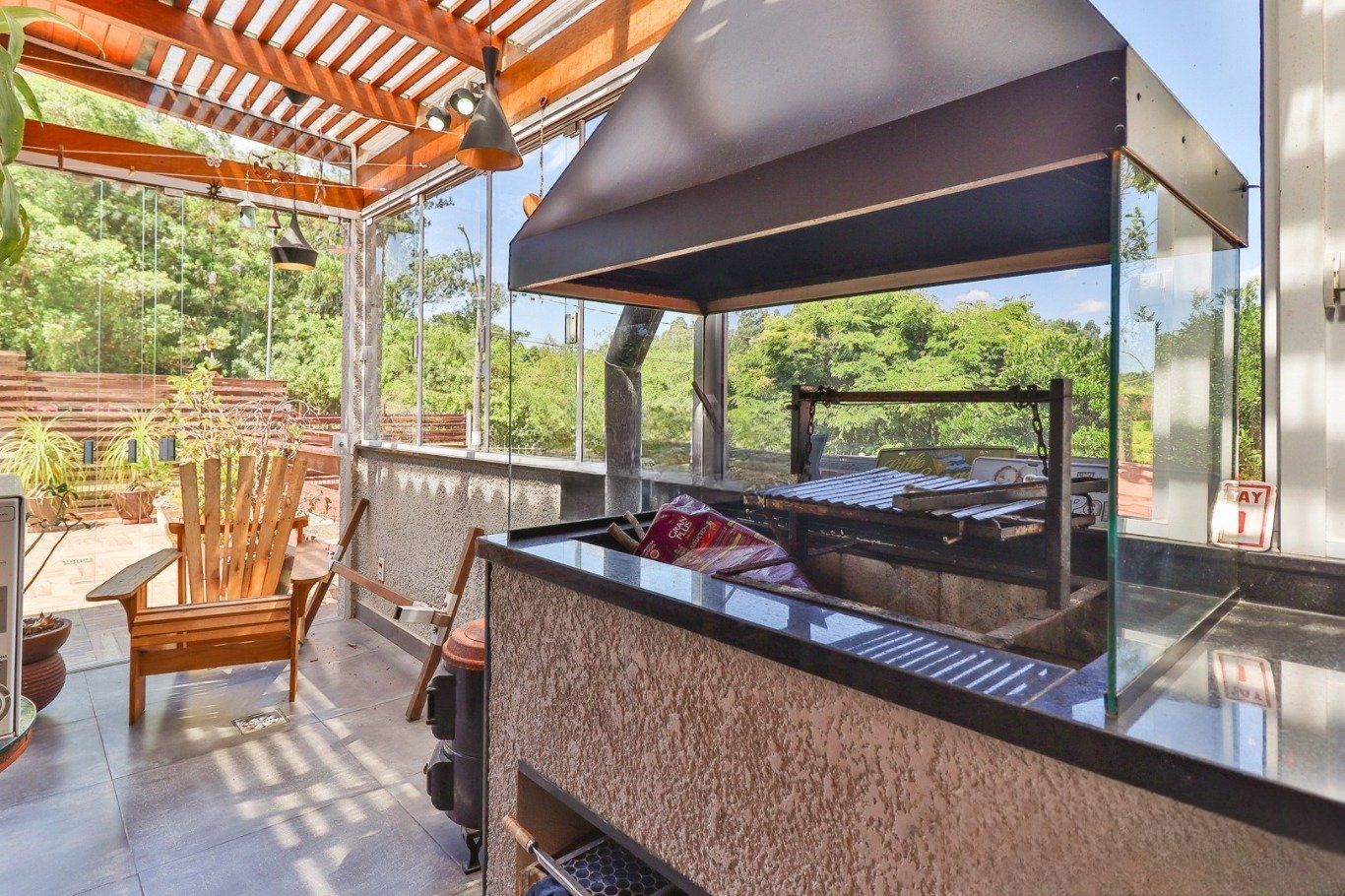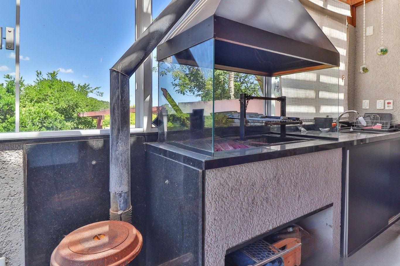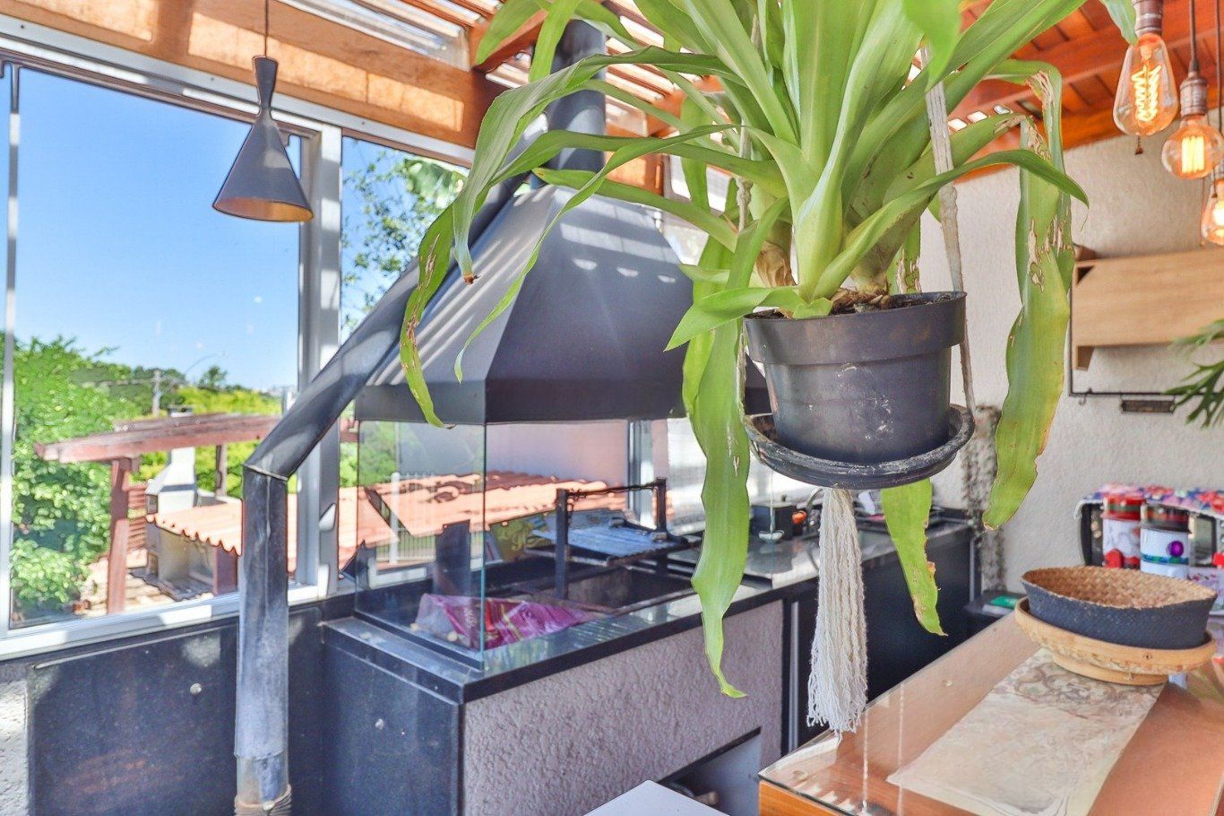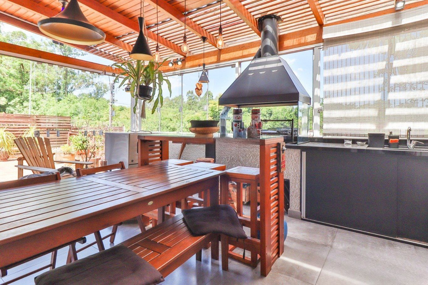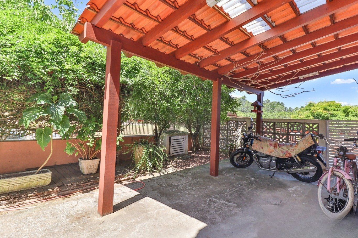 Possui vaga para até 3 carros, espaço gourmet com churrasqueira e fogão a lenha, além de amplo pátio com possibilidade de piscina privativa.