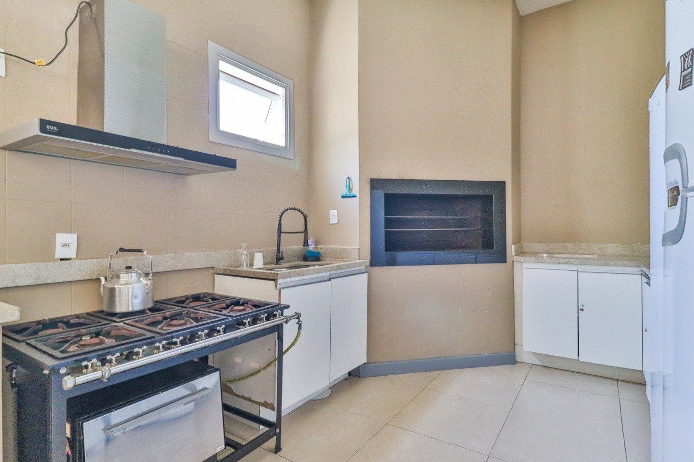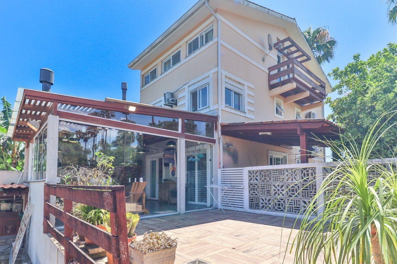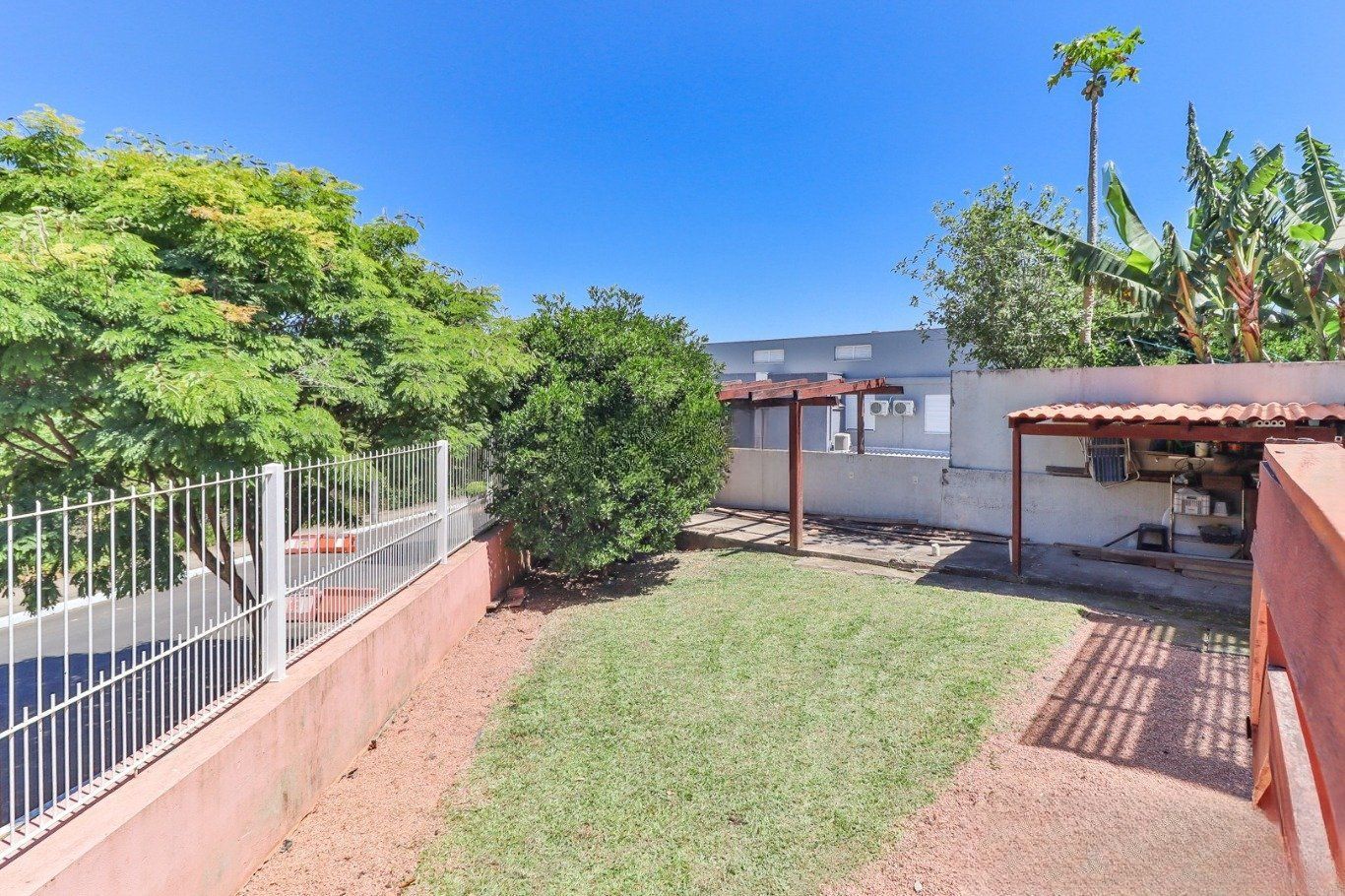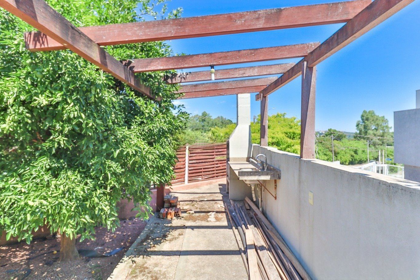 Possui vaga para até 3 carros, espaço gourmet com churrasqueira e fogão a lenha, além de amplo pátio com possibilidade de piscina privativa.
