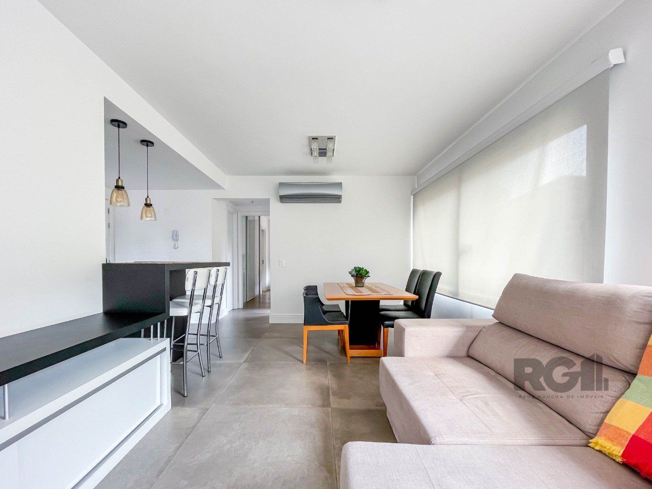 Apartamento novo de 70m², mobiliado e muito bem decorado, 2 dormitórios, sendo 1 com suíte e o outro transformado em escritório / sala de estudos, ambos com ar condicionado, assim como o living de 2 ambientes. A cozinha é planejada e equipada com armários, elétros e churrasqueira. Conta com mais a área de serviço, 1 banheiro social, 1 suíte e 1 vaga de garagem com depósito. Disposto em andar intermediário, de frente, com orientação solar Norte / Oeste.