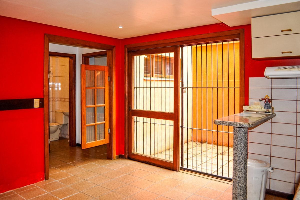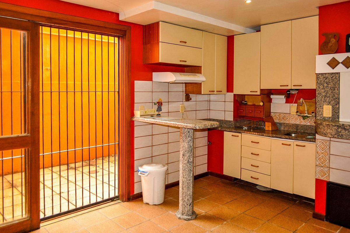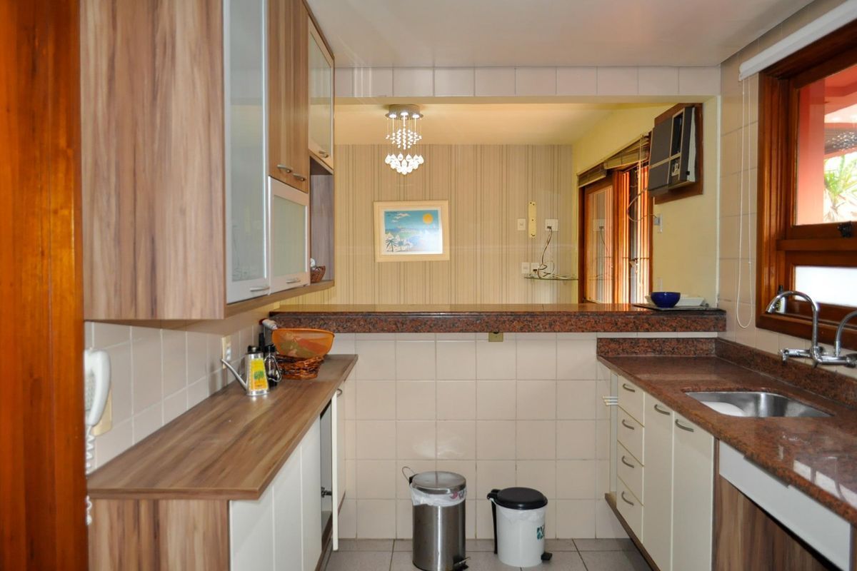 São 3 dormitórios, sendo um deles uma suíte com possibilidade do quarto dormitório, sala de estar com lareira, sala de jantar com cozinha americana, living 2 amplos ambientes, copa com bar e churrasqueira, adega, banheiro social, lavabo e banho auxiliar (total 4 banheiros), lavanderia, depósito, pequeno pátio, 2 sacadas, 1 varanda e garagem para até 4 carros.