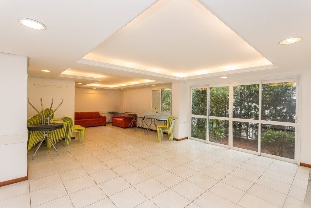 Condomínio com zelador, serviço de limpeza, vagas para visitantes, salão de festas, espaço fitness e gás central.