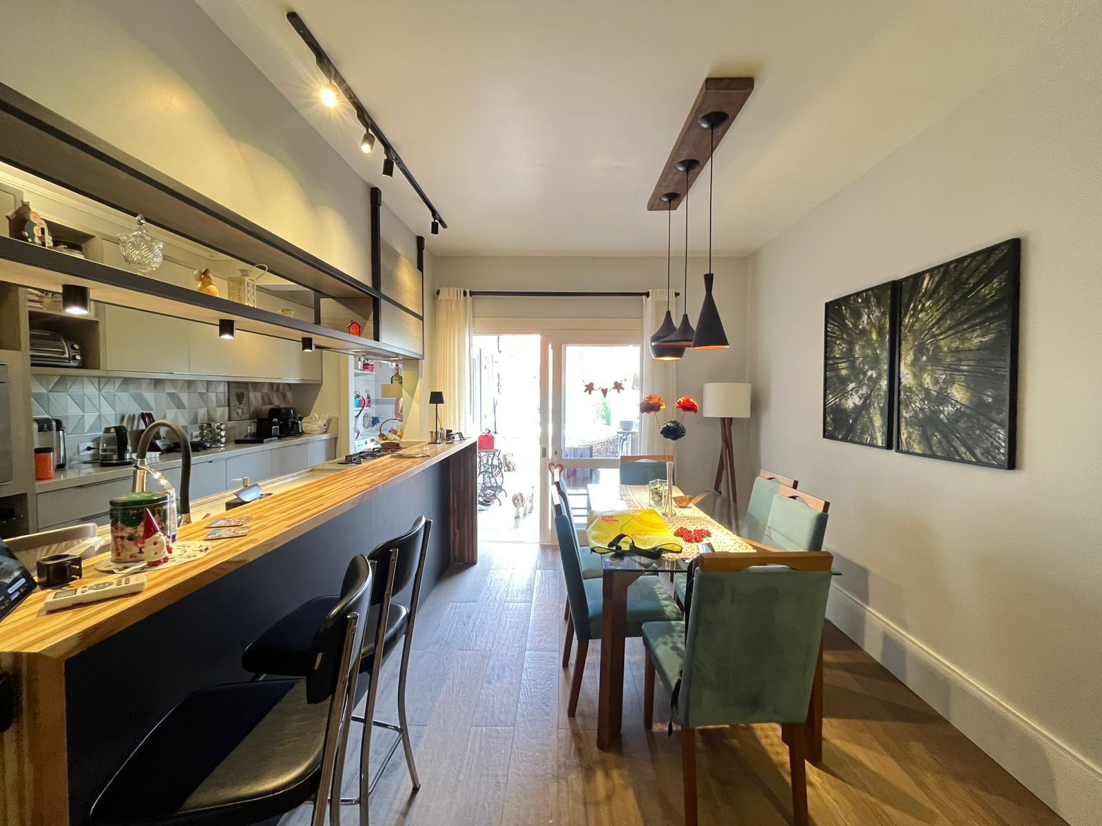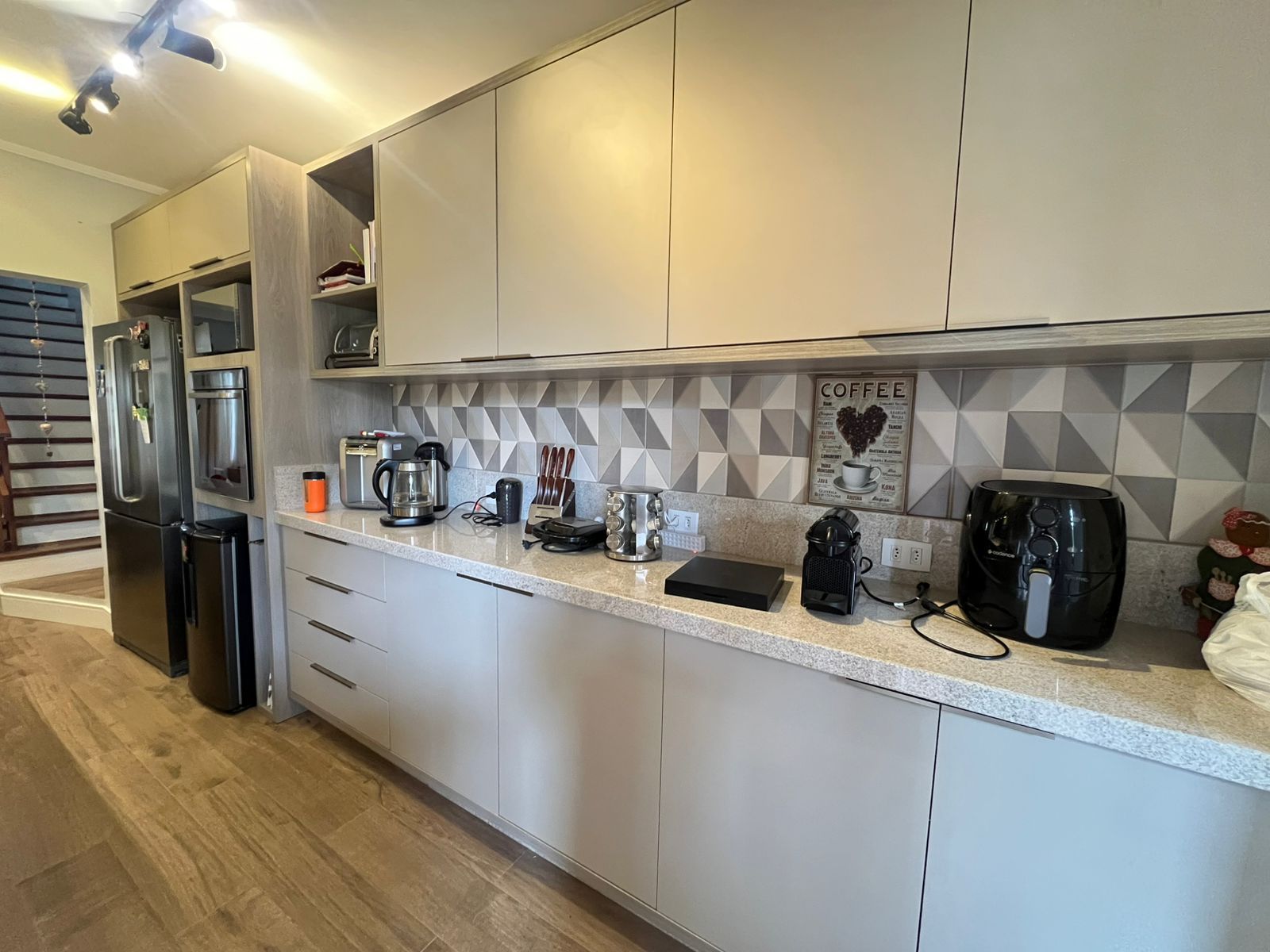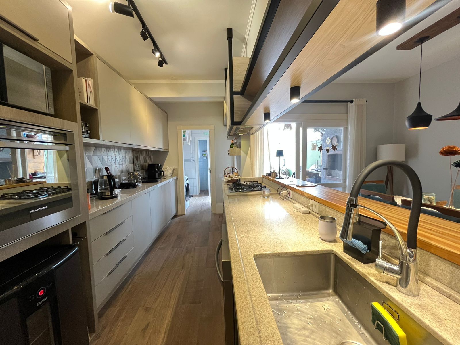 Sala com lareira. Cozinha totalmente reformada, nova, com móveis de excelente qualidade, criando bastante área de balcão.