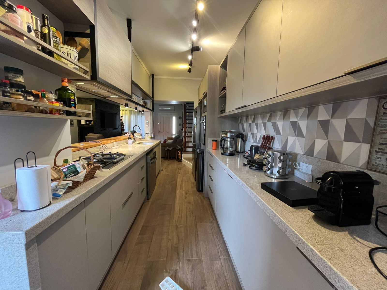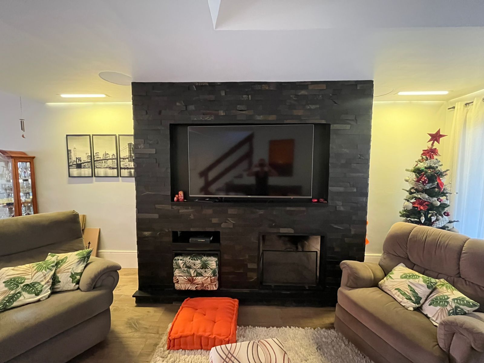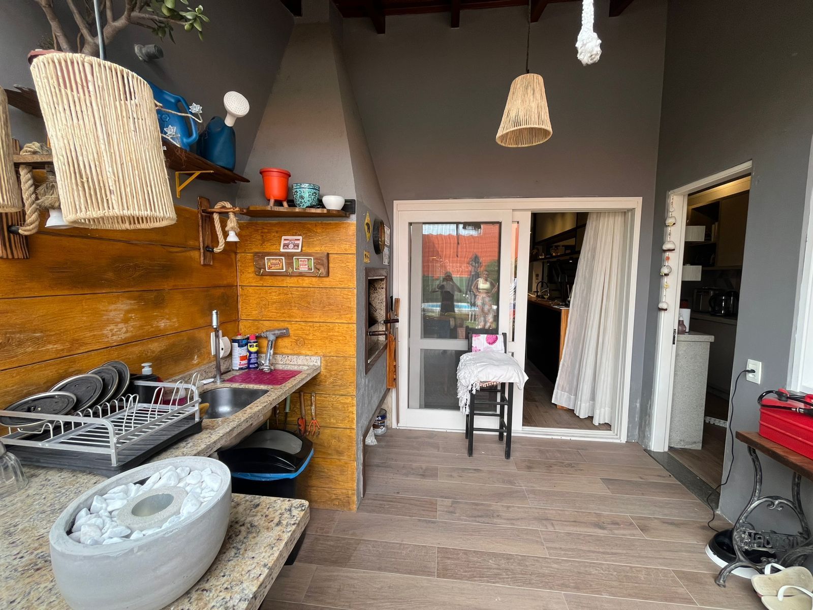 Sala com lareira. Cozinha totalmente reformada, nova, com móveis de excelente qualidade, criando bastante área de balcão.