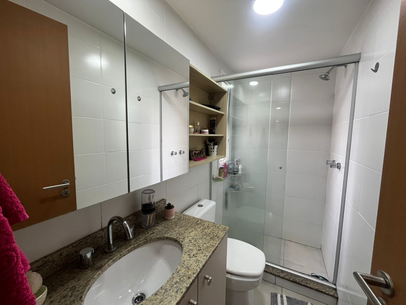 A cozinha é tipo americana e fica completa com geladeira, forno elétrico, cooktop e microondas. Tem churrasqueira eárea de serviço com máquina de lavar e secar roupas e aquecedor de água a gás.