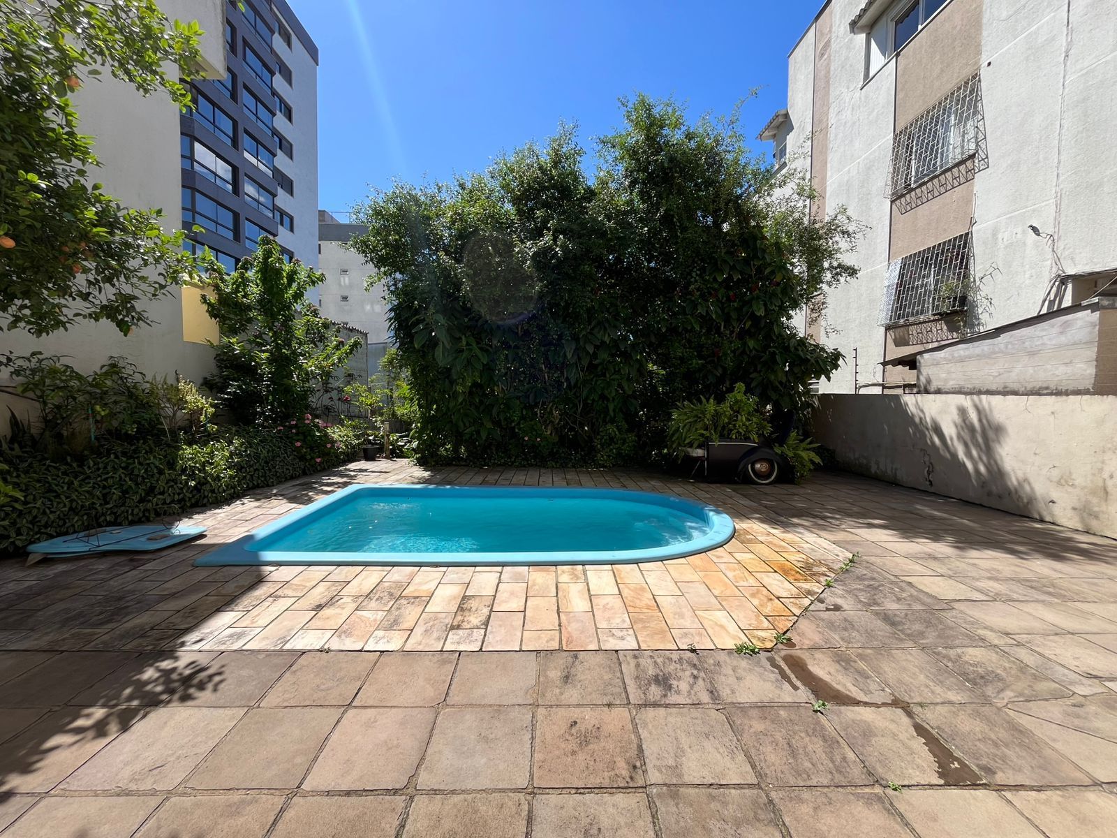 Conta com área na frente e pátio nos fundos, grande, com piscina, horta e uma área coberta perfeita para salão de festas, com churrasqueira.