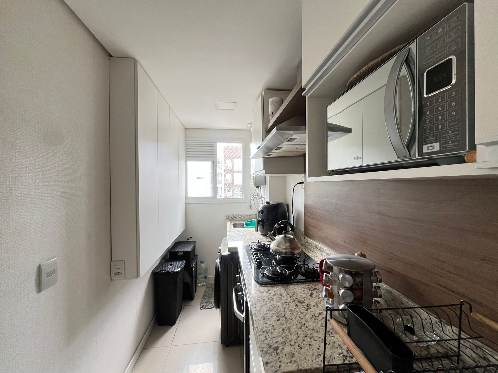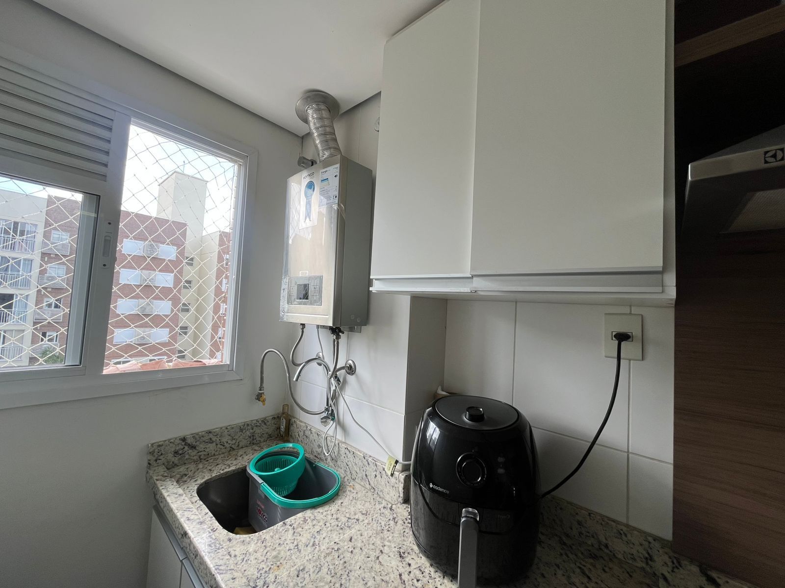 A cozinha é montada, equipada com coifa, fogão e aquecedor de passagem.