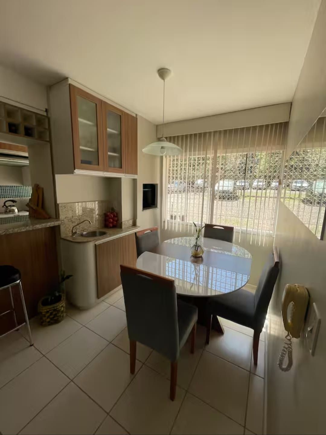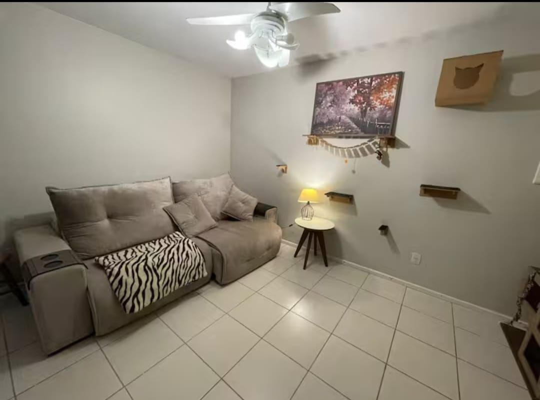 Living para 2 ambientes, cozinha montada, banheiro social com box de vidro.