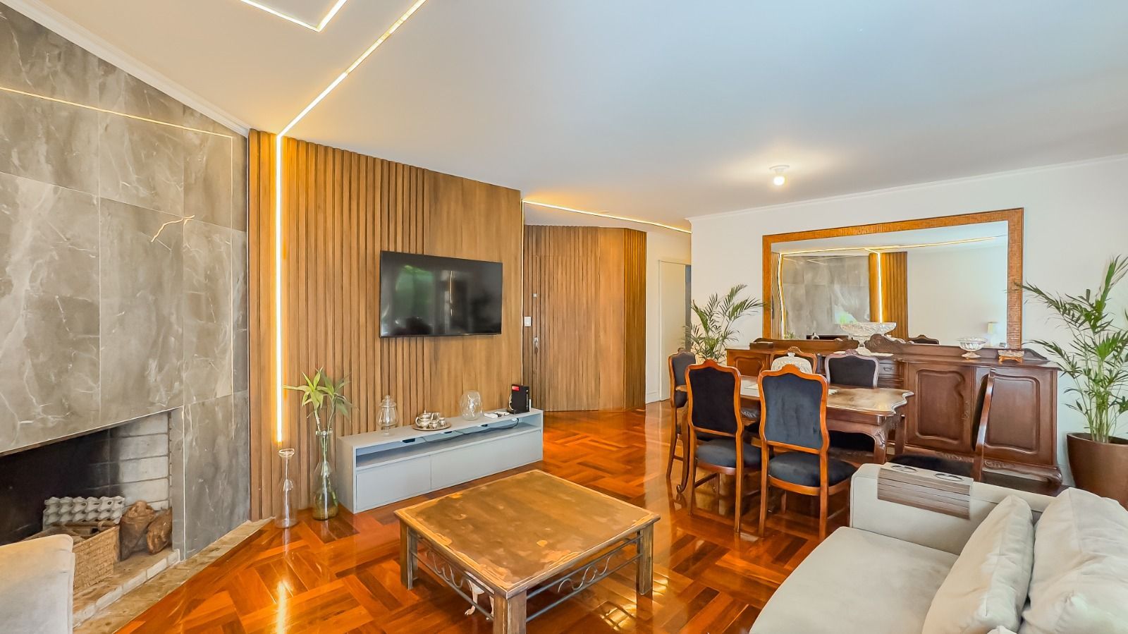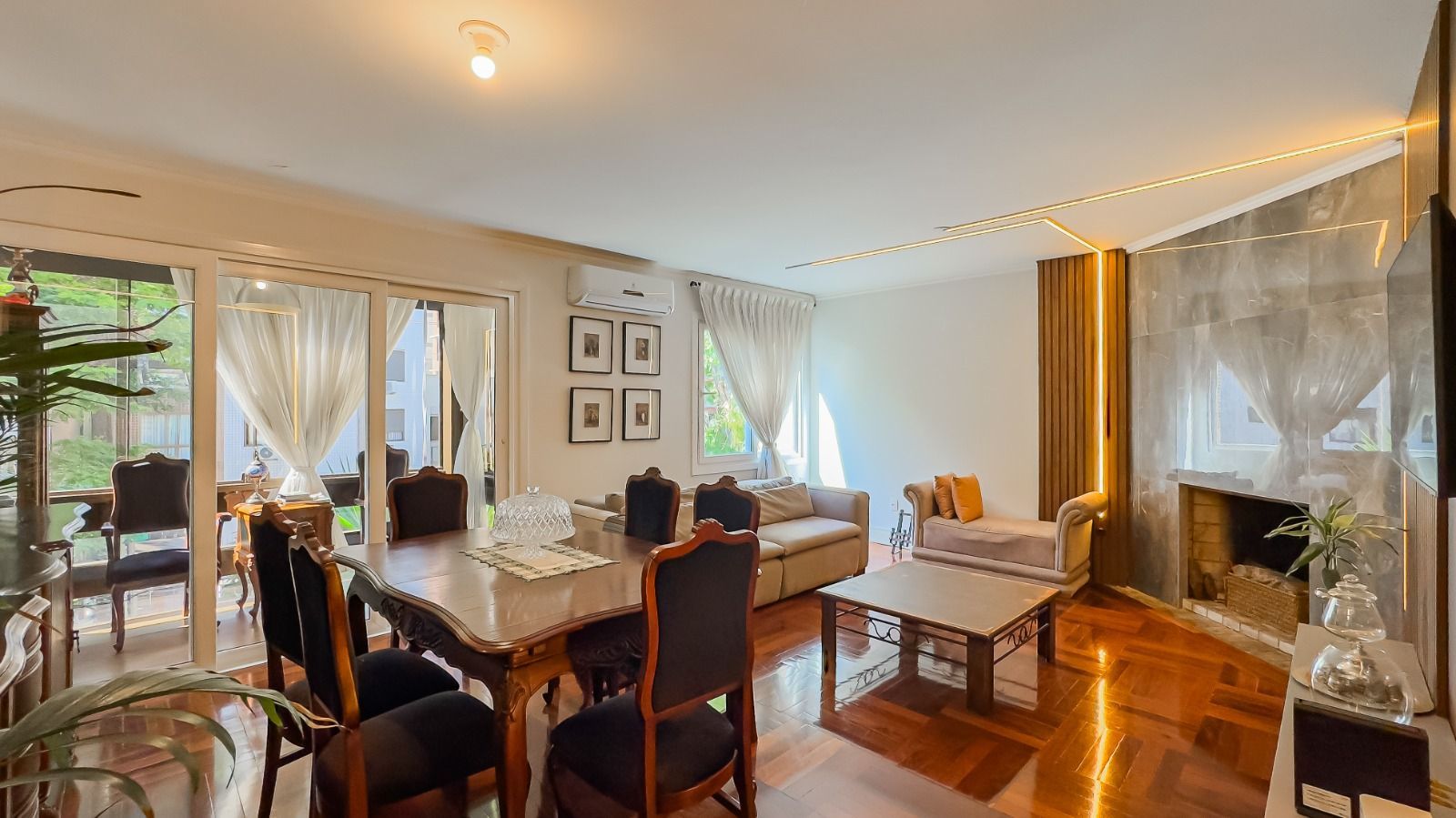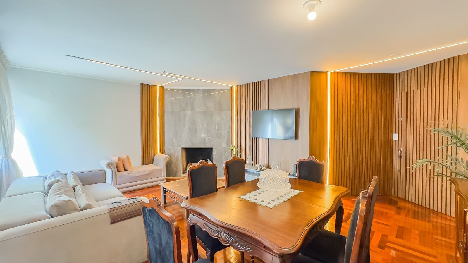 • Amplo living para dois ambientes com lareira e sacada fechada