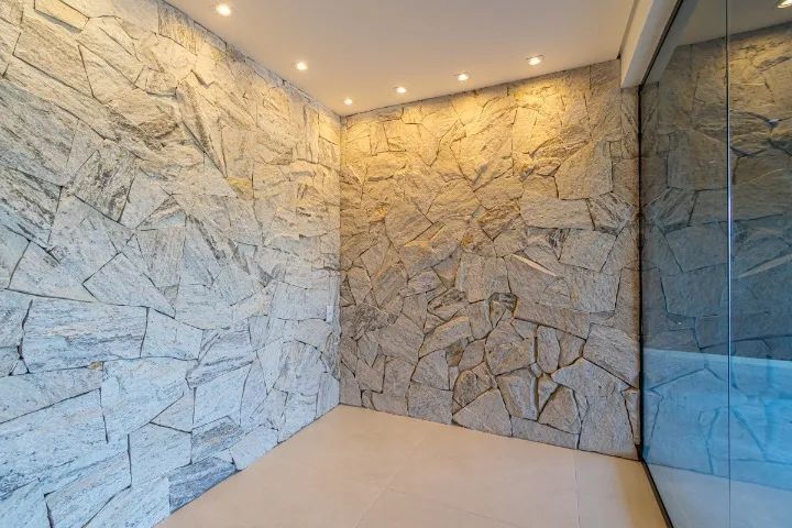 Entrada imponente com madeira ripada em Grápia e pedras naturais
