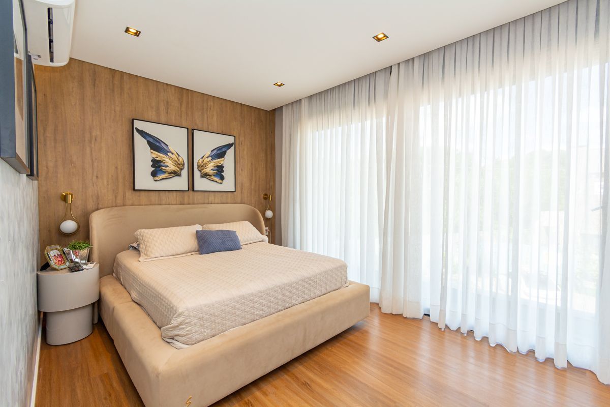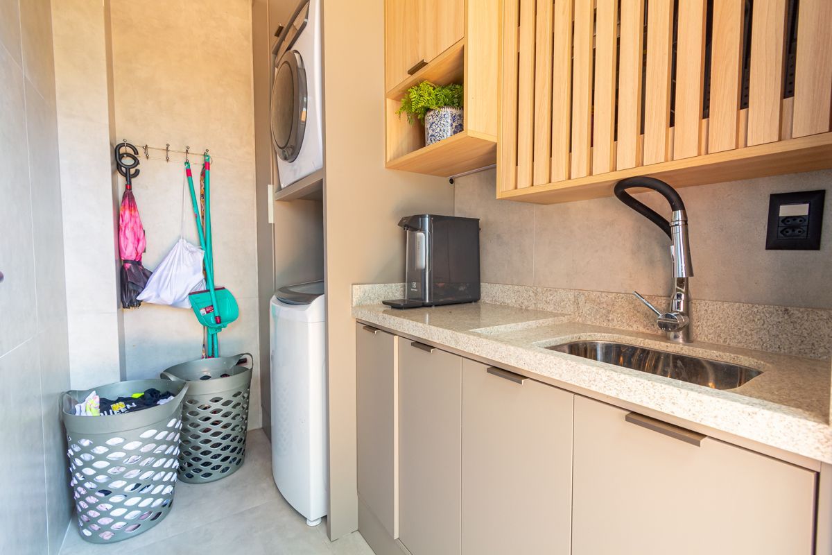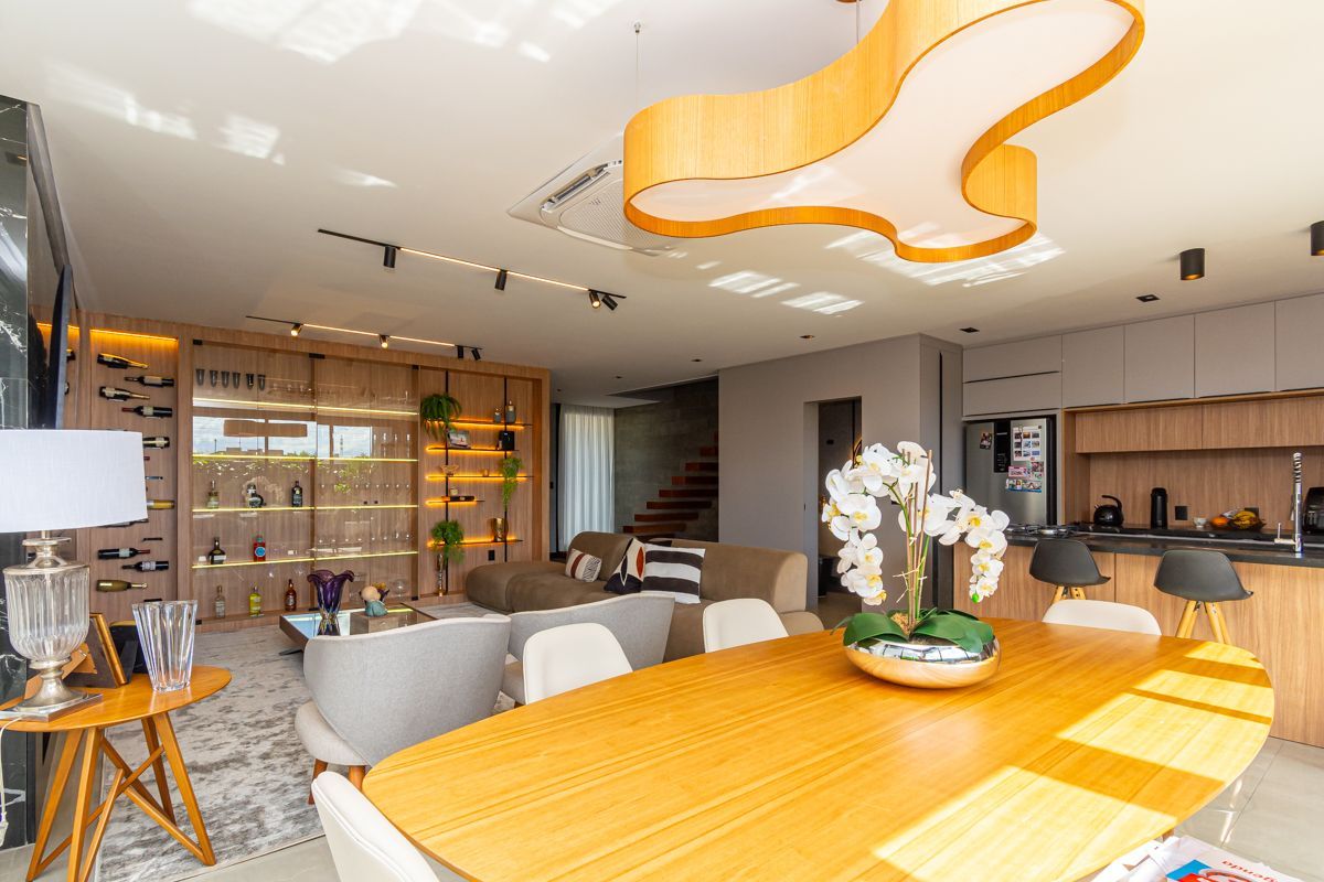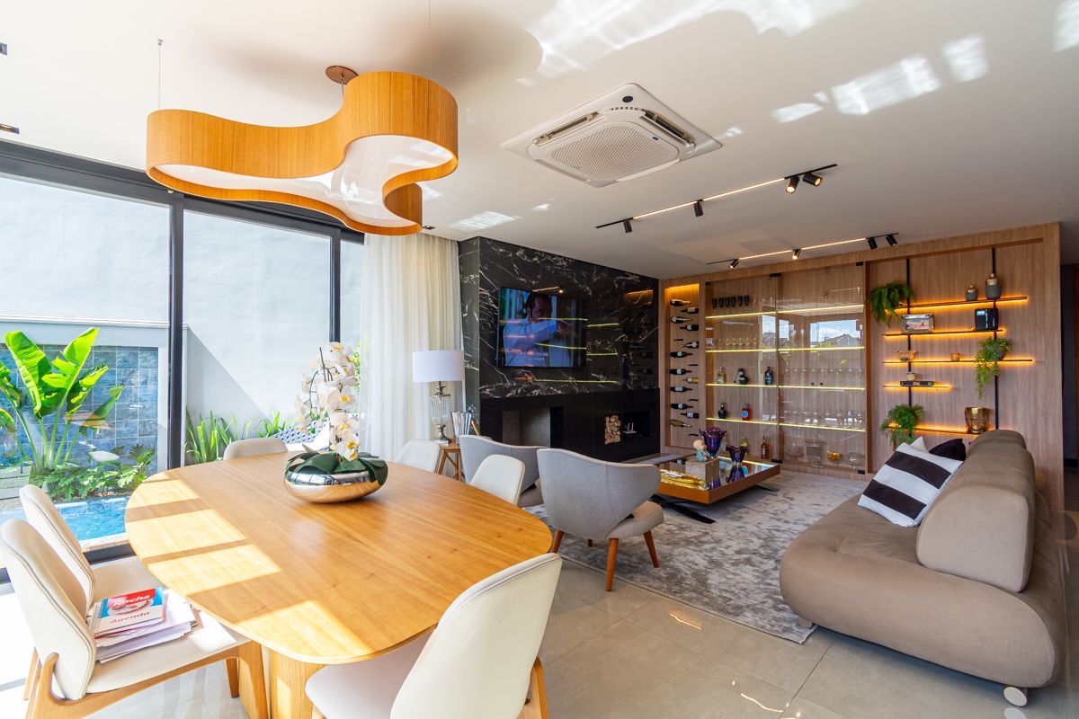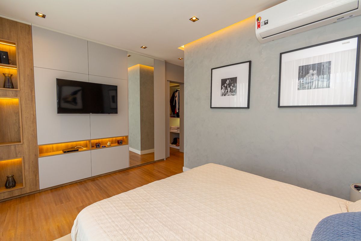 Será entregue totalmente equipada: cozinha planejada com ilha e eletrodomésticos, marcenaria na sala, ar-condicionado instalado, lavanderia montada, suíte com closet completo e três dormitórios mobiliados.
