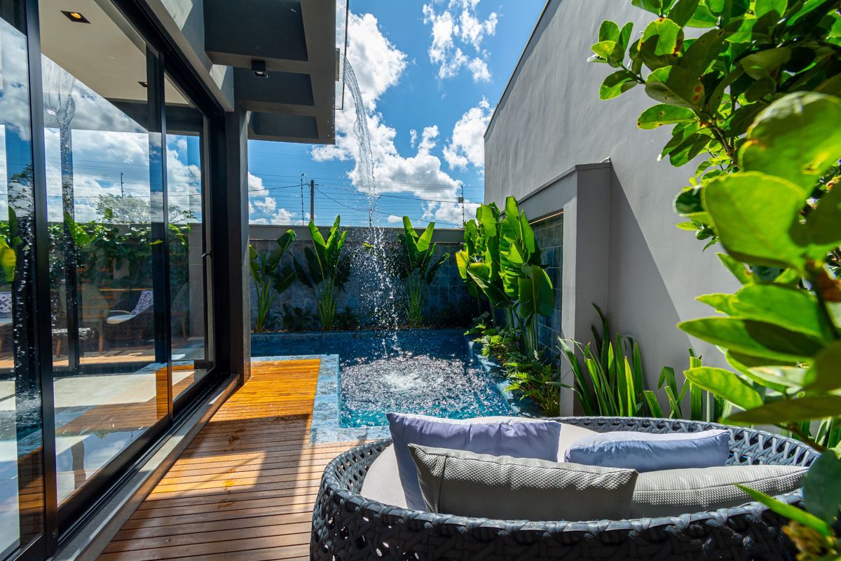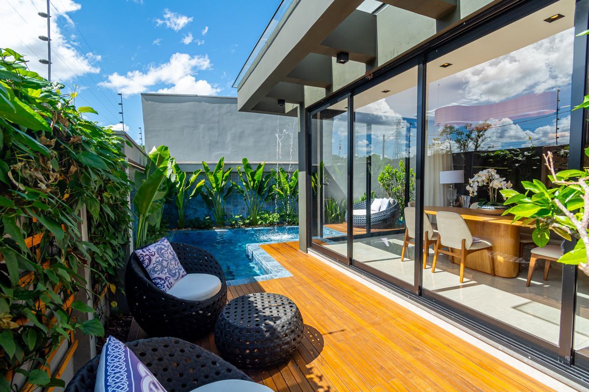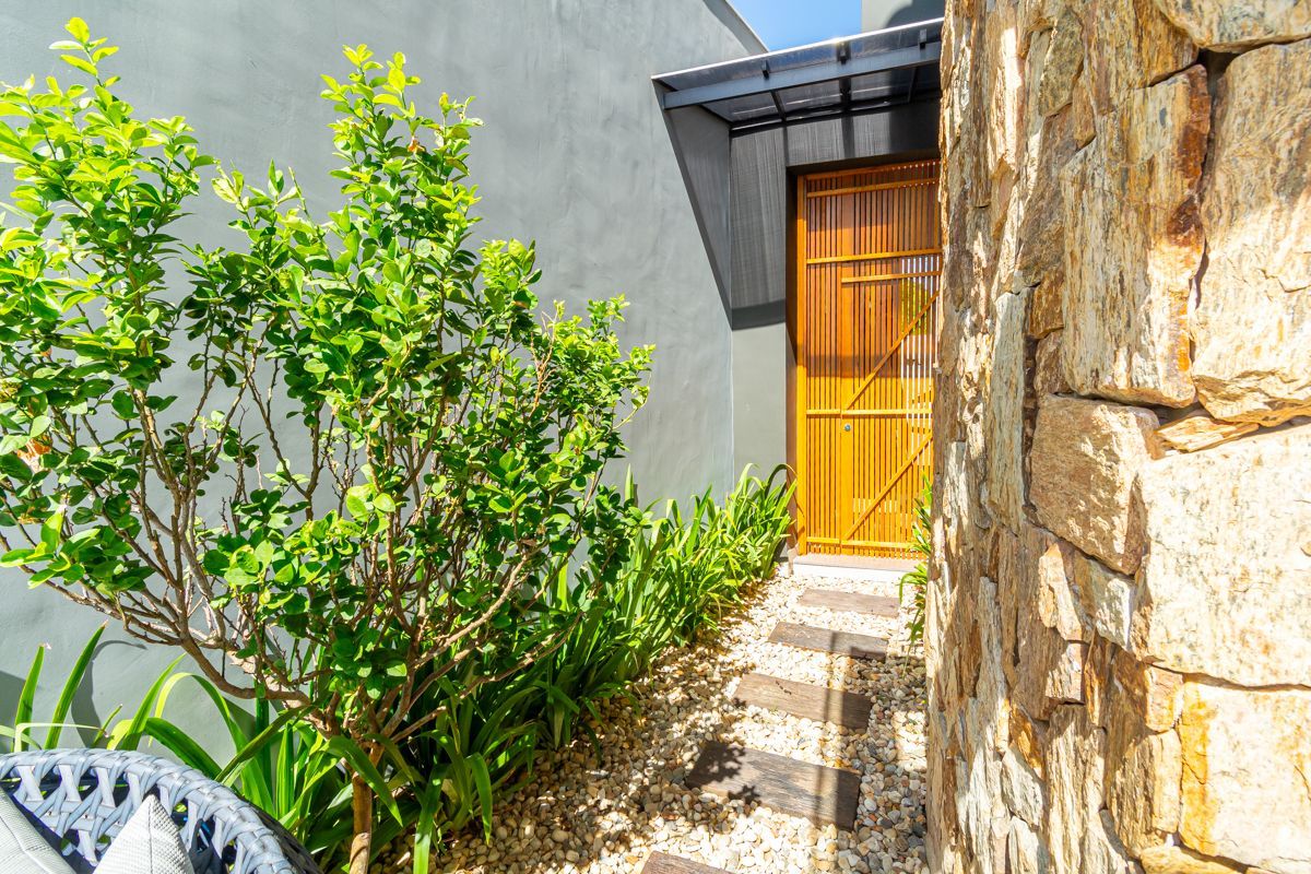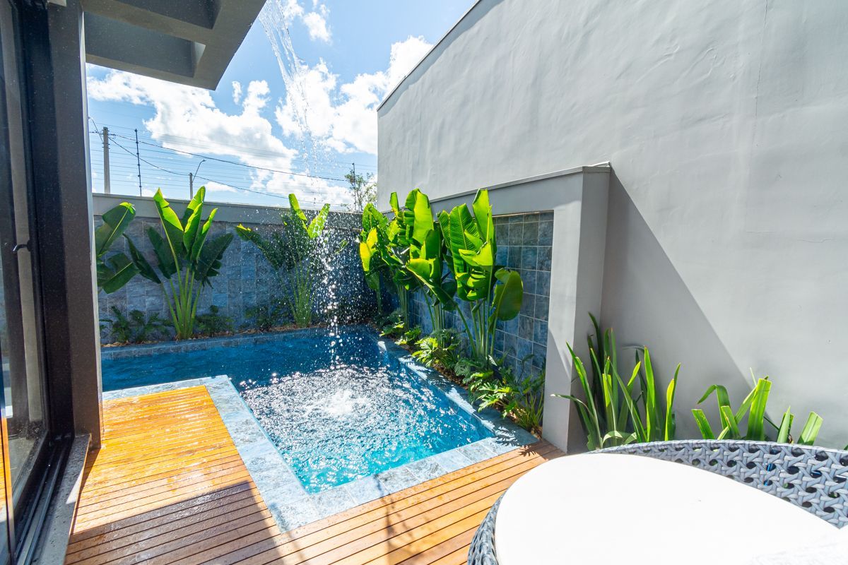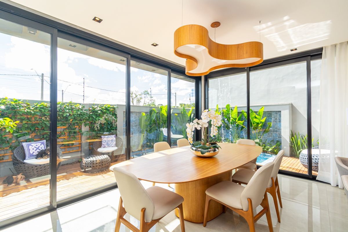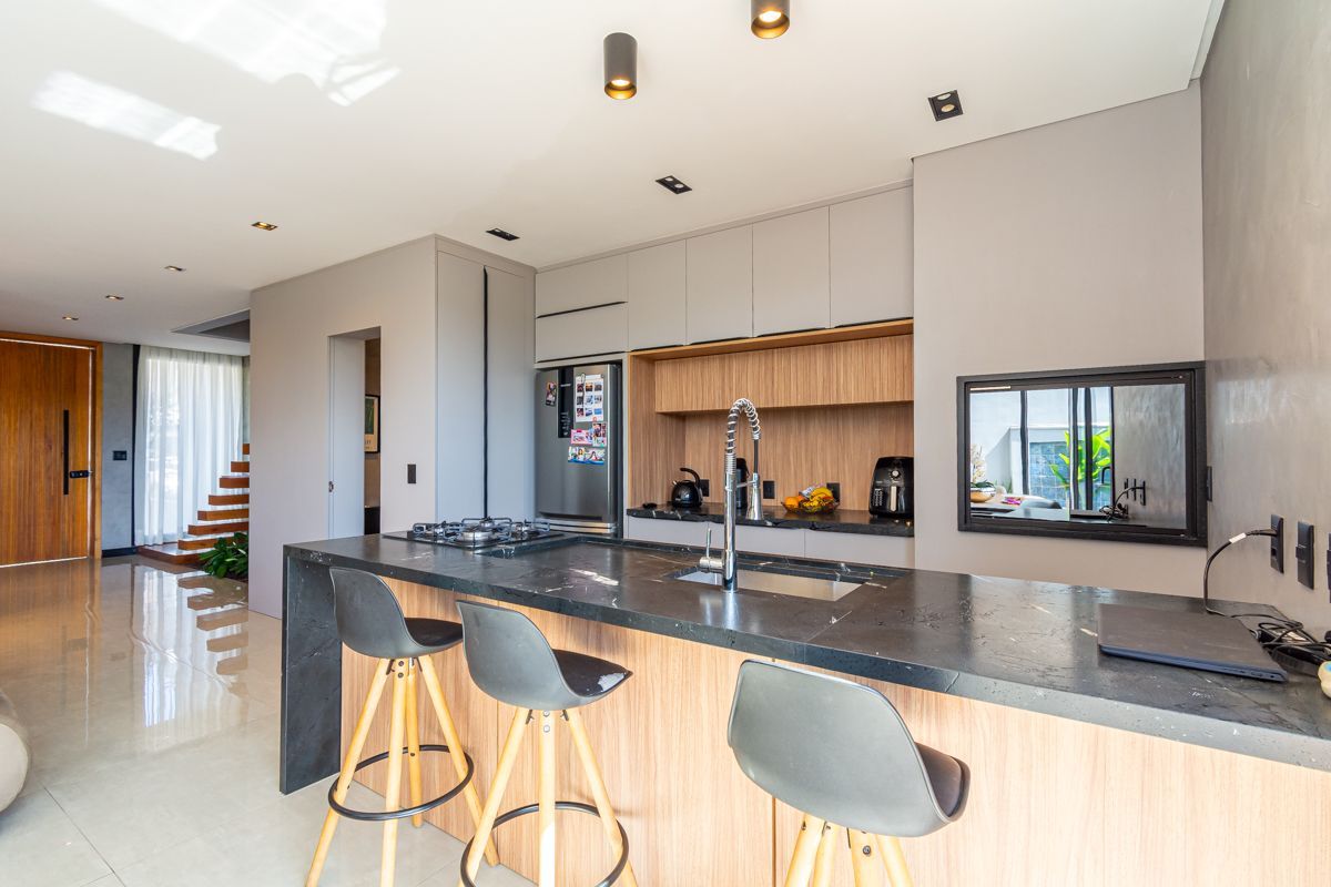 A residência conta com quatro dormitórios, incluindo uma suíte master com closet, escada flutuante e living integrado. Possui piscina em concreto com aquecimento solar, ideal para relaxar em qualquer época do ano.