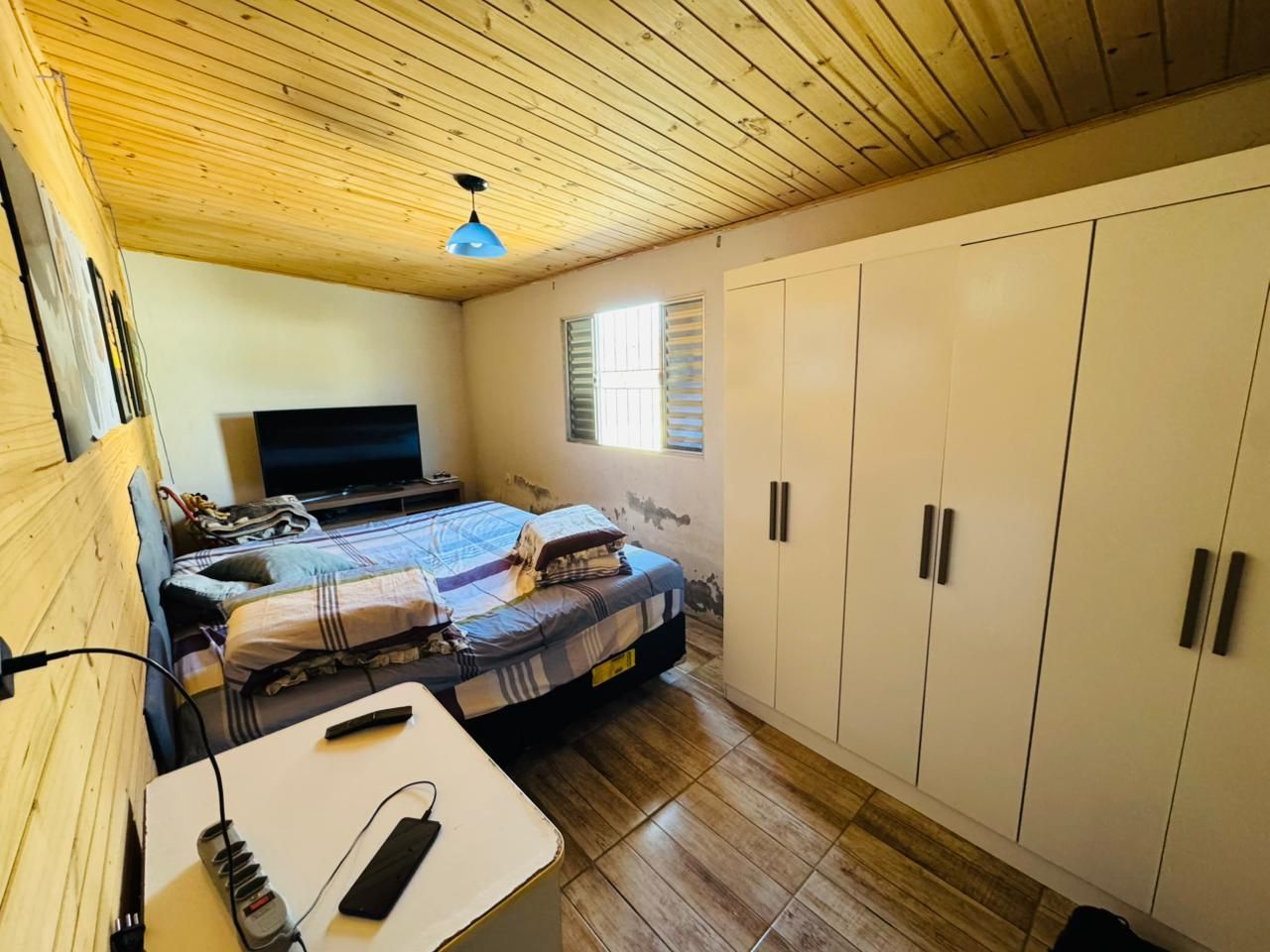Garagem coberta 4x6m com quiosque e churrasqueira, sala e varanda integradas (4x7m), cozinha com bancada revestida, 3 dormitórios (2 com ar-condicionado), banheiro e corredor.