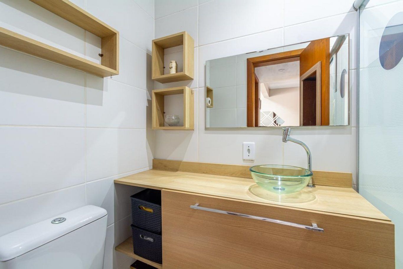 Banheiro com móveis planejados e box de vidro, ventilação natural.