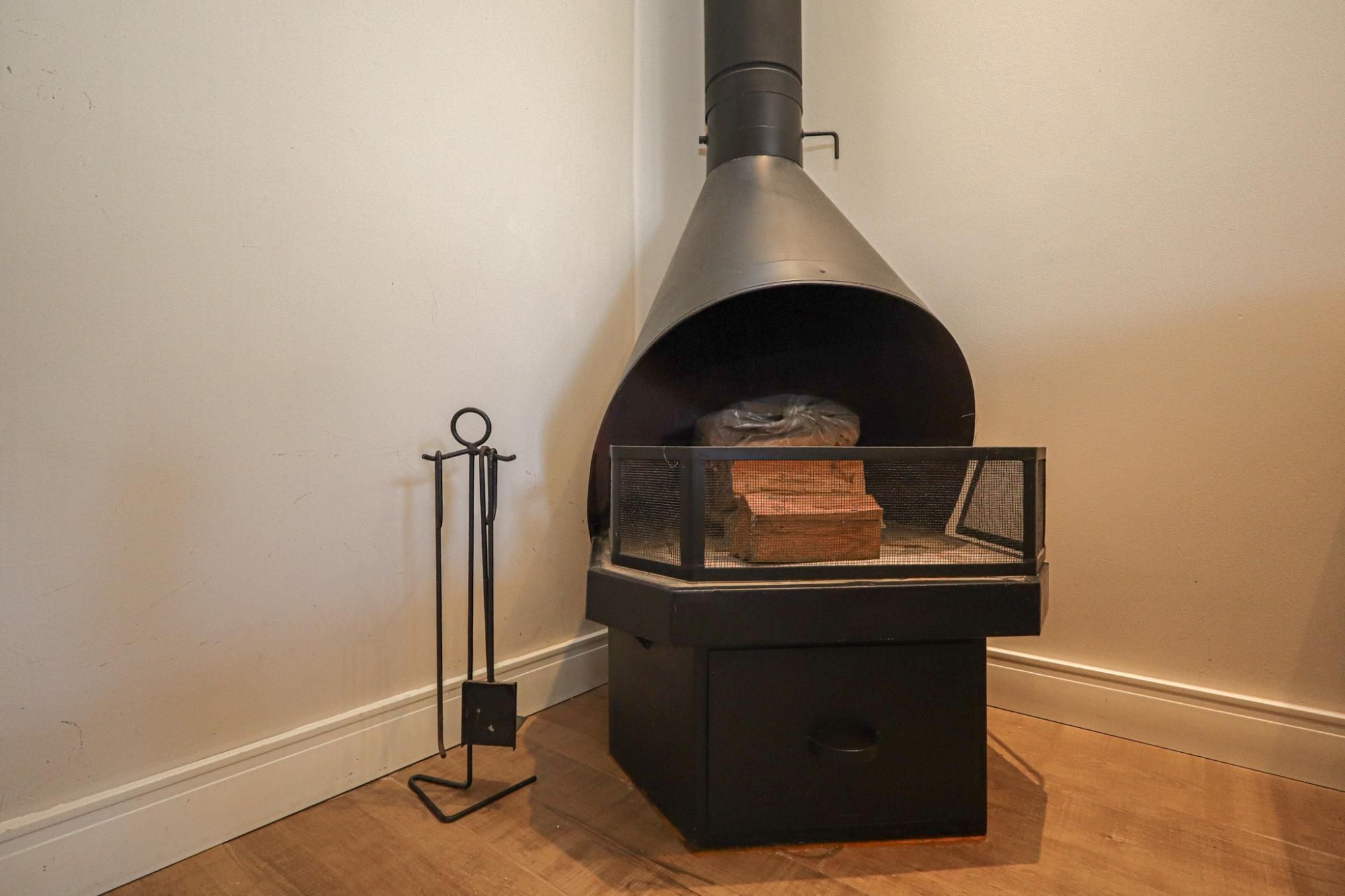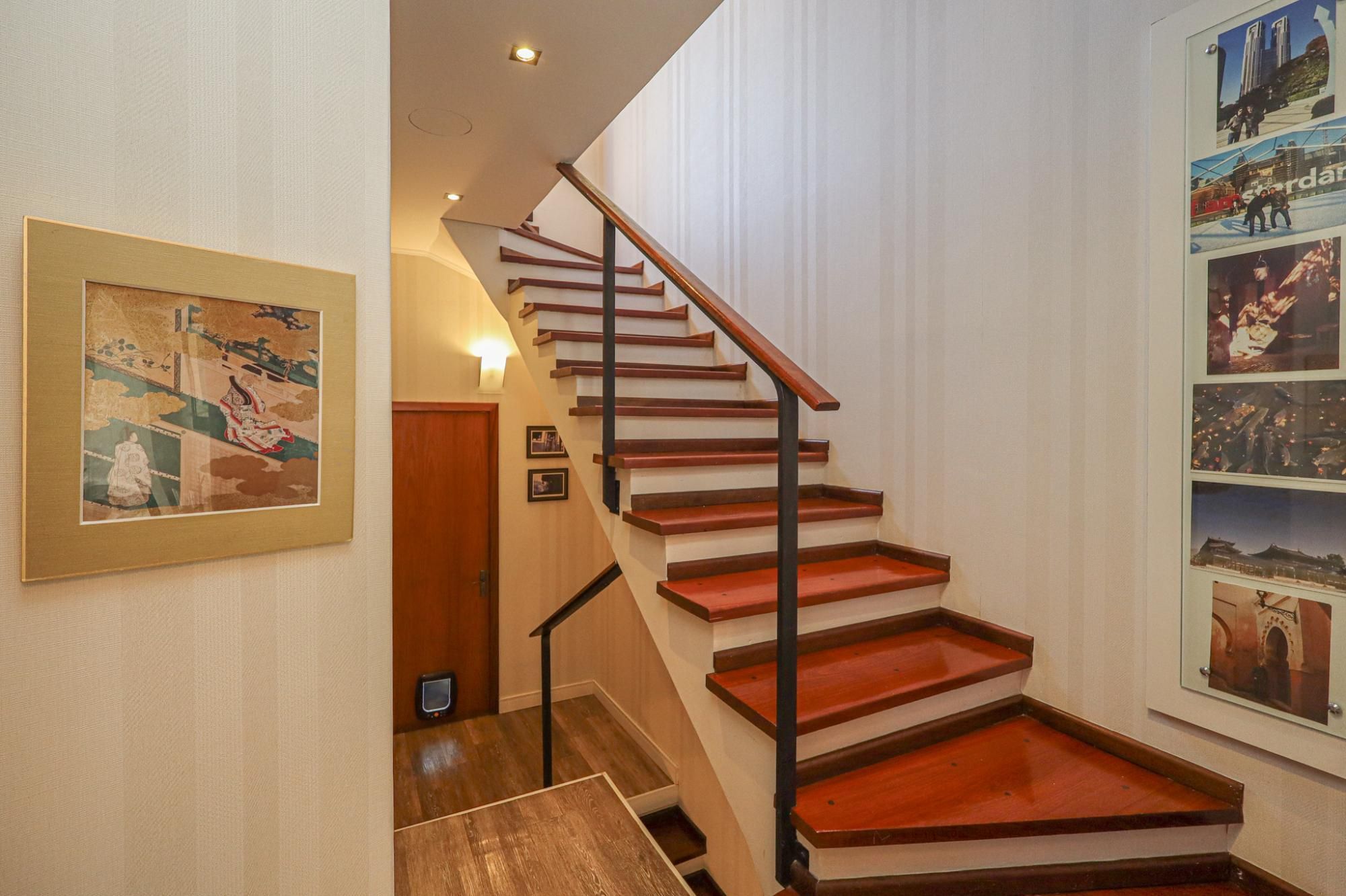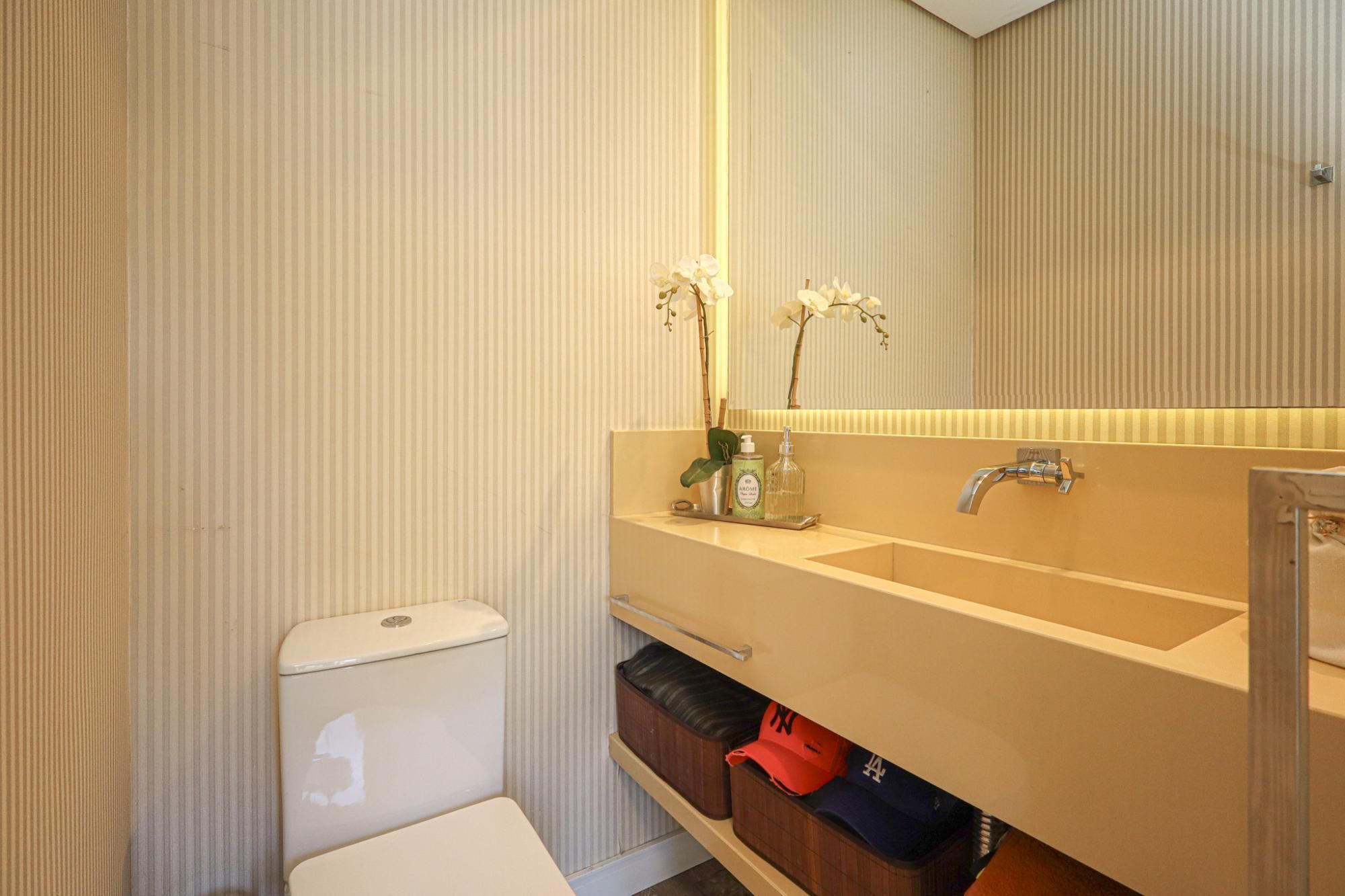 O terceiro pavimento conta com sala de estar íntima com lareira e duas sacadas — uma aberta com churrasqueira e outra fechada, utilizada como lavanderia com armários.