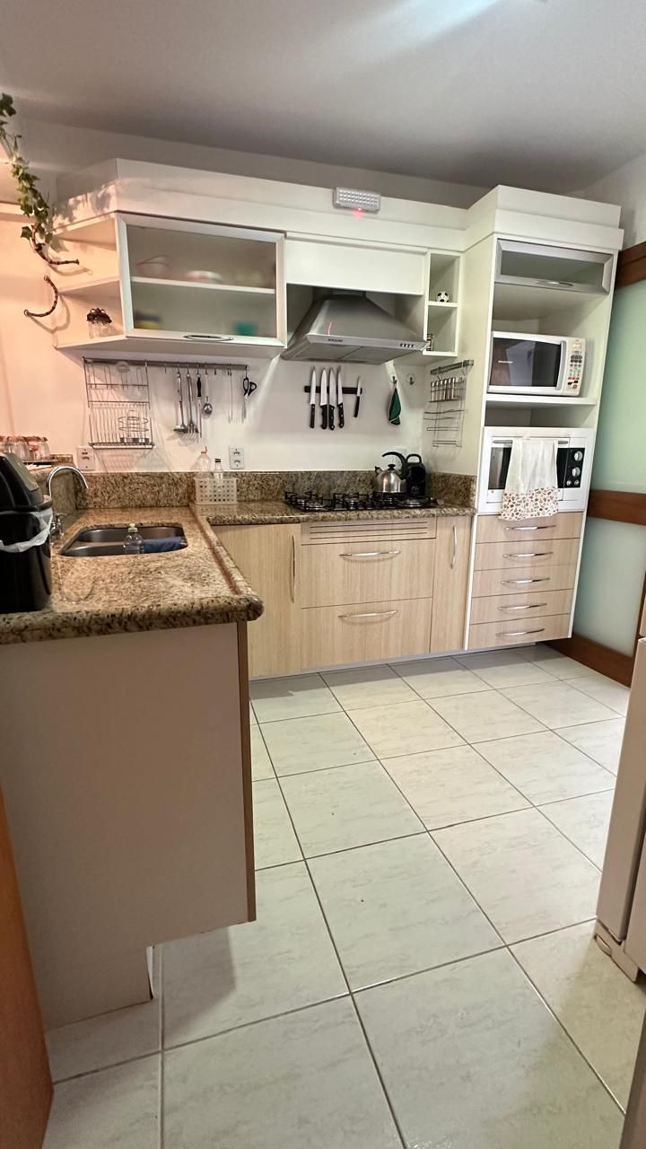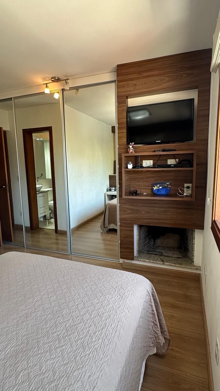 Dois dormitórios, sendo uma suíte com closet e lareira, cozinha ampla com passa pratos, área de serviços independente.