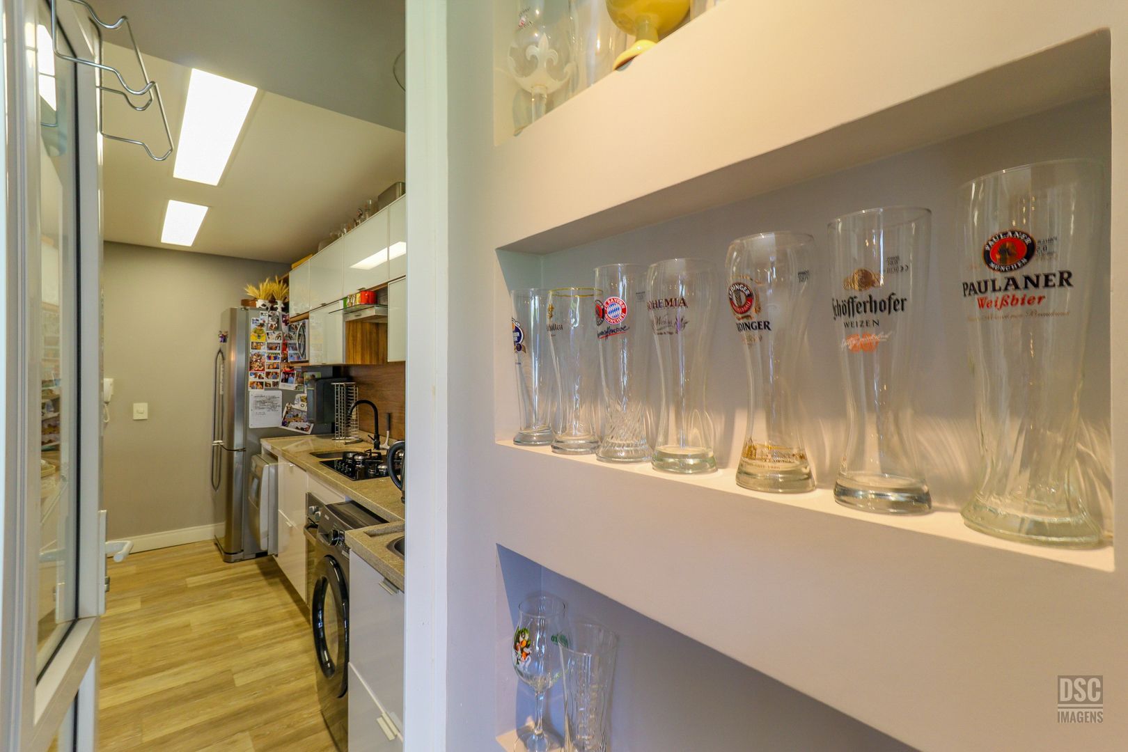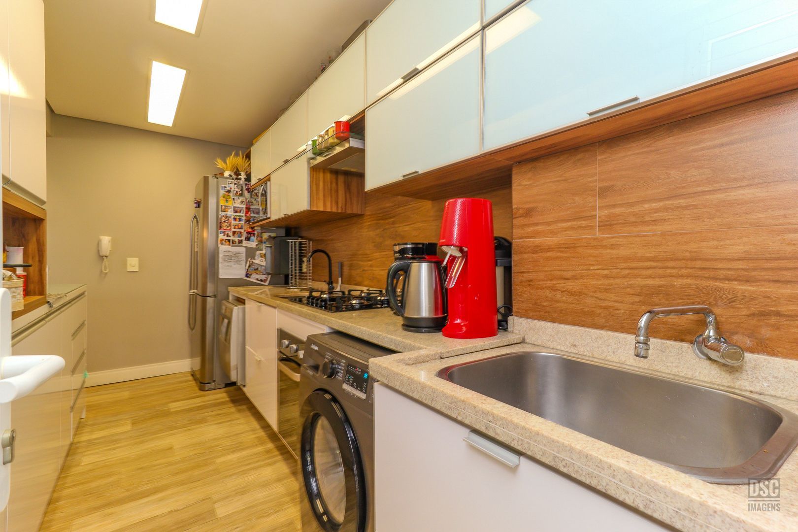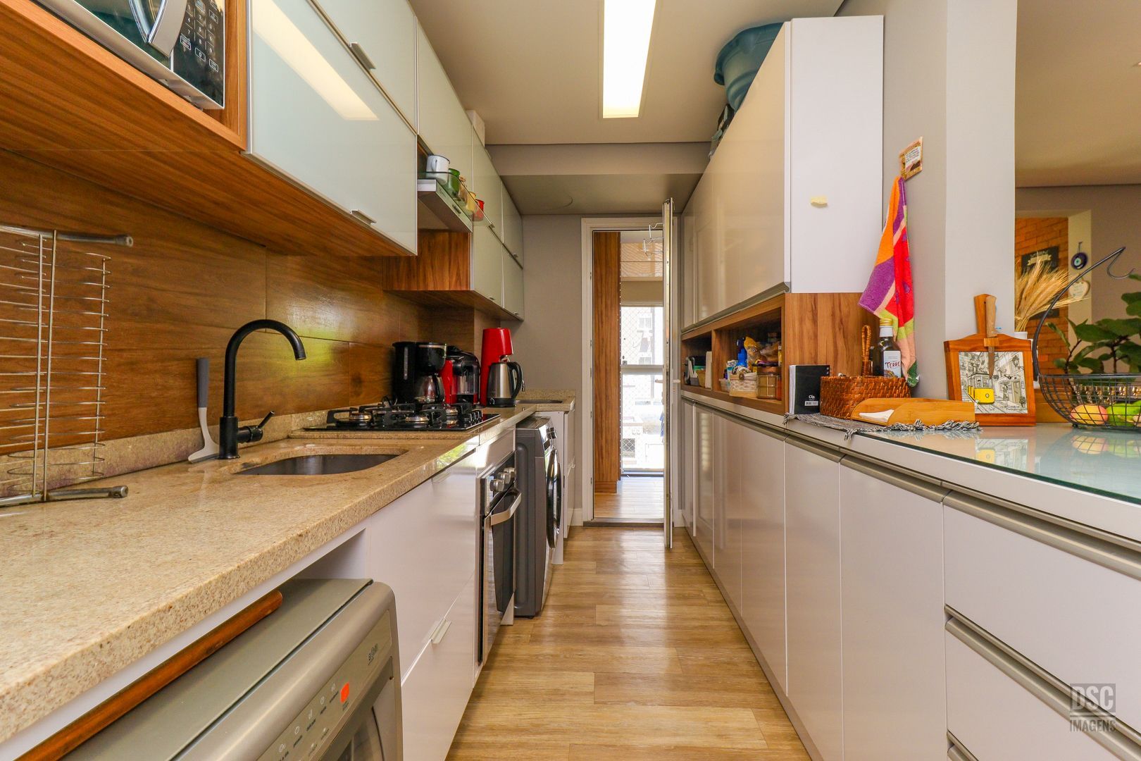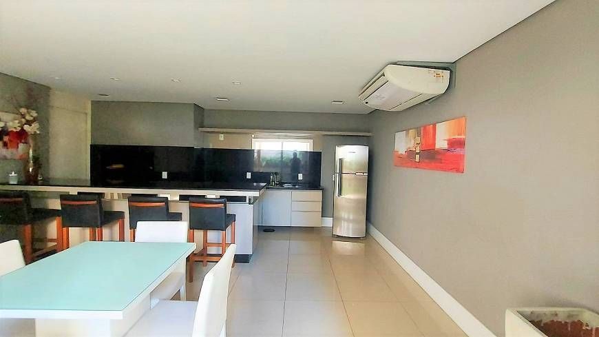 3 quartos ( transformado em 2 com living estendido), suíte, cozinha americana, sacada fechada com churrasqueira e 2 vagas de garagem.