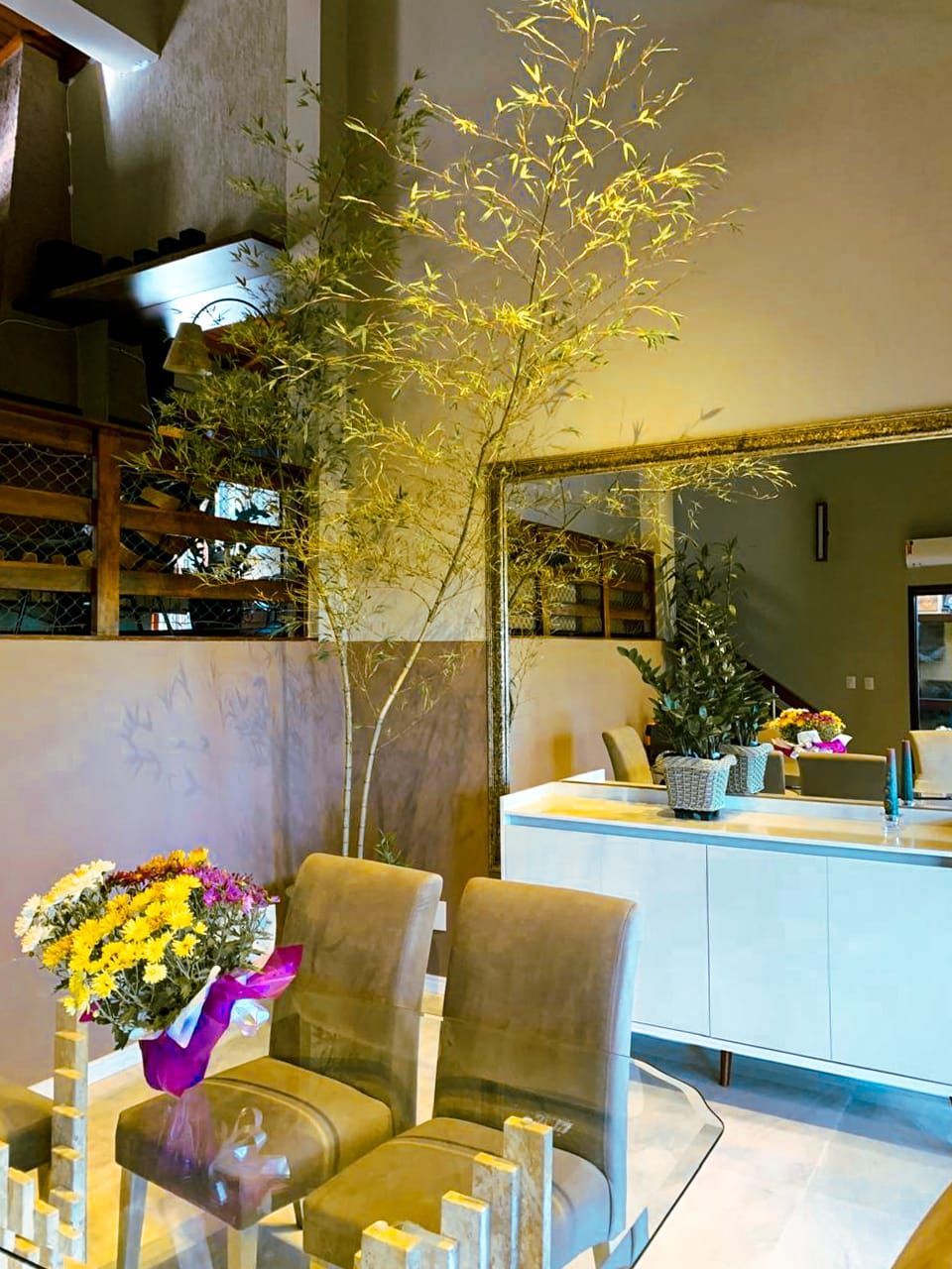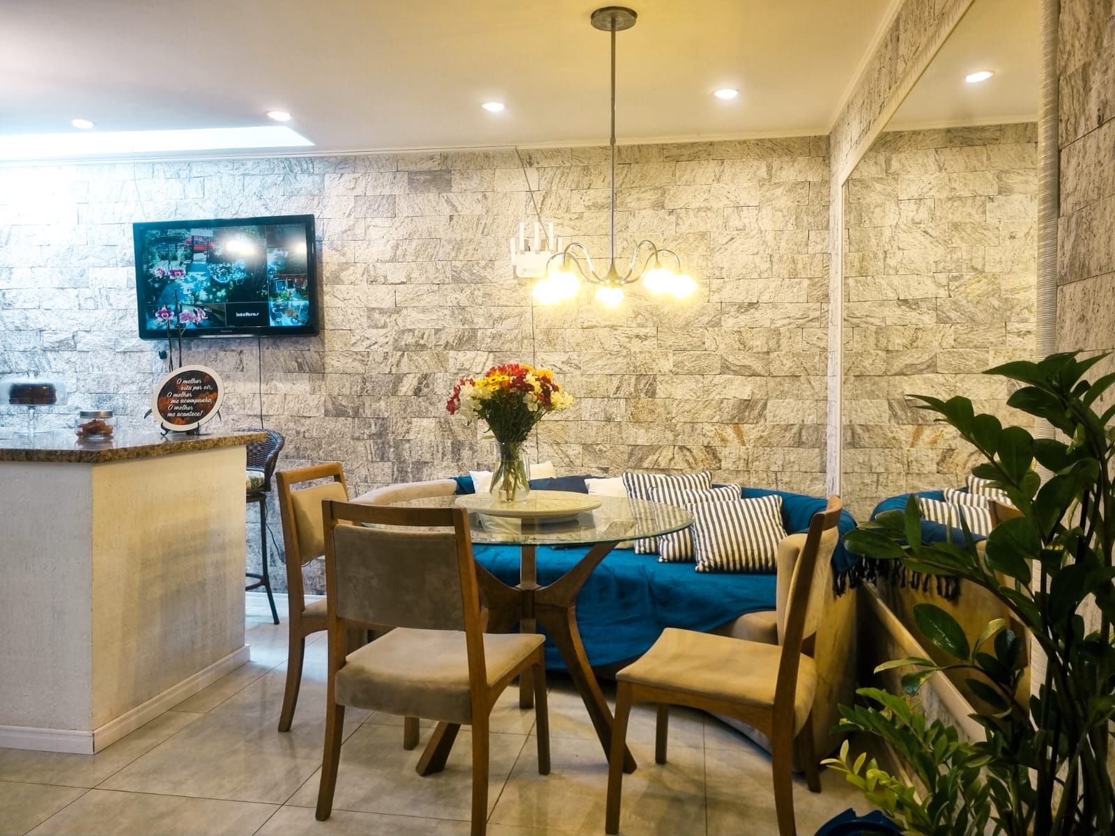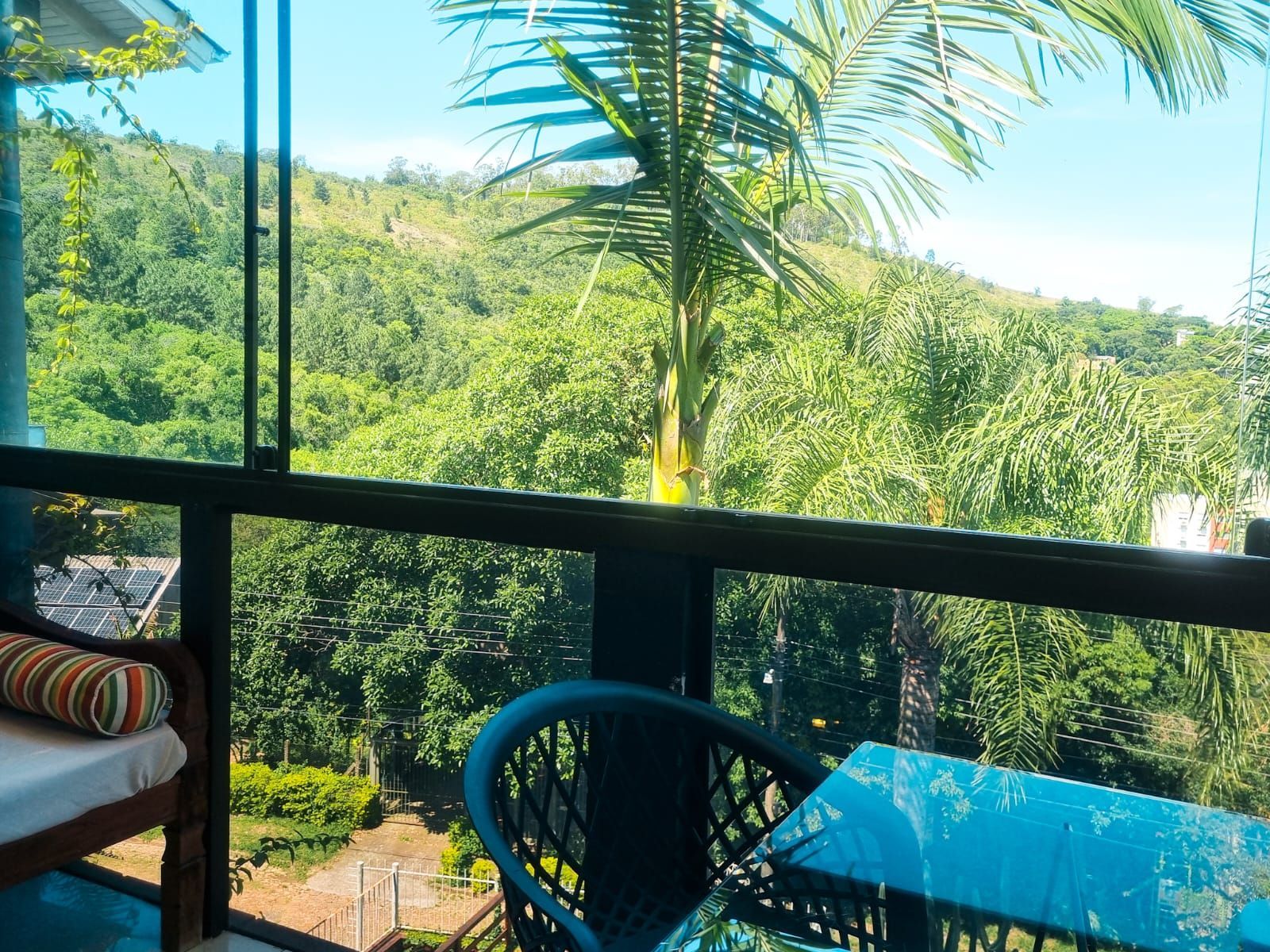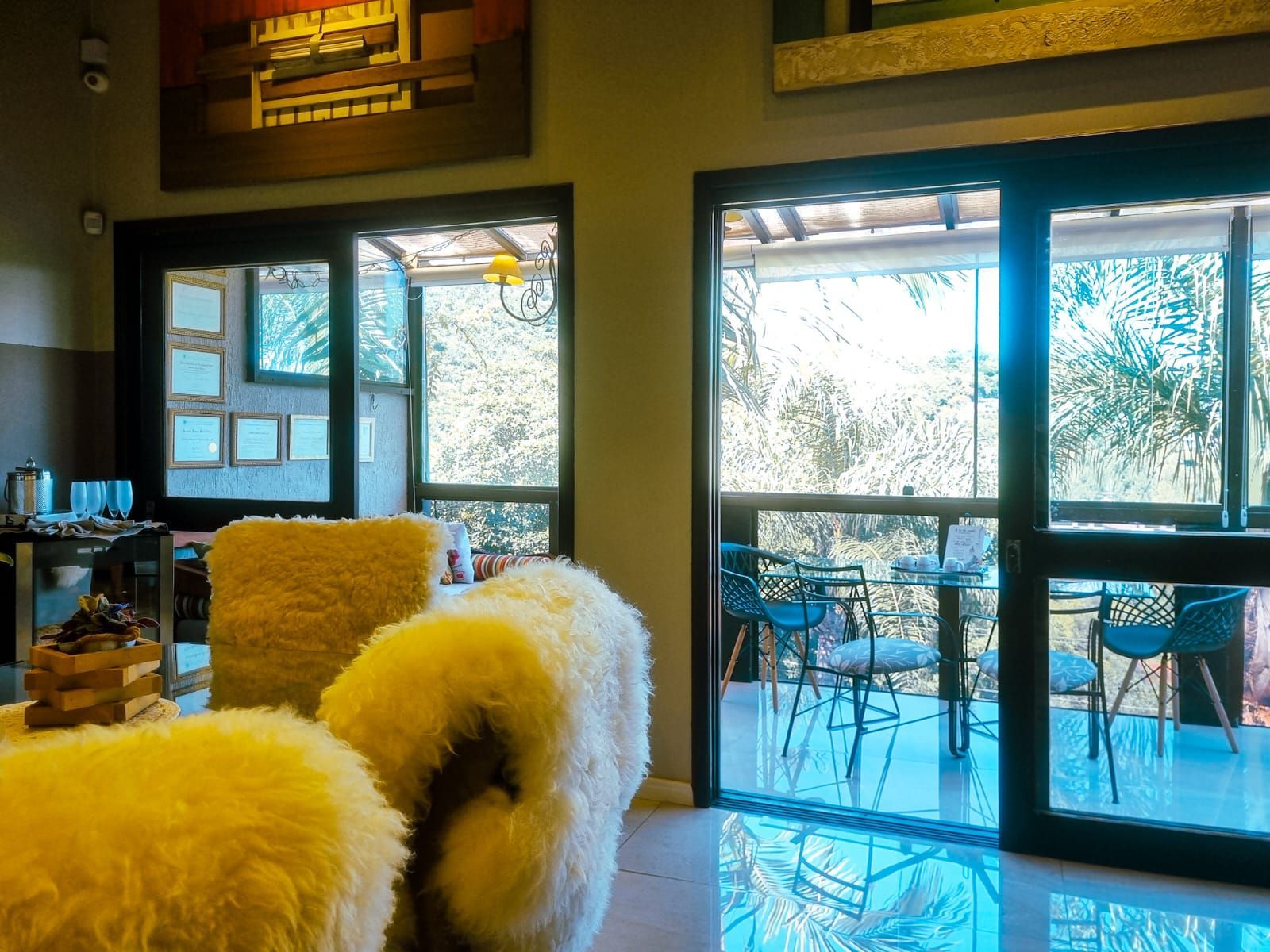 A sala de estar principal conta com pé direito elevado e um charmoso mezanino, que oferece vista para uma segunda sala com varanda envidraçada, permitindo apreciar o visual completo do morro com muita luminosidade natural.