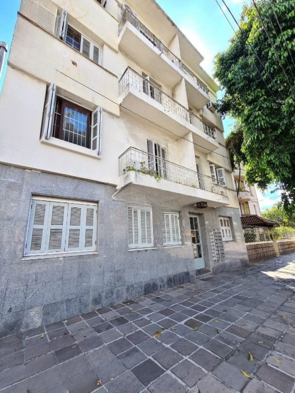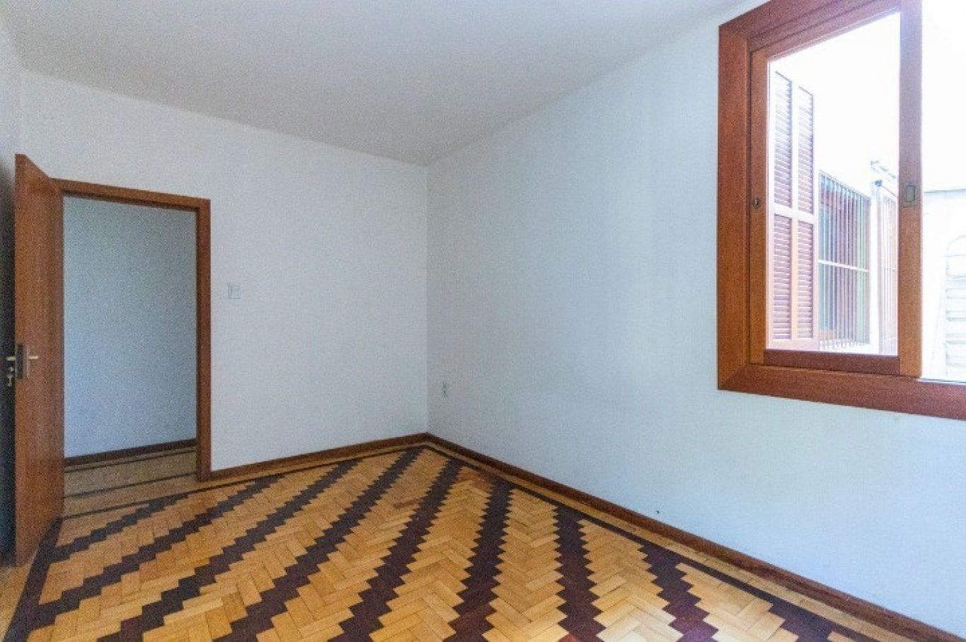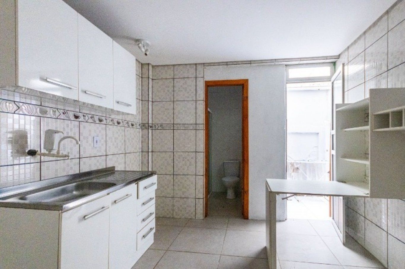 Apartamento Garden de 57m² no Bairro Farroupilha, com 2 quartos, sala ampla com piso em parquet, cozinha espaçosa e pequeno pátio nos fundos.