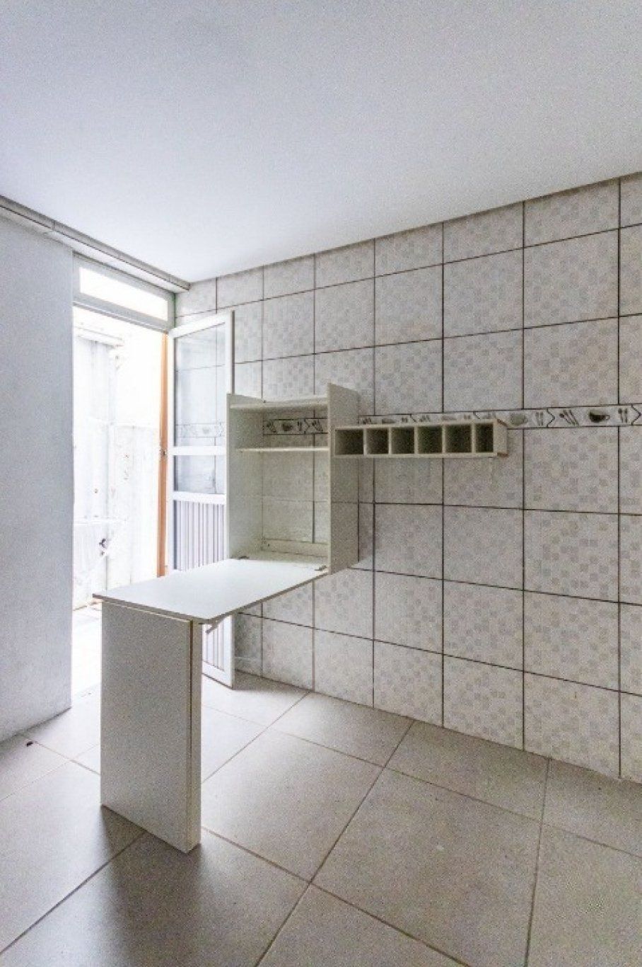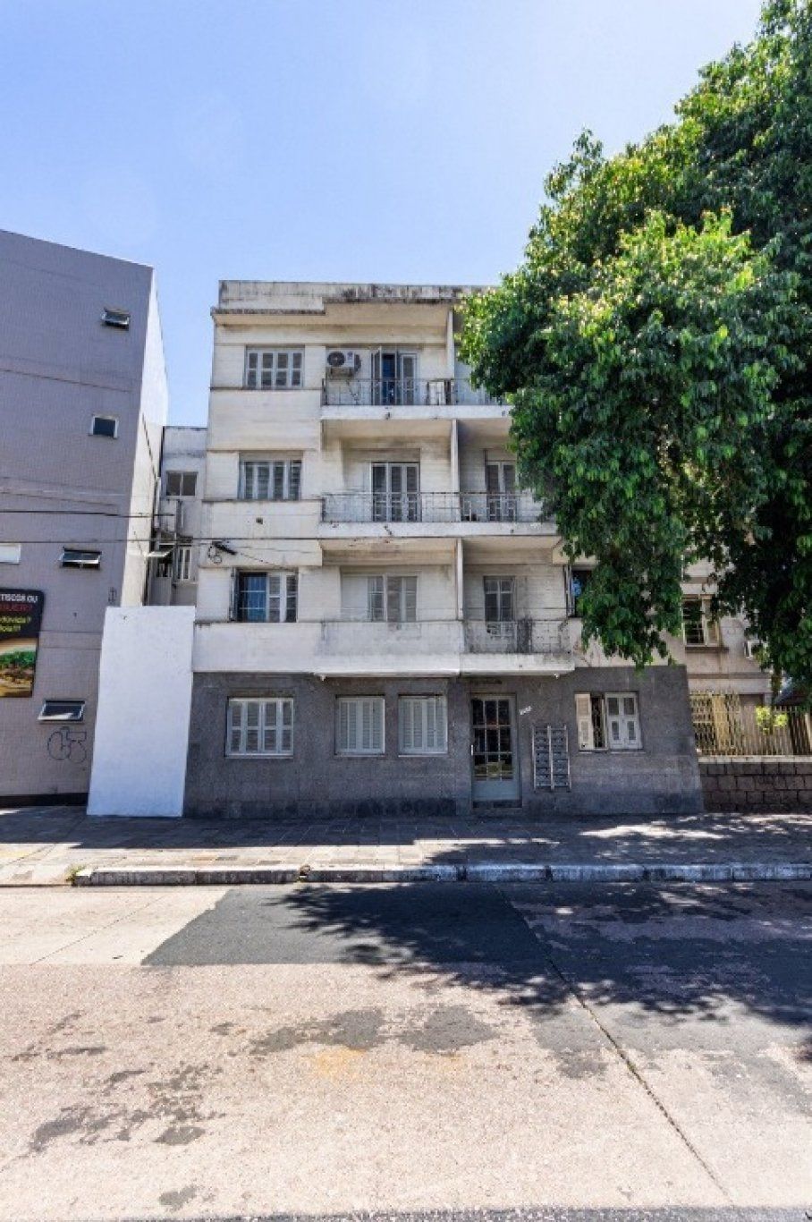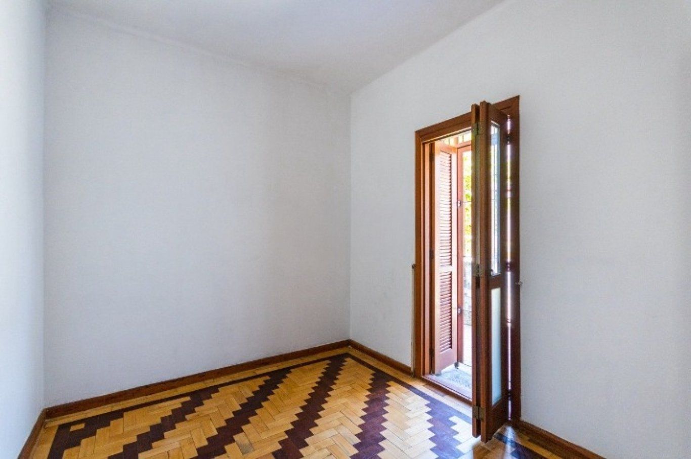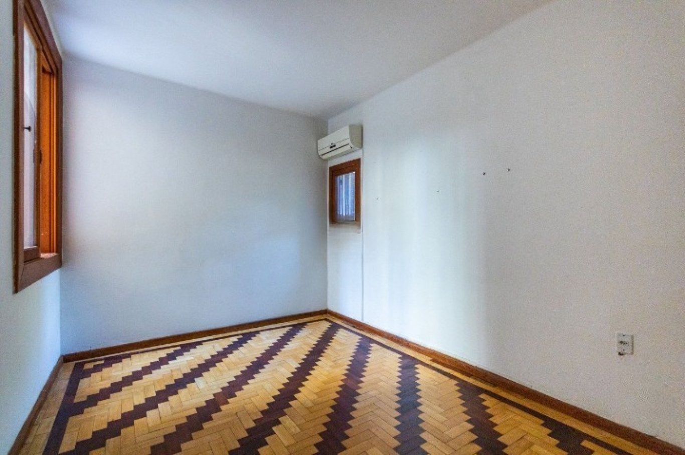 Apartamento Garden de 57m² no Bairro Farroupilha, com 2 quartos, sala ampla com piso em parquet, cozinha espaçosa e pequeno pátio nos fundos.