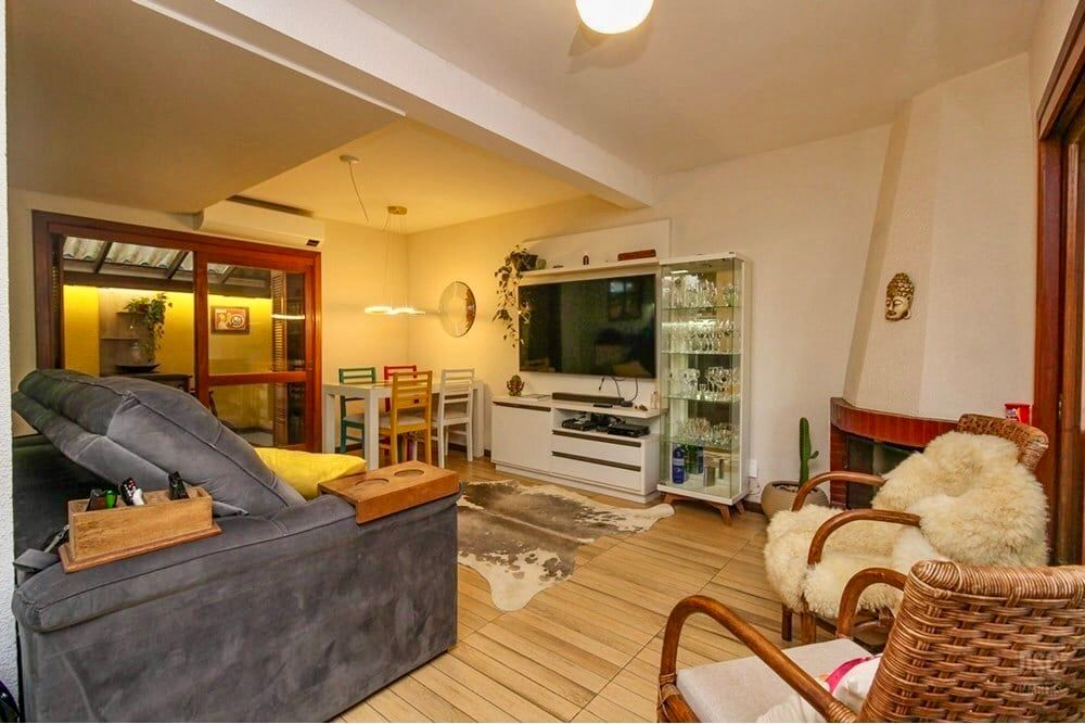 Living amplo em dois ambientes com lareira, cozinha americana mobiliada e integrada com a sala, banheiro social e outro auxiliar com armários.