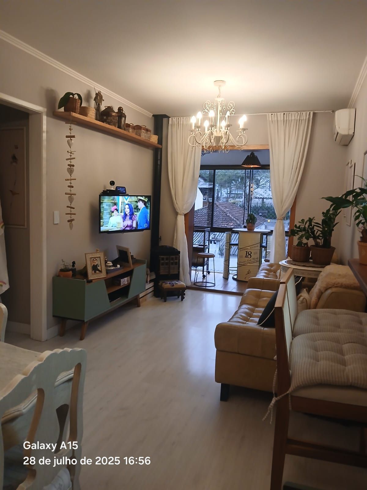 Living 2 ambientes com sacada fechada, churrasqueira e deck de madeira. Conta com 2 dormitórios, cozinha com armários e área de serviço separada. Fica o ar condicionado. Piso laminado e porcelanato. Vaga coberta e escriturada.
