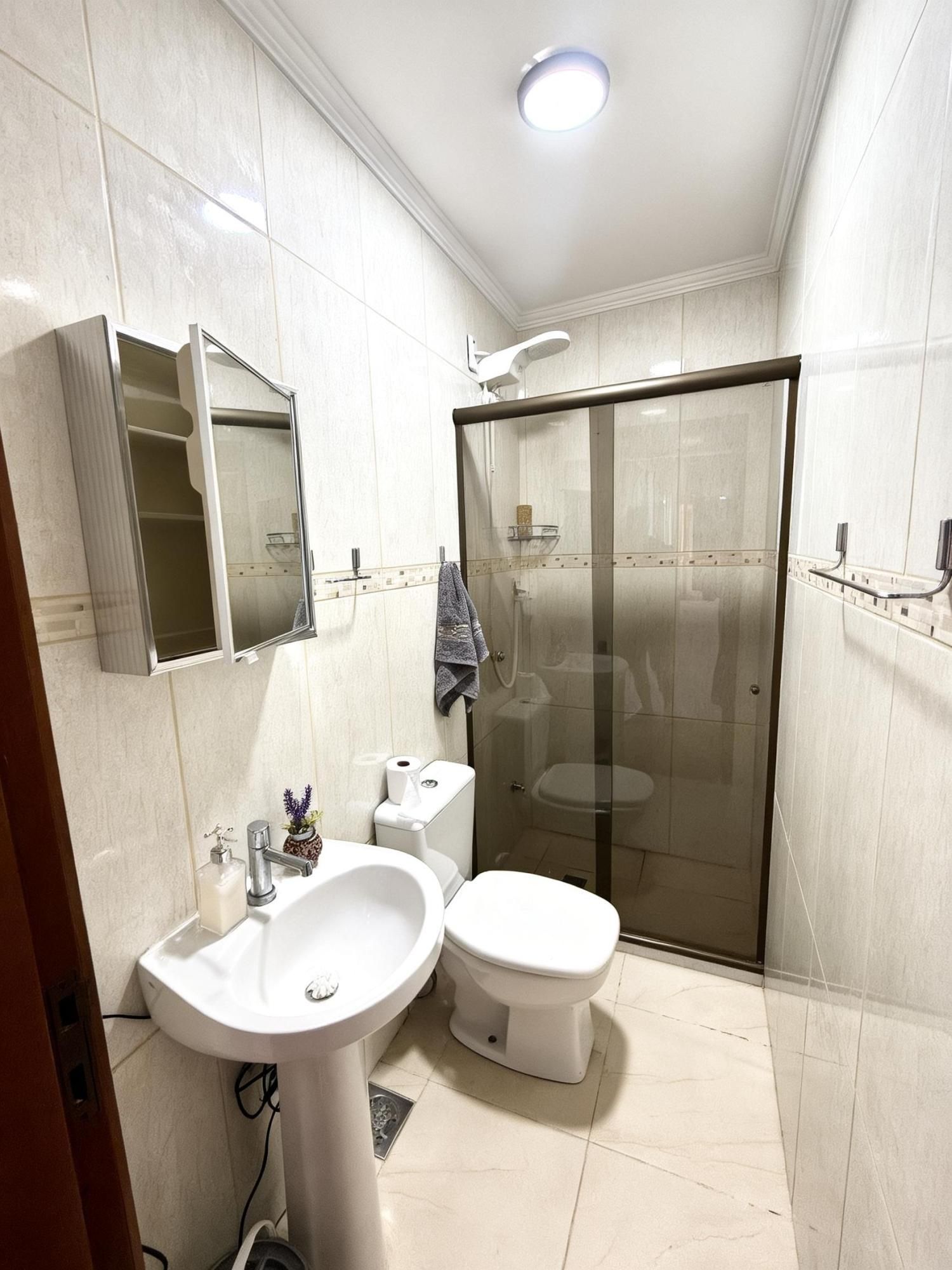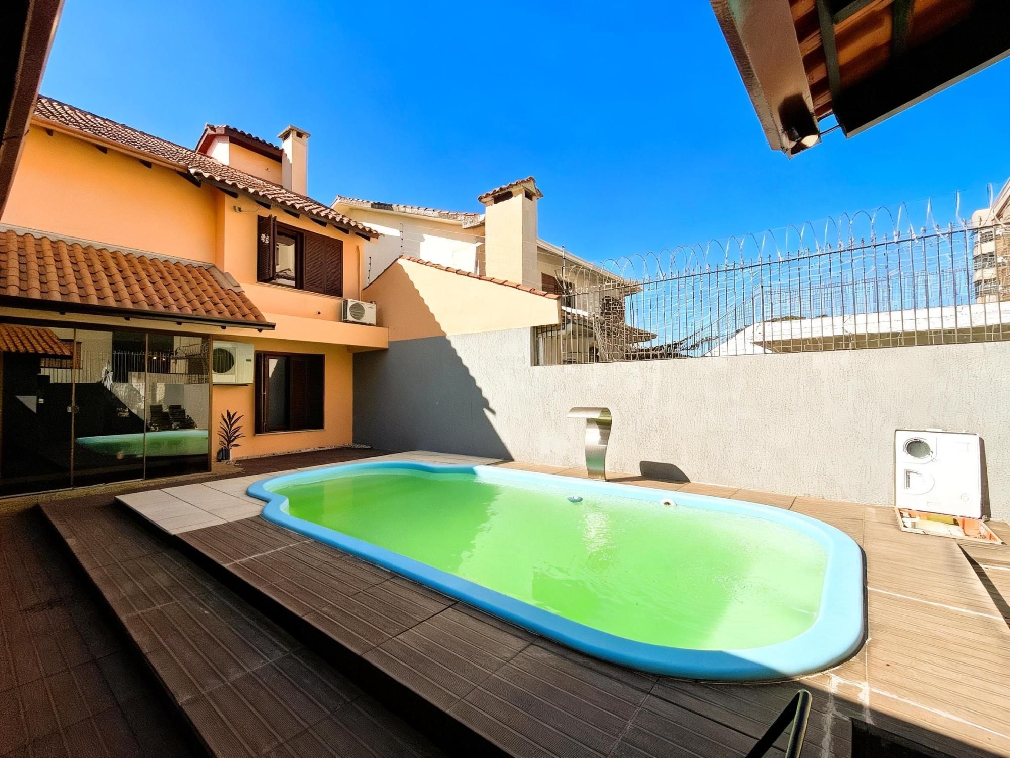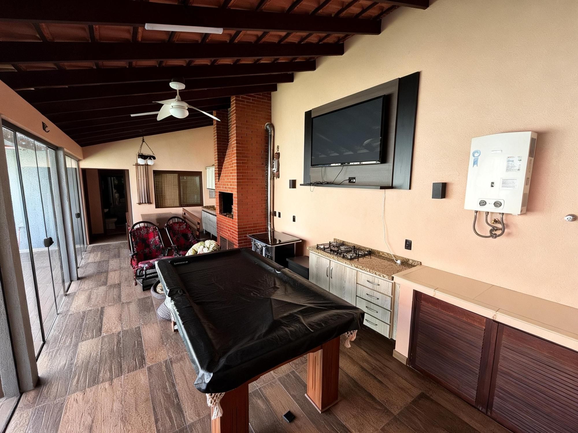 Área gourmet nos fundos com churrasqueira, mesa ampla, pia em mármore, fogão a lenha e mesa de sinuca em ambiente fechado com vidro. Piscina com pátio amplo. Dependência de empregada com possibilidade de uso como canil ou quarto de hóspedes, com ar-condicionado. Banheiro auxiliar com box de vidro e chuveiro elétrico.