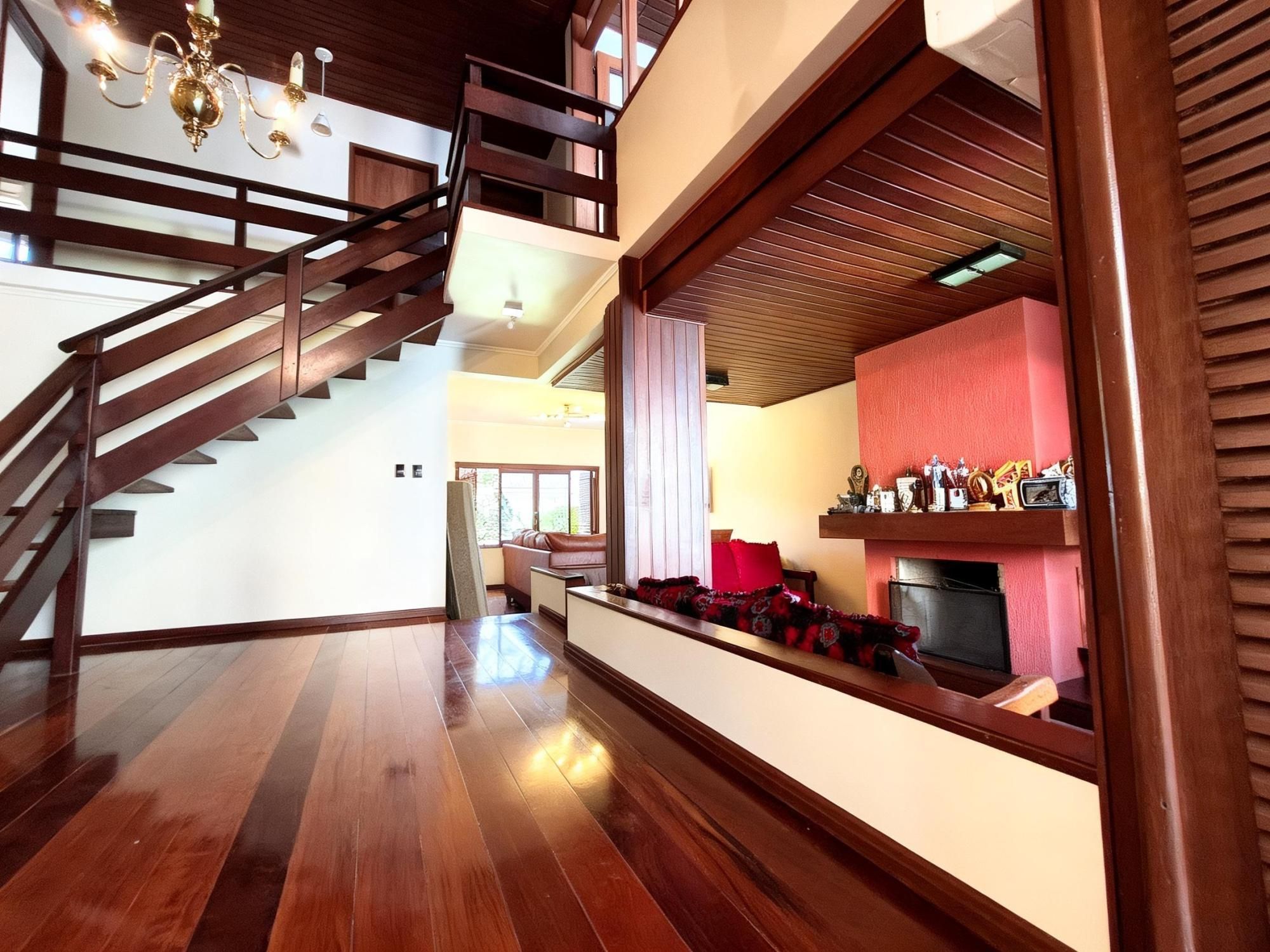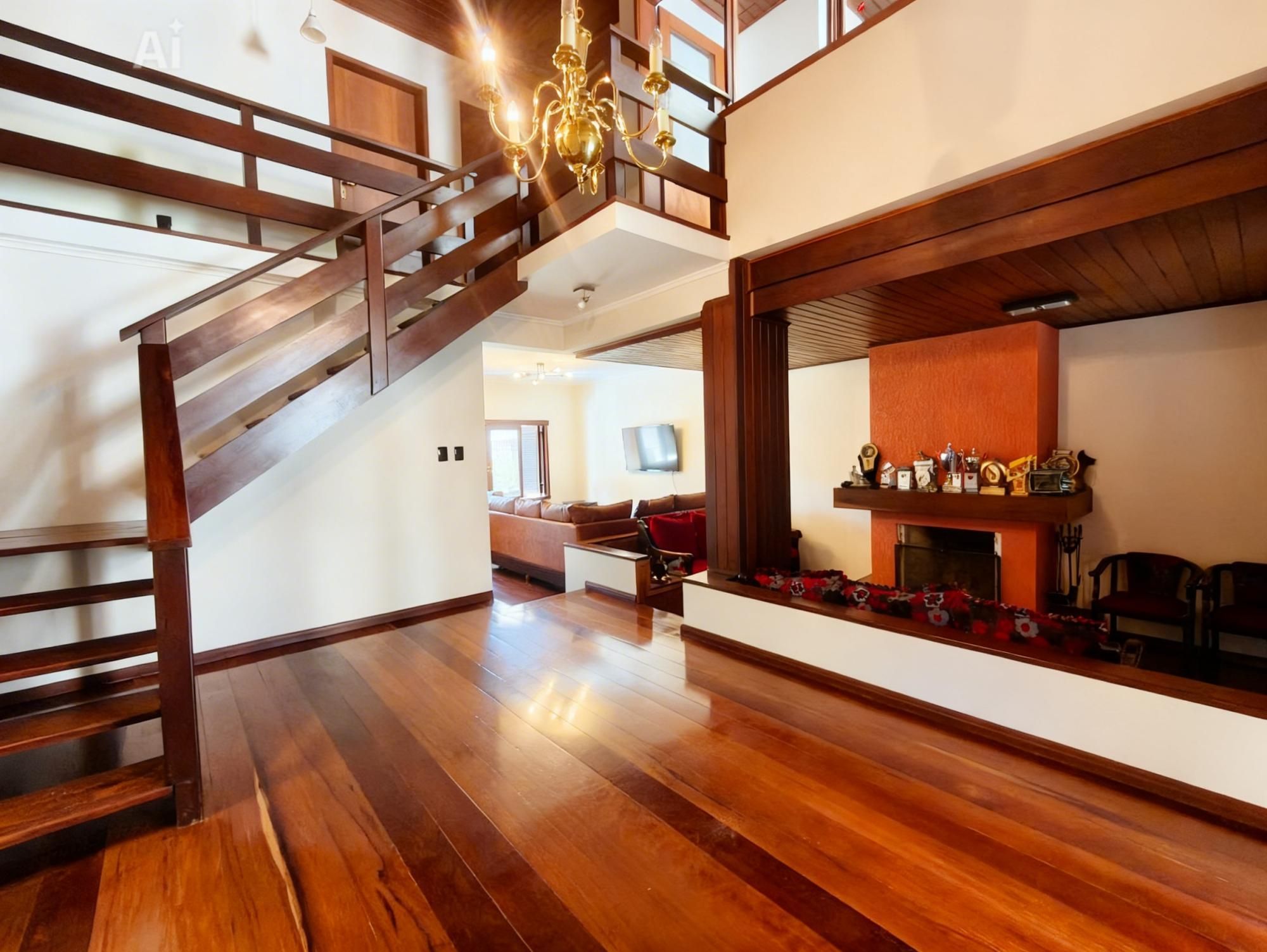 Casa com 4 quartos, sendo 1 suíte com closet, 1 escritório com possibilidade de fácil conversão em quarto, 2 vagas de garagem cobertas, 3 banheiros, 1 lavabo, lavanderia e dependência de empregada. Área gourmet com churrasqueira totalmente equipada. Sala de estar em dois ambientes com lareira. Sacada nos quartos. Cozinha ampla. Imóvel semi mobiliado, com água quente nos chuveiros e ar-condicionado. Sol da manhã na frente e sol da tarde nos fundos. Sistema de câmeras de segurança.