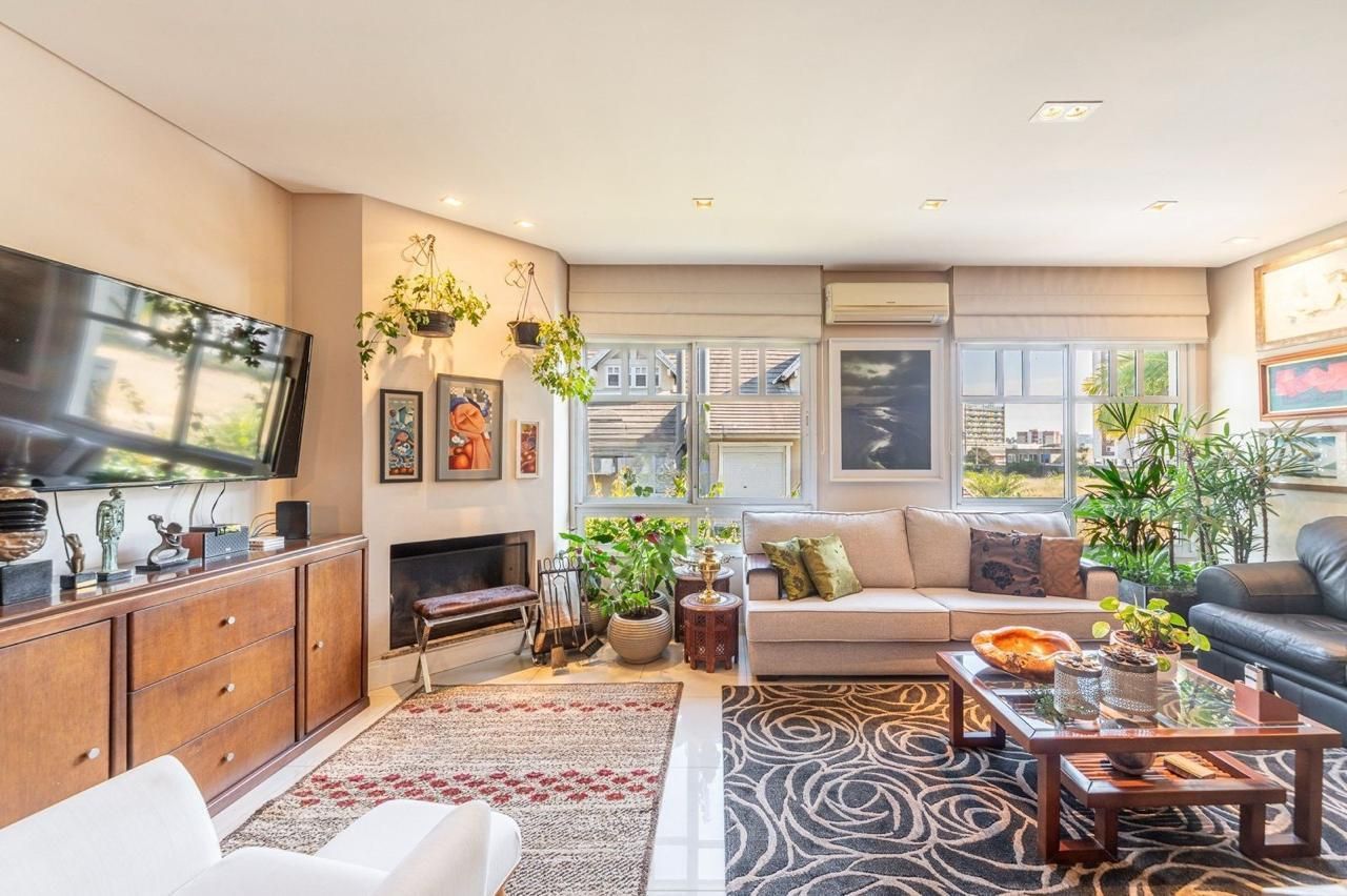 No pavimento térreo há um elegante hall de entrada, lavabo, living amplo com dois ambientes (sala de estar com lareira e sala de jantar), cozinha planejada, área de serviço fechada e área externa aberta. A casa conta com espaço previsto para a instalação de elevador.