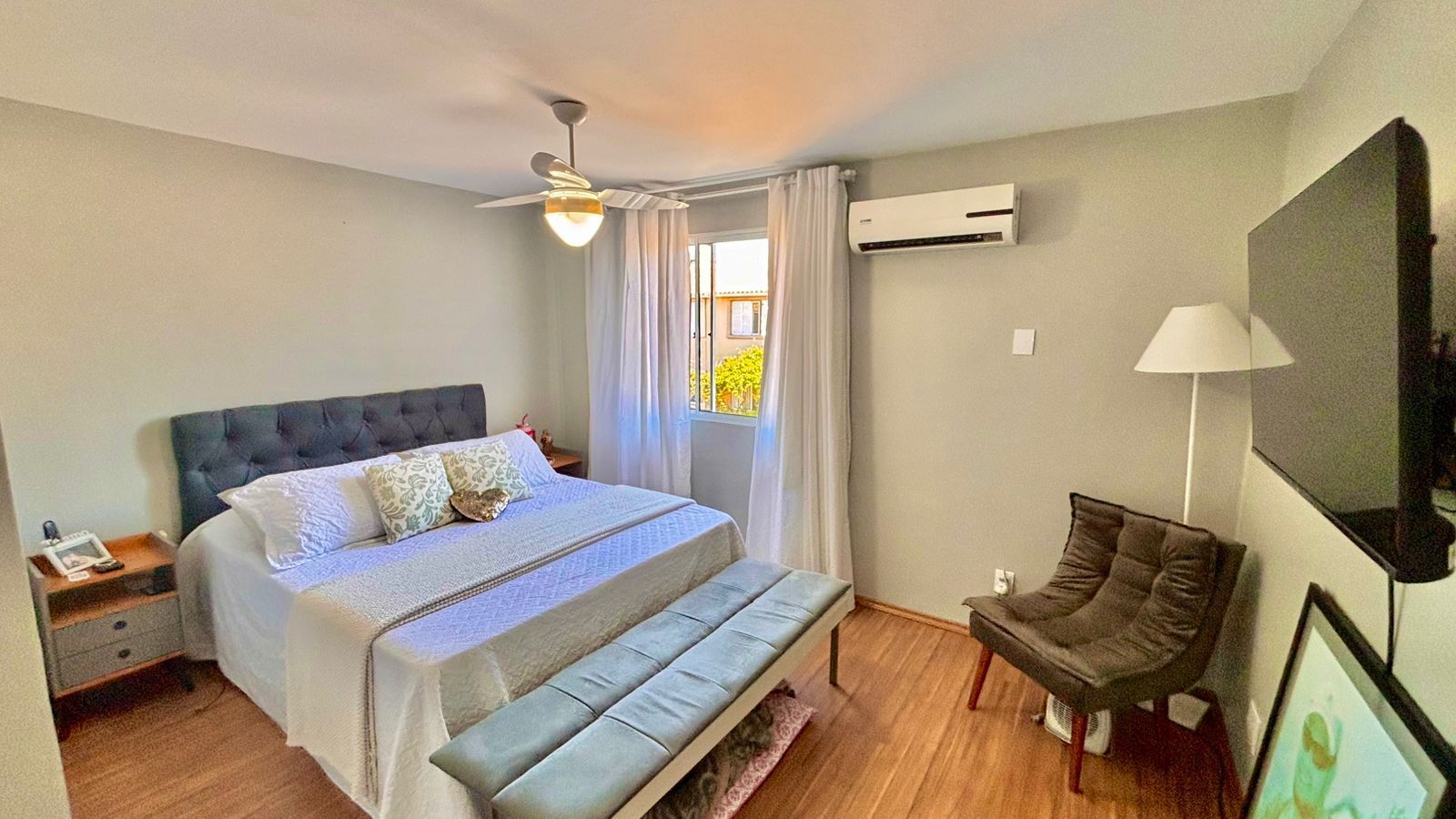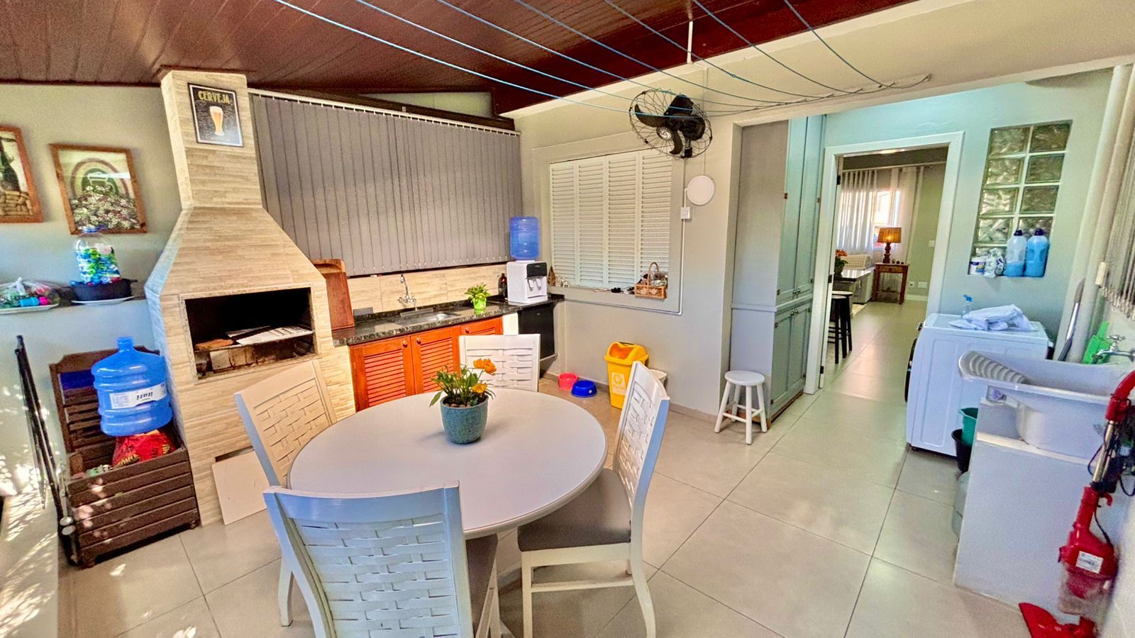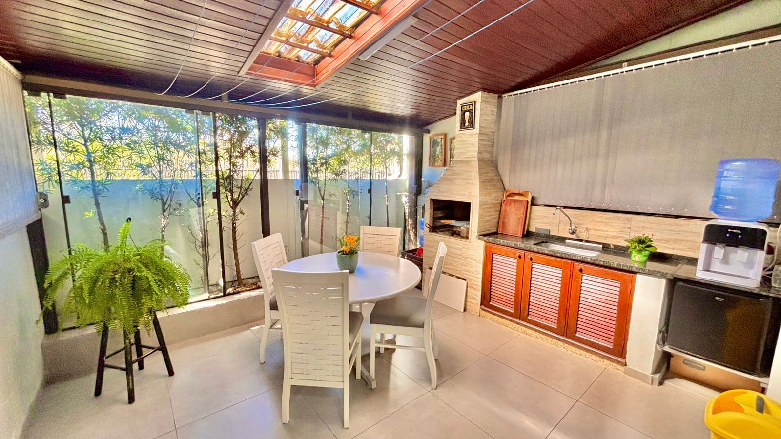 Nos fundos, um espaço fechado e confortável está integrado à casa, oferecendo uma churrasqueira e espaço para confraternizações. Esta área é uma verdadeira extensão da sala, proporcionando uma experiência única de lazer em casa e ampliando o espaço útil.