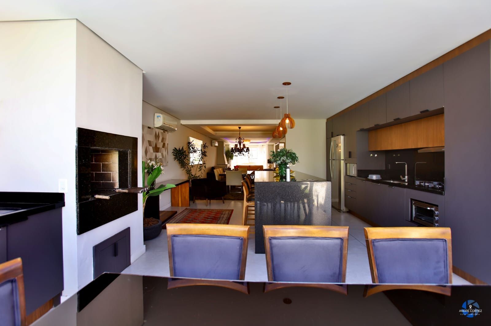 No primeiro andar: Sala de estar com lareira, lavabo, sala de TV, sala de jantar e cozinha planejada conectada à uma ampla área gourmet com churrasqueira.