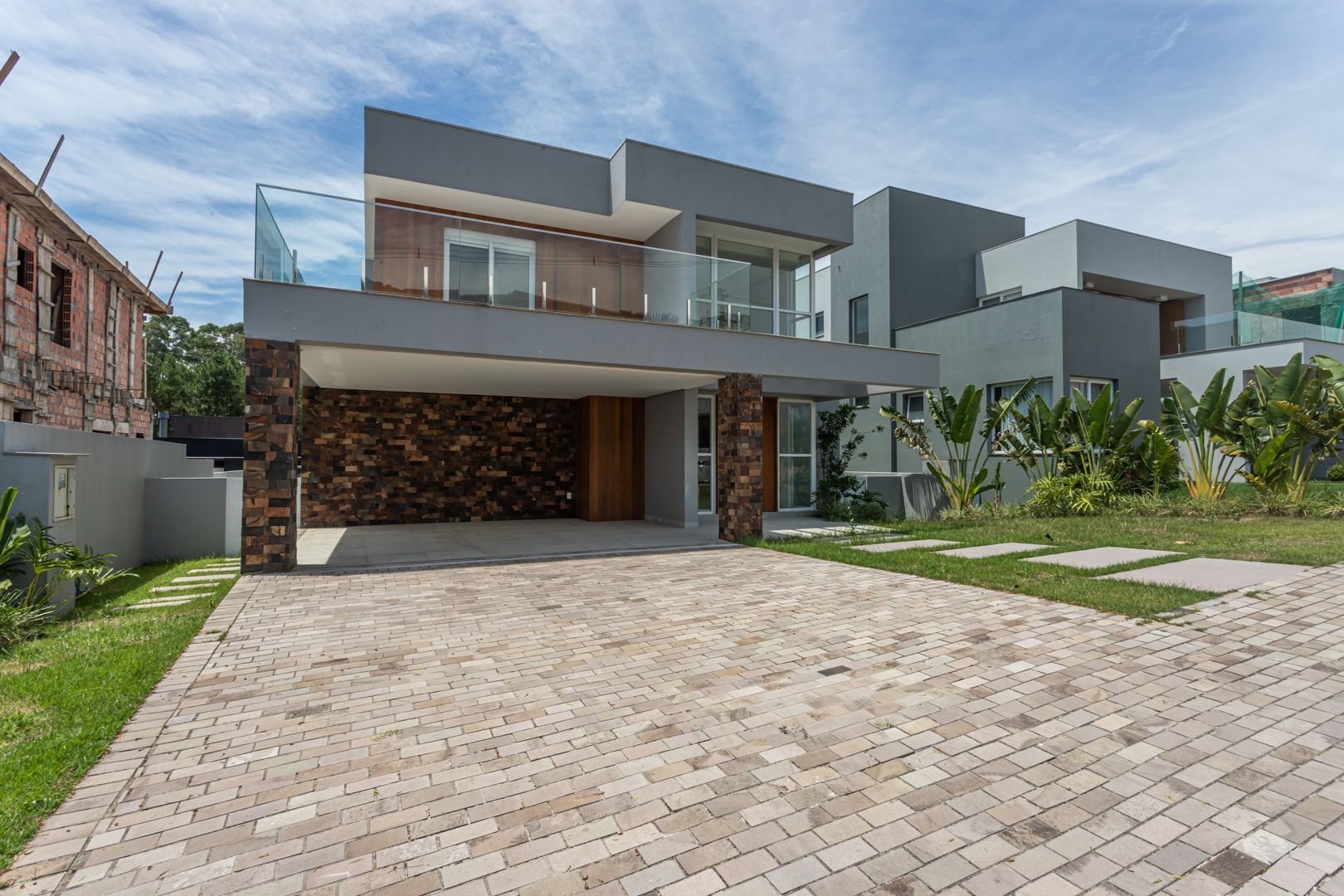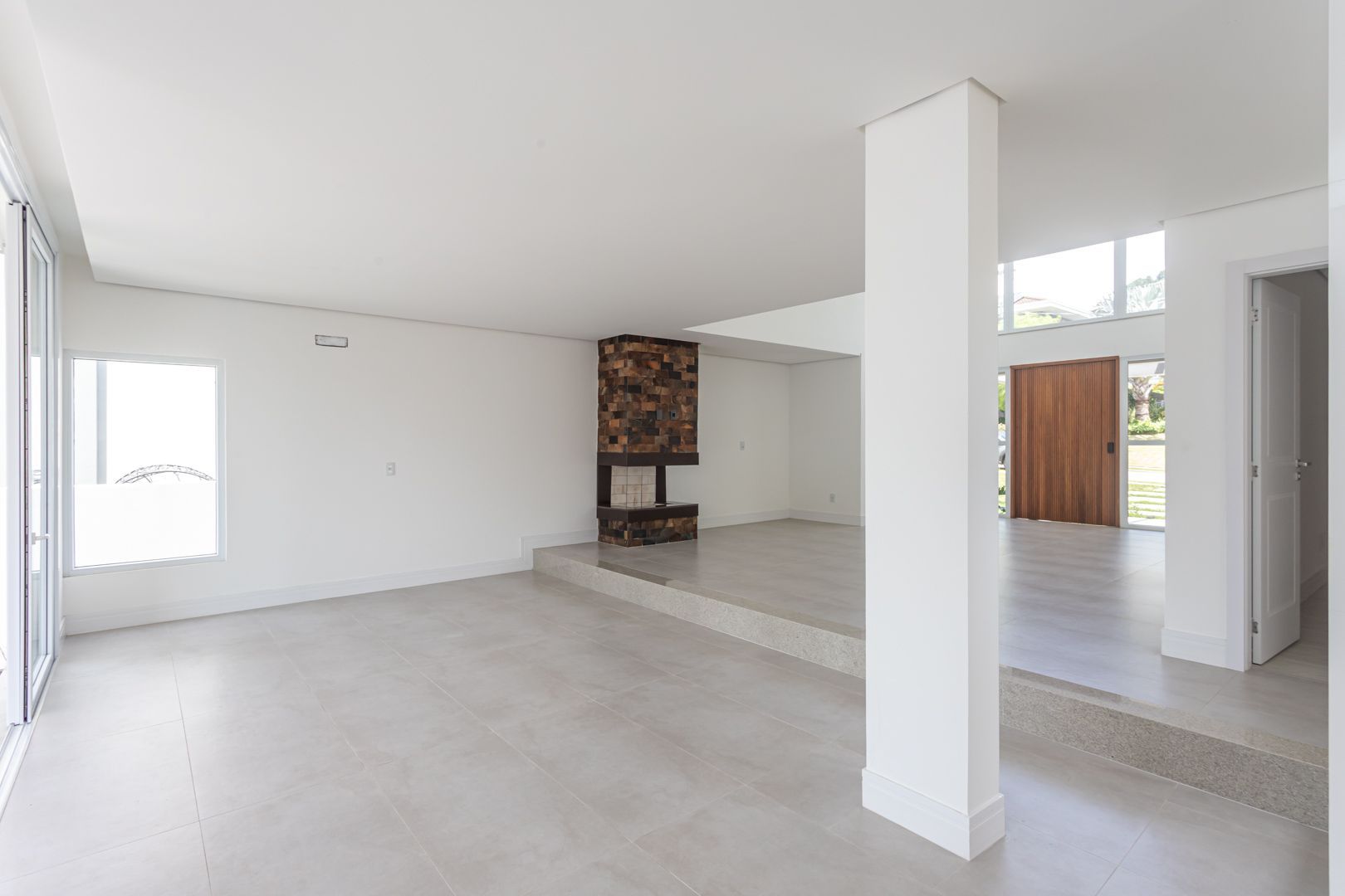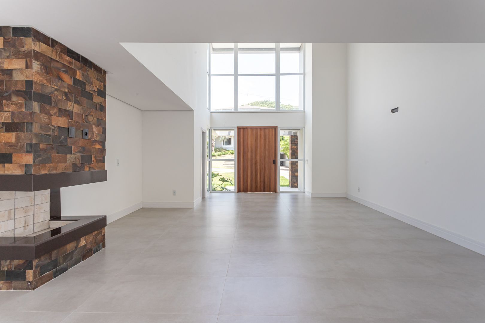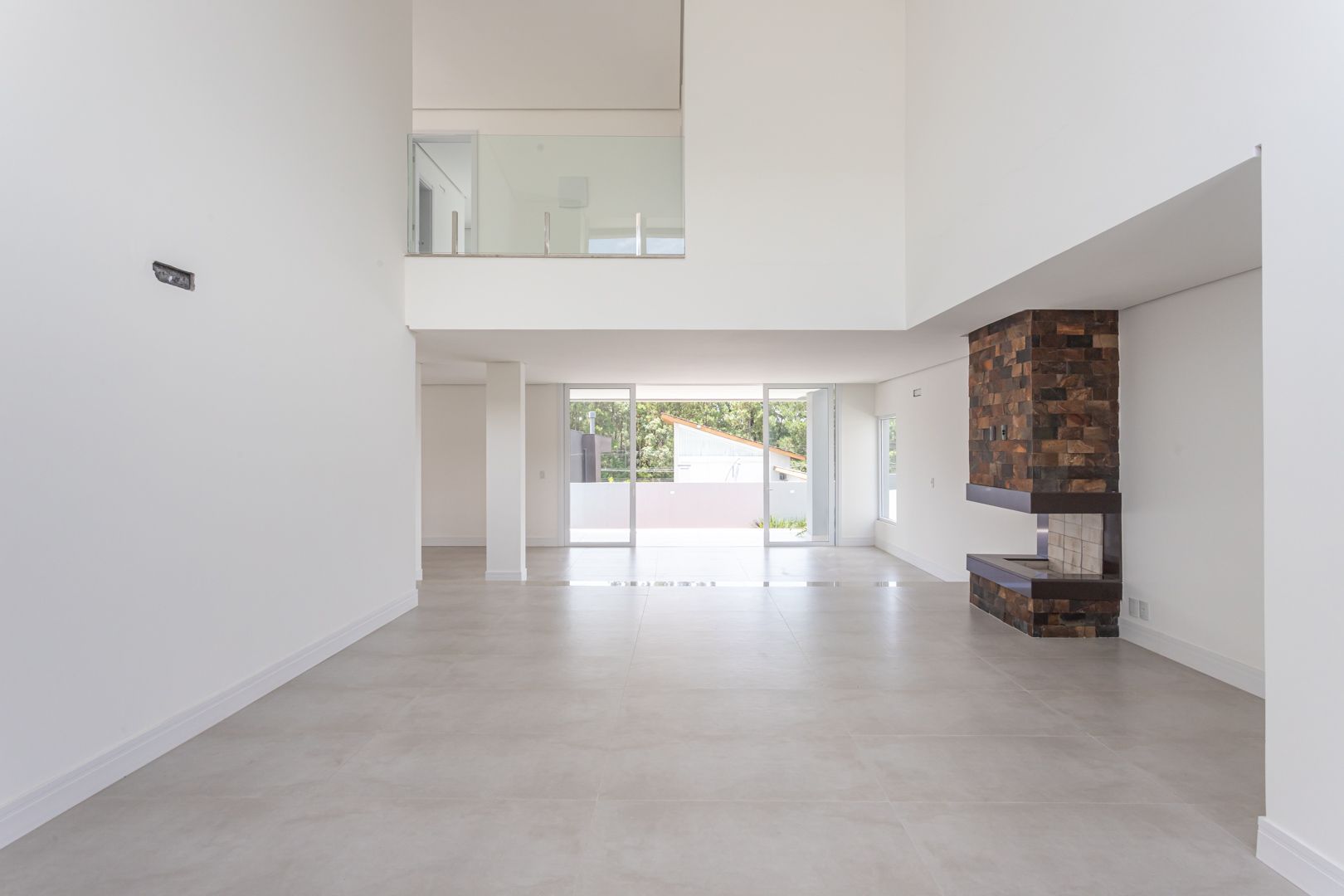 Com 484,92 m² de área privativa, a casa apresenta um living amplo e elegante, com possibilidade de até três ambientes, lareira, pé-direito elevado, piso em porcelanato e grandes esquadrias que garantem excelente iluminação natural e ventilação cruzada.